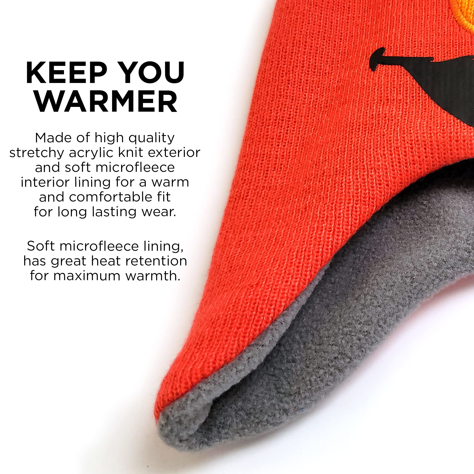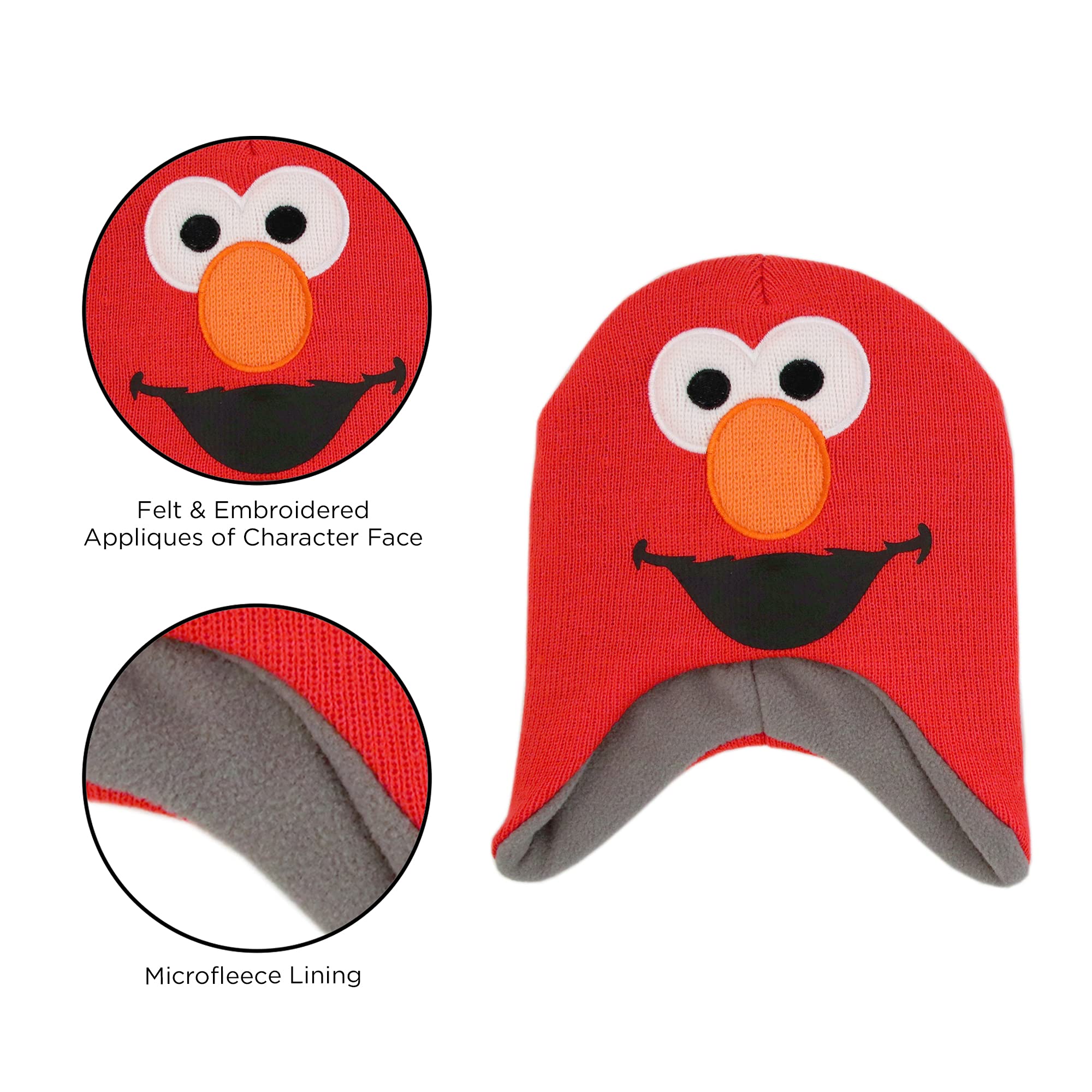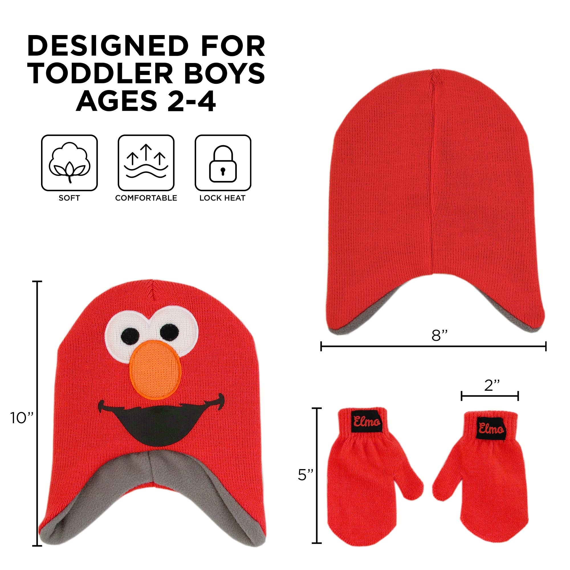 ADORABLE DESIGN: Matching Elmo pattern Winter Hat and toddler Mitten set with thick earflaps, and features Elmo character patch embroidered on the front. Matching Blue/Orange Toddler Mittens with a Blue/Orange cuff features an Elmo gripper print design, Great coverage for Head, Ears and their little cute Hands.
