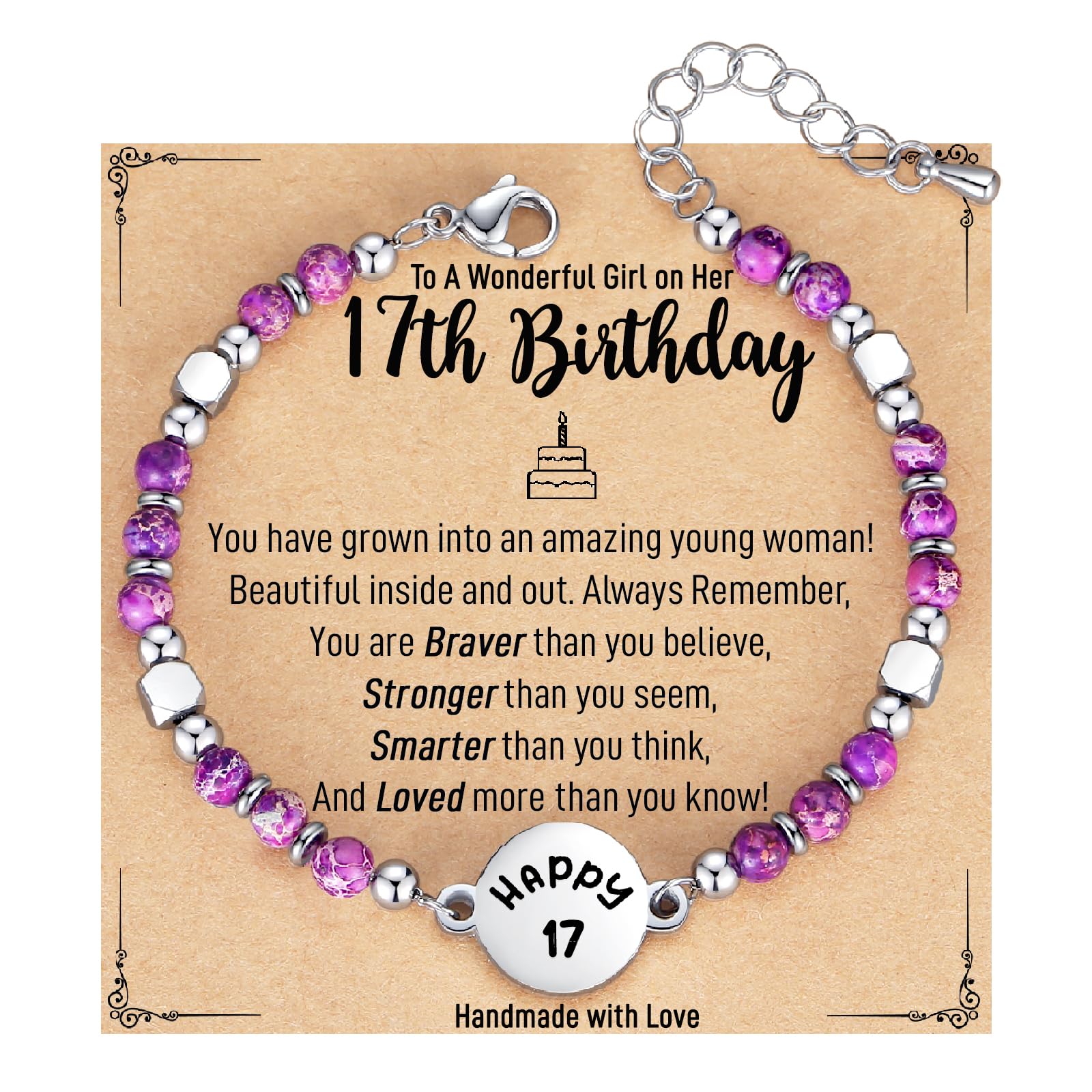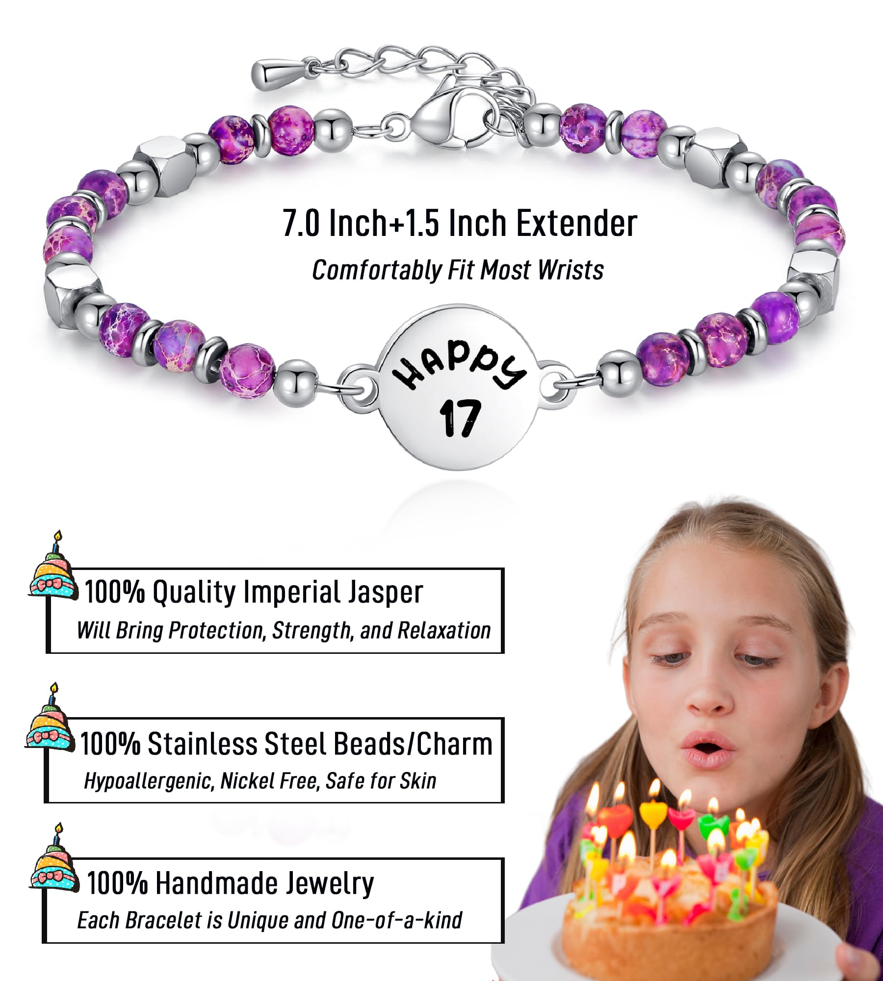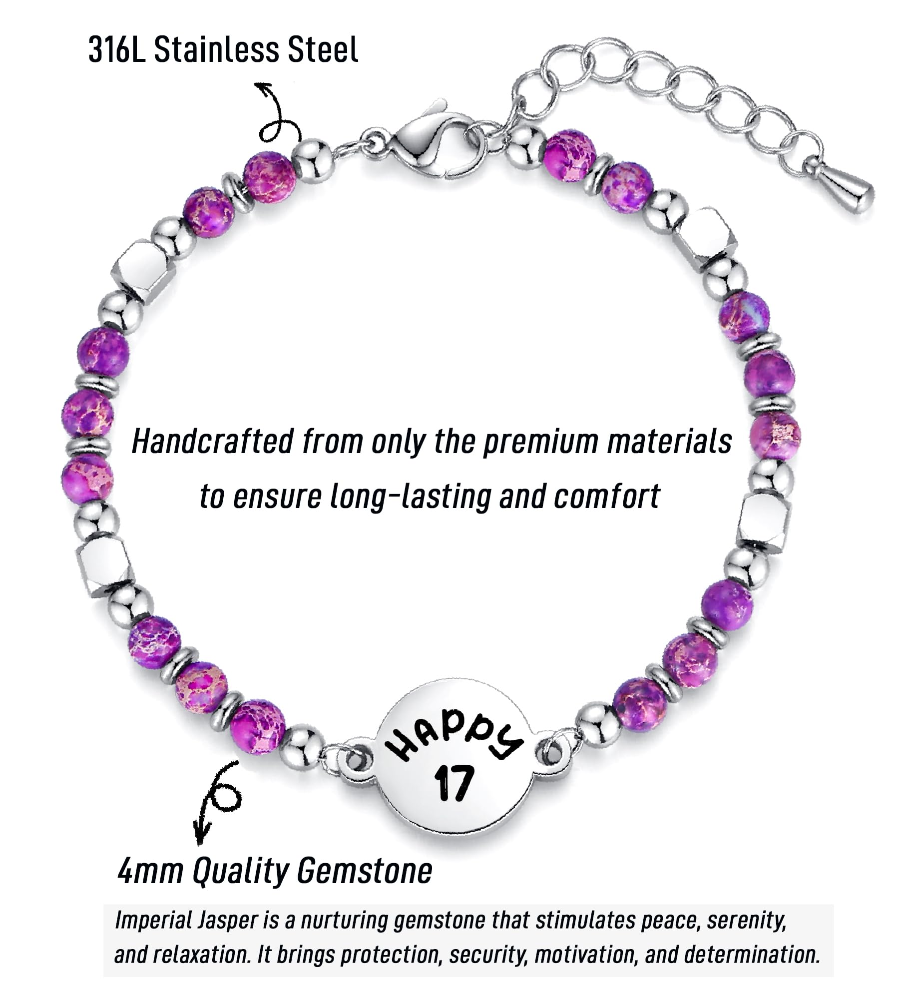 Birthday Bracelet for 17 Year Old Girl: Combination of tiny gemstones, stainless steel beads, and sweet "Happy 17" charm, this pretty bracelet makes the perfect 17th birthday gifts due to its unique design and natural stone meaning. Imperial Jasper is said to bring peace, serenity, healing, and strength to your young girl. Celebrate her turning 17 with this bead bracelet, remind the amazing young woman always remember that she is brave, strong and smart, and beautiful.