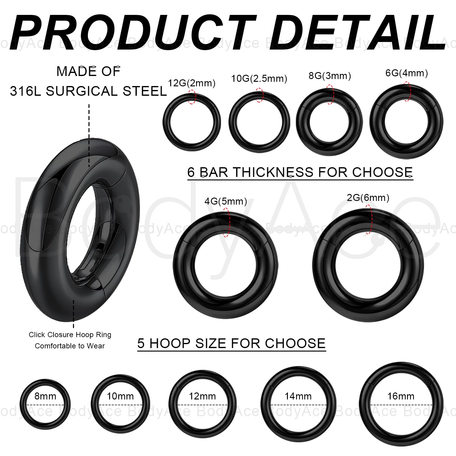๐ฆNose Rings Hoops Size๐ฆ Septum jewelry hoop size: 12G(2mm), 10G(2.5mm), 8G(3mm), 6G(4mm), 4G(5mm), 2G(6mm). Nose hoops inner diameter: 16mm, 14mm, 12mm, 10mm, 8mm. Please check the diameter carefully according to the Size Chart. Select the most suitable size hoop nose ring for yourself.