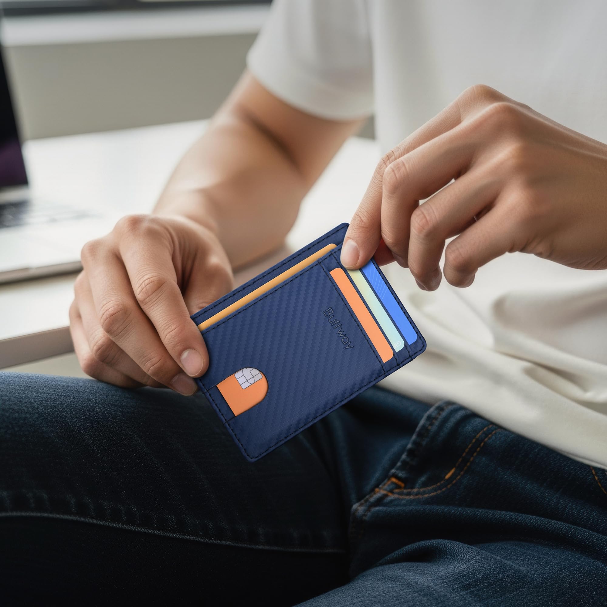 Description Most RFID blocking sleeves are bulky and difficult to carry when traveling, but this one has been designed with the modern traveler in mind. Extra slim, lightweight and perfectly portable. our RFID blocking minimalist wallet is preferred among men and women travelers looking to lighten their load while still protecting their identity, credit cards, passport cards, licenses, etc. The Buffway Wallet Features 8 Slot Compartments - Plenty of Room! - 4 slots for holding credit cards, debit cards, bank cards, passport cards - 1 clear window slot with finger glide for ID, work badge or driver's license - 2 side-slip pockets for business cards, membership cards, train cards, etc - 1 middle pocket for cash bills, tickets, receipts, coupons, notes and so on Minimalist Slim Wallet Specifications: 3 1/8 inch x 4 7/16 inch (1/9 inch thickness without contents) Extremely Thin and Lightweight: 1.05oz About our integrated RFID blocking technology: We want to make sure your identity is safe when out traveling, shopping and getting things done. This is why we've equipped our synthetic leather minimalist wallet with a protective layer that blocks 13-14Mhz electronic signals trying to retrieve your personal information. Thieves use these signaling devices to steal credit card numbers, expiration dates, identifiable details and so much more. Using an RFID blocking wallet like ours is the easiest and most affordable way to ensure your pertinent info is safe and secure. Though it effectively guards against common radio frequencies, our id window minimalist wallet doesn't have the ability to block 125 KHz signals such as those for hotel room keys and access cards.