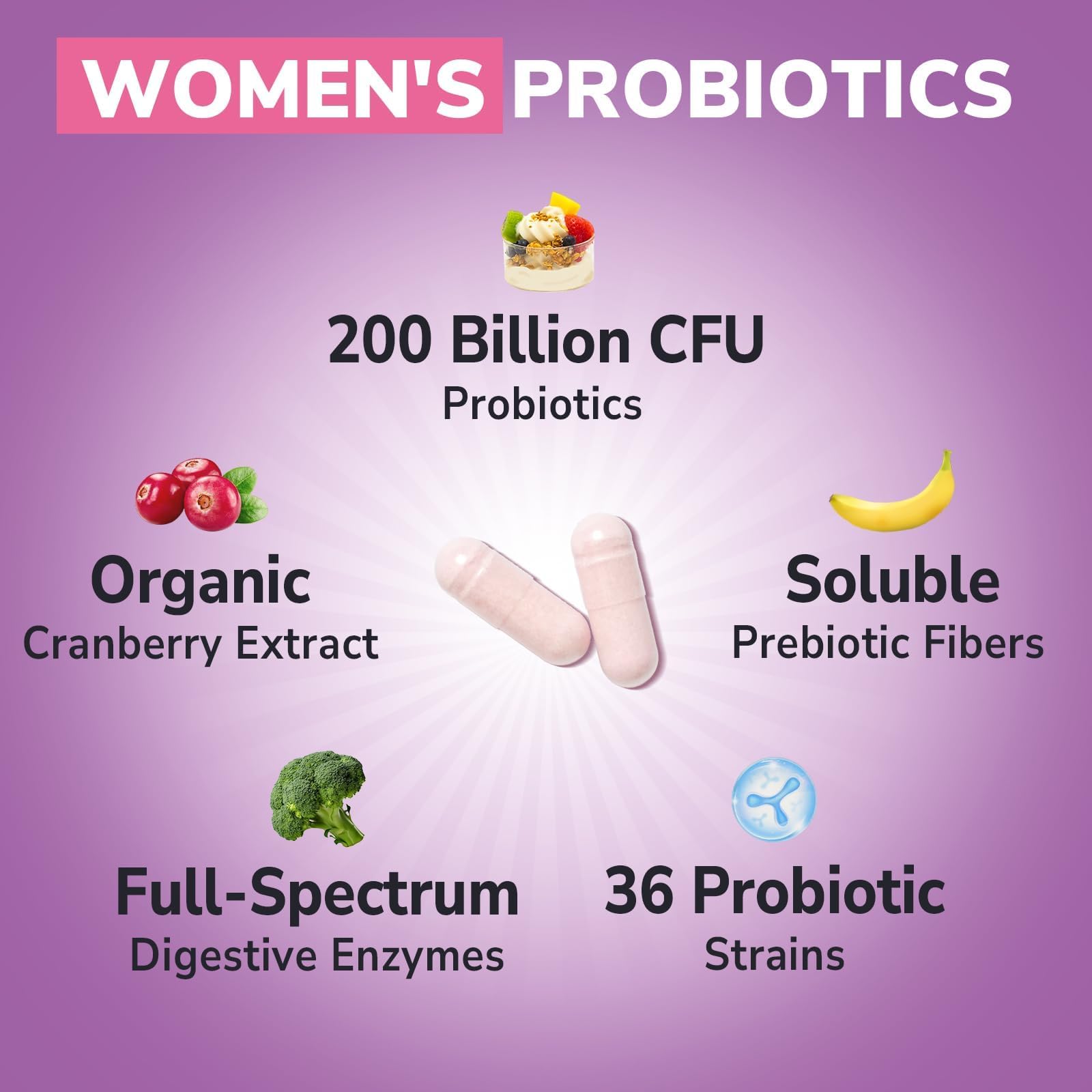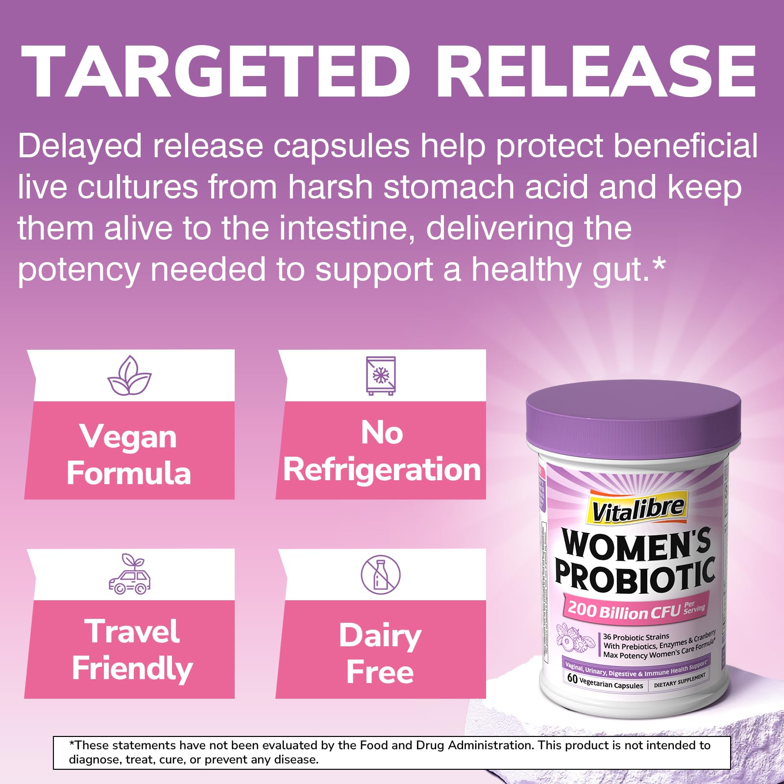 Vitalibre Women's Probiotics 200 Billion CFU contains 200 billion live cultures per serving from 36 full-spectrum strains, plus cranberry extract to support vaginal & urinary health, and immune function.* Prebiotics and digestive enzymes team up to aid digestion and ease bloating.* Taking Vitalibre Women's Probiotics 200 Billion CFU Daily May Help: Restore vaginal & gut flora balance* Maintain urinary tract health* Support strong immune function* Offer relief from uncomfortable itching and odor* Why Vitalibre: 200 Billion CFU Per Serving 36 Probiotic Strains With Cranberry, Prebiotics & Enzymes Easy-to-Swallow Capsule Vegan-Friendly Shelf Stable Acid-Resistant Technology No Unnecessary Fillers or Additives Non-GMO
