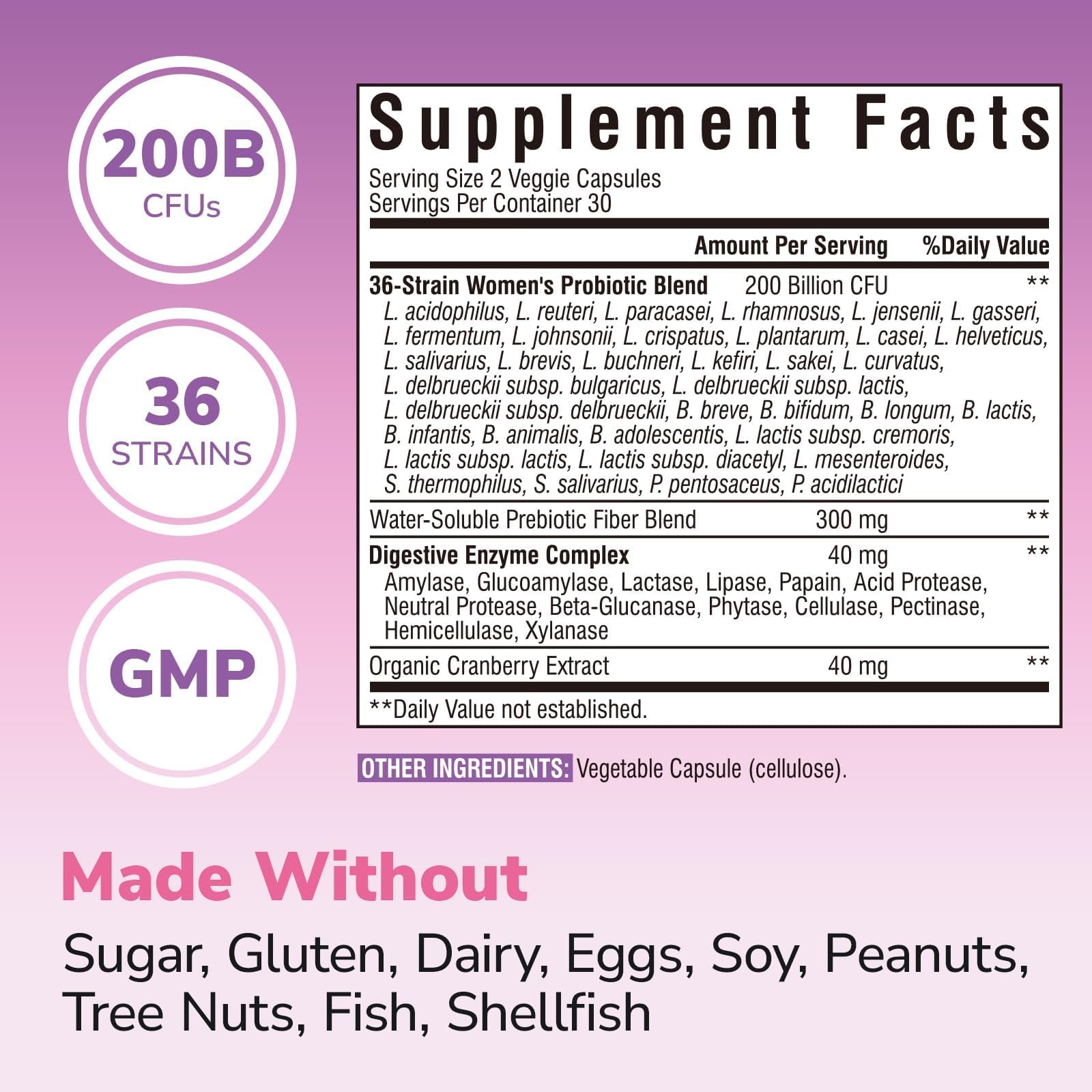 Max Potency Feminine Care*: During and after times of compromise, Women's Probiotics 200 Billion CFU is here to get your vagina back on track.* It features a whopping 200 billion live cultures per serving from 36 full-spectrum strains.* Enhanced with cranberry extract, prebiotics, and enzymes, this formula is your go-to for fast, targeted relief — which means less itching and discomfort, a fresher scent, and a stronger line of defense.*
