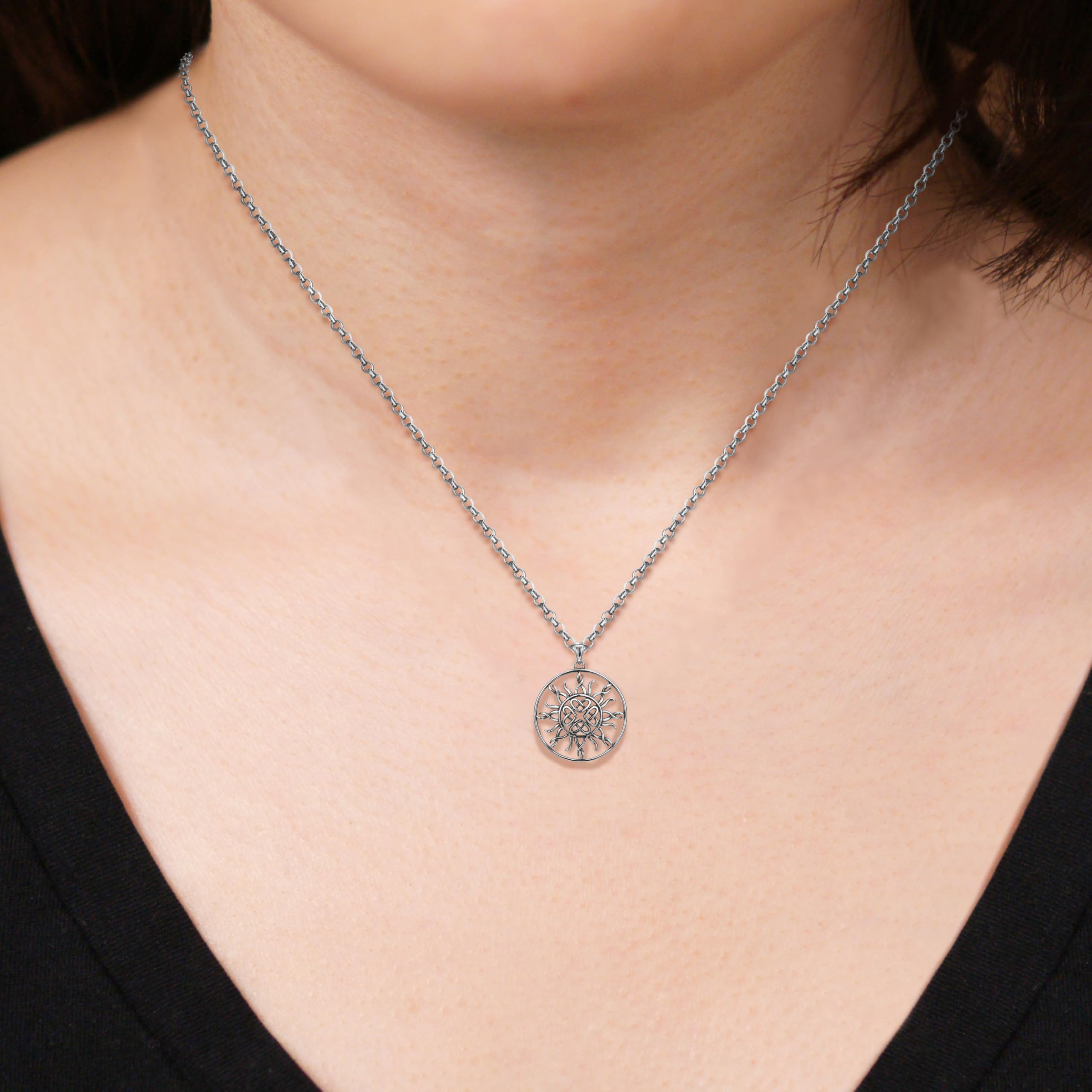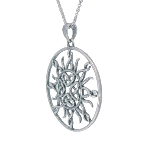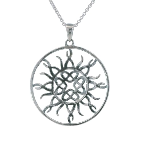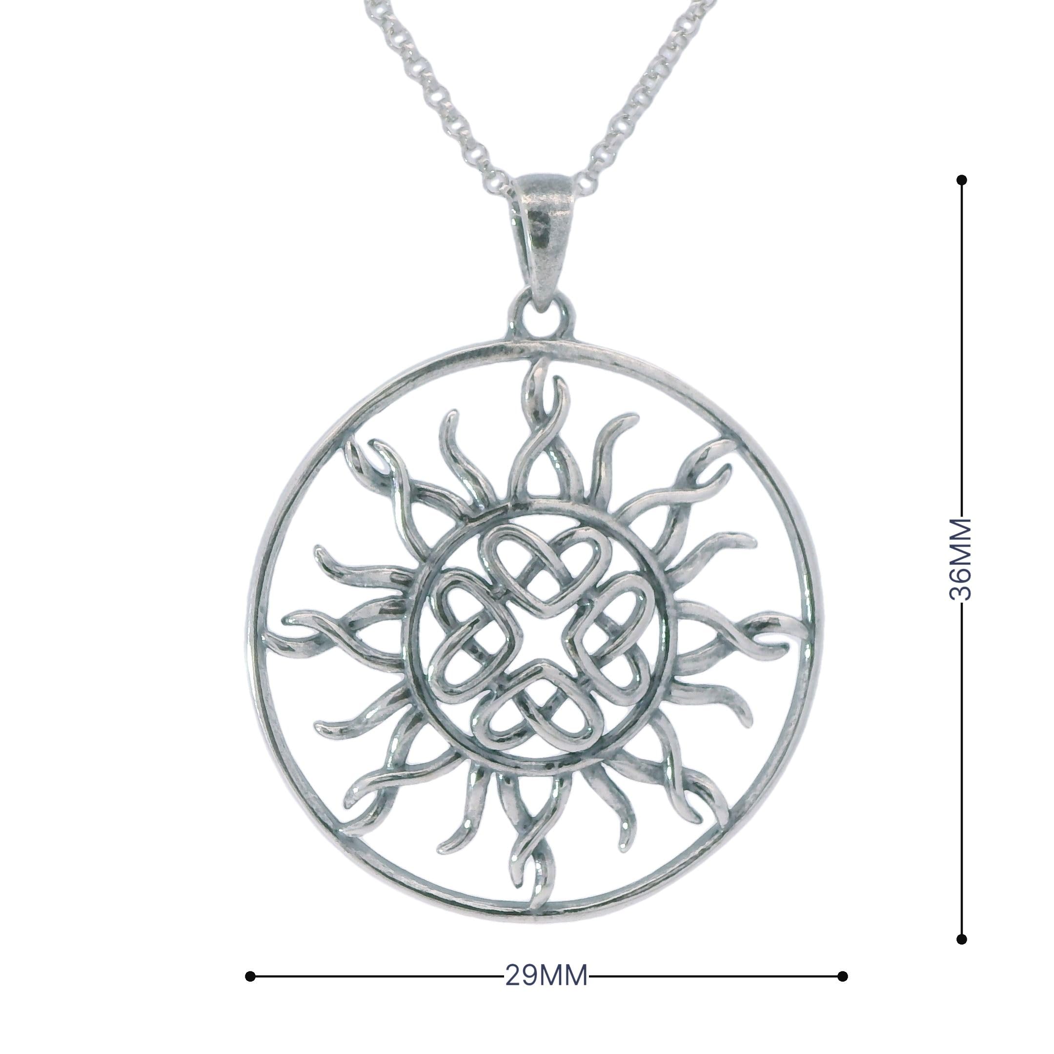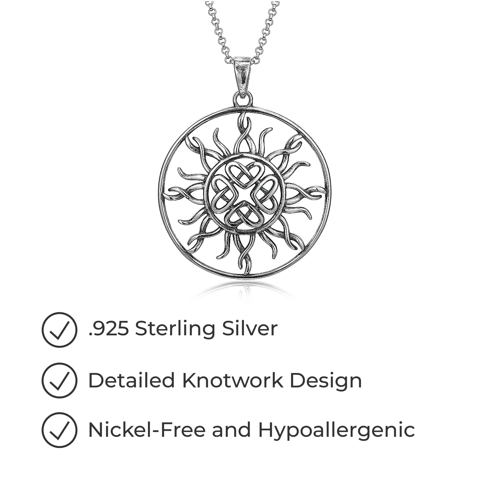 Celtic love knot pendant necklace featuring sun with twisting rays and hearts in antiqued, oxidized sterling silver