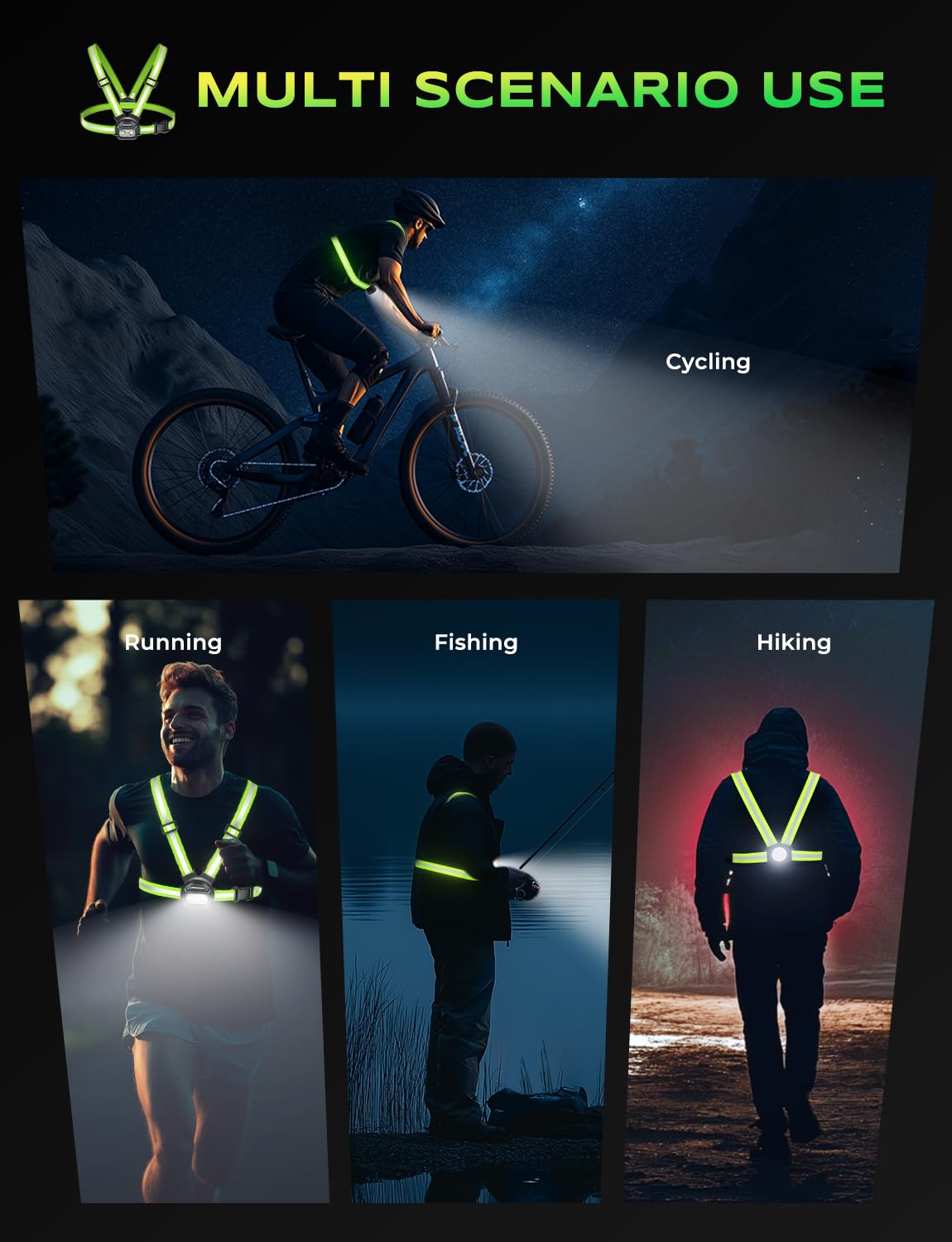 【Comfortable & Adjustable Fit】 Enjoy customized comfort with adjustable buckles and elastic straps accommodating shoulder widths of 12-23 inches (30-60cm) and waist sizes of 31-51 inches (80-130cm). This running light vest is designed wider dual-shoulder strap, which distribute weight evenly and enhances stability and comfort, perfectly resolving the head fatigue caused by traditional headlamps during long-distance running.