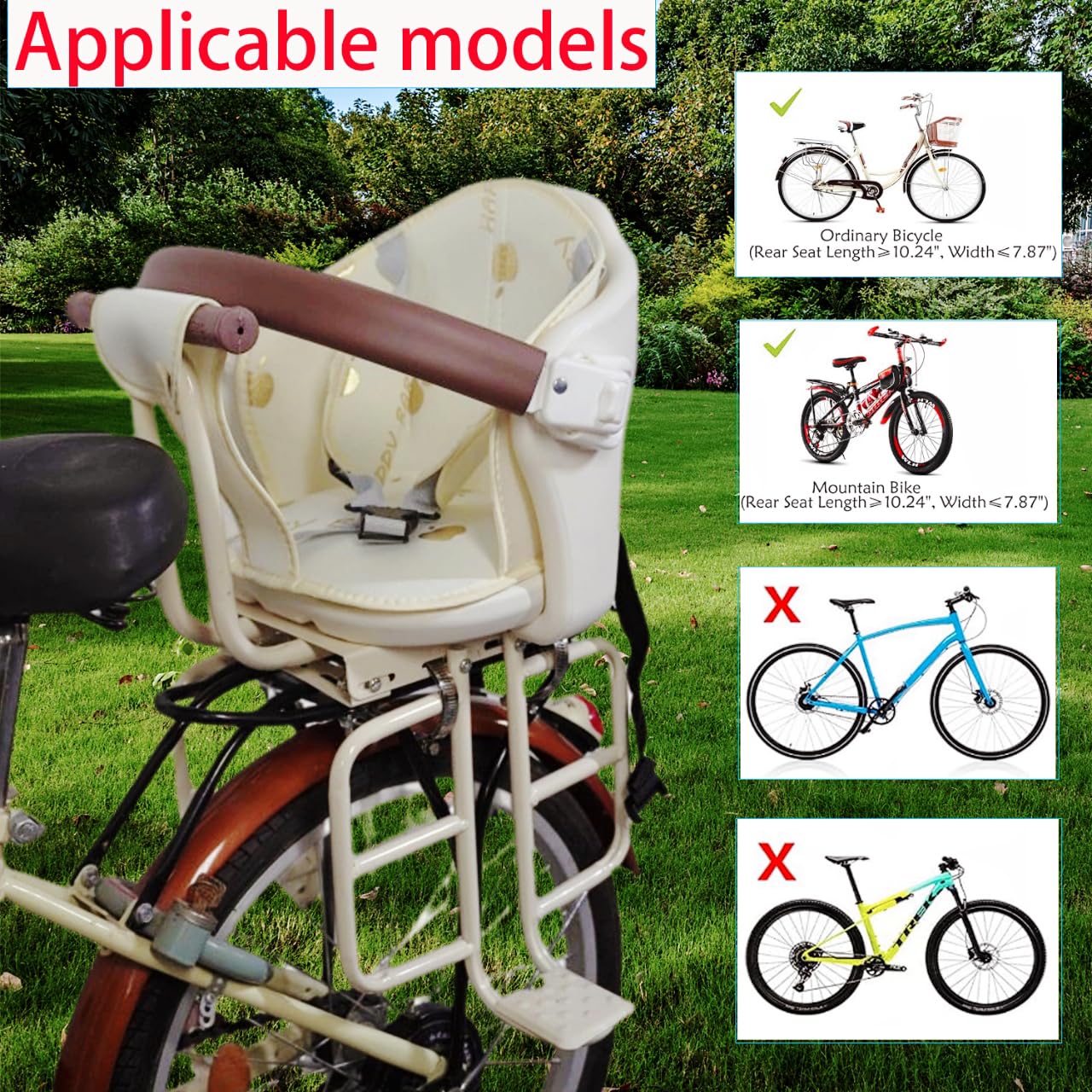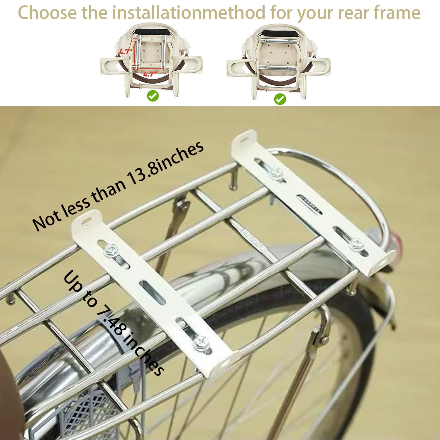 【Easy to Install& Removable】The rear seat of the bicycle is easy to install and remove with our installation tools and instructions.The length of the bicycle rear frame must be greater than 10.24 inches, and the width must be less than 7.87 inches. So It suitable for all types of bikes with a rear rack, such as electric bikes. Note:For your safety, please ensure you have tightened the screws and double checked them before cycling.