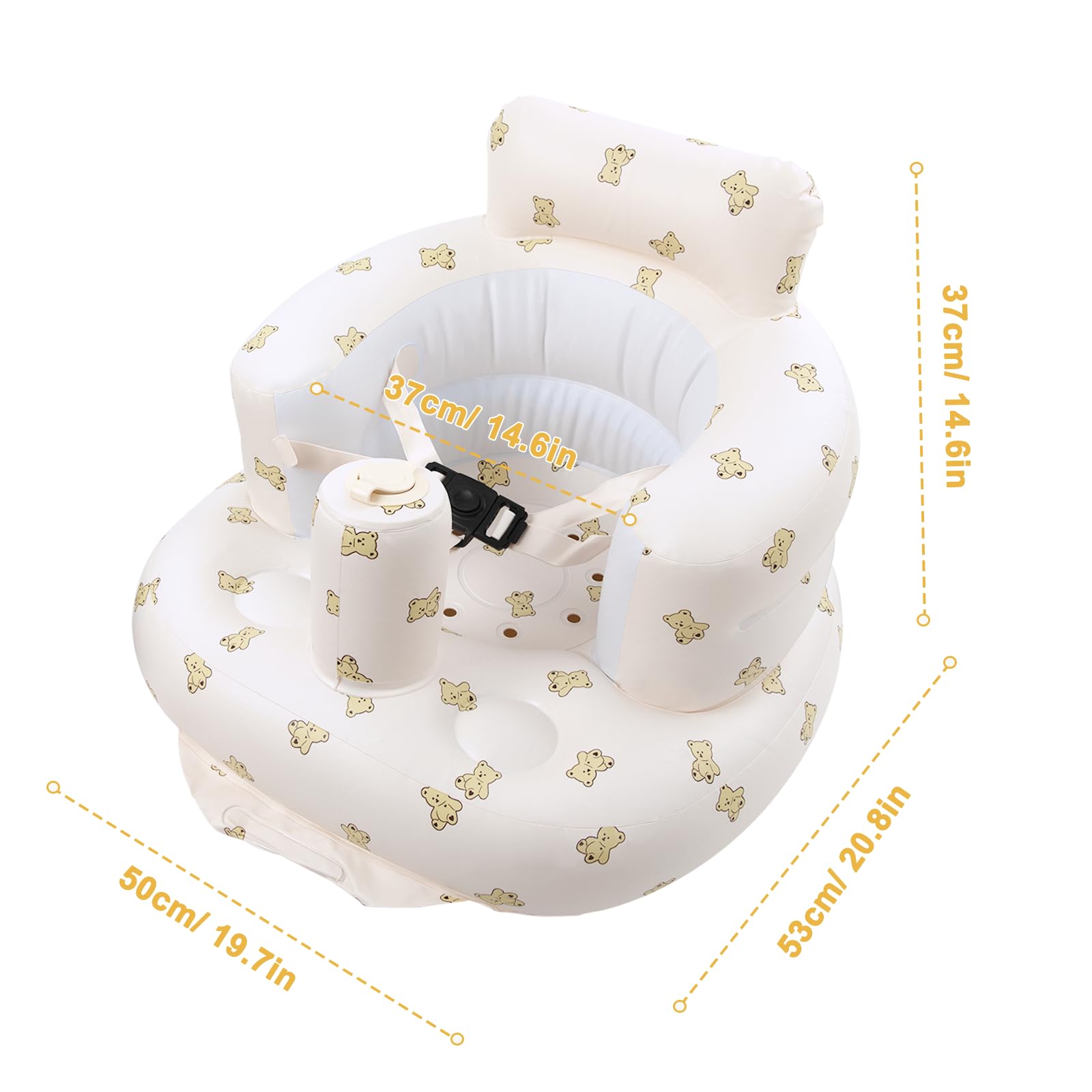 Harness Design: This infant baby seat is equipped with a three-point safety harness, which could effectively prevent baby from falling forward. With this inflatable baby seat, there is no need to keep your eyes on your baby always. Meanwhile, the removable back strap allows you to secure it to chair for easy feeding.