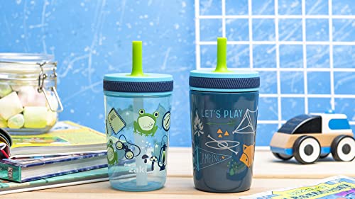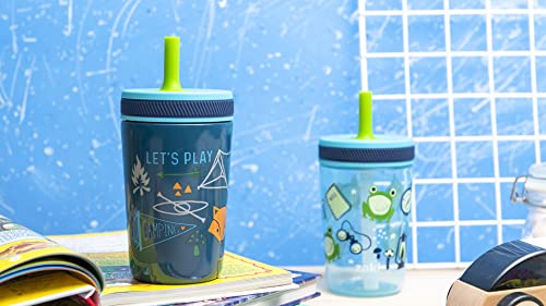 This leak-proof tumbler set from Zak Designs makes hydration fun for kids! Durable Materials: The set includes two different tumblers, one made from plastic and one made with double-wall stainless steel; both are durable enough to use every day. The comfortable straws are made from silicone, and everything is completely BPA free. Leak-Proof Straw: The straw has a built-in valve that allows liquid to flow when drinking and prevents spills when the tumbler is tipped over. It's perfect for travel or for young children graduating from sippy cups. Hydrate Anywhere: Choose lightweight plastic or double-wall stainless steel, whichever suits the situation! The tumblers won't splash or leak, making them ideal to take on the go. At home, you don't have to worry about spills around papers or electronics, and drinks stay easily accessible through the straw. Specifications: 1 plastic tumbler (15 oz), 1 stainless steel tumbler (12 oz), 1 additional sipper and straw. Made of durable plastic, stainless steel, and silicone. BPA-Free - Zak is committed to safety. Lids and plastic tumbler are top rack dishwasher safe, hand wash stainless steel tumbler; do not microwave. 2 Designs: Campout and Camping.
