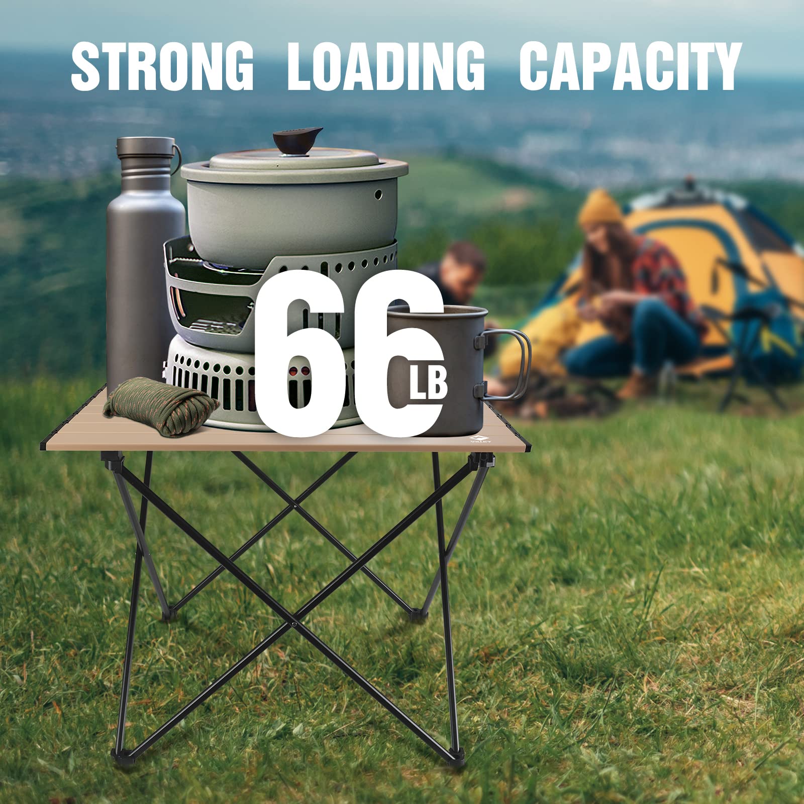 Sturdy Construction for High Load Capacity: This portable table is made of heavy-duty aluminum. The legs will not fold, bend, or fall off thanks to the stable foot caps, allowing it to be used on different terrains without the risk of tipping over. The triangular frame and sturdy joints enable the foldable camping table to support up to 66 pounds of weight. So you can use this table for picnics or cooking with complete confidence