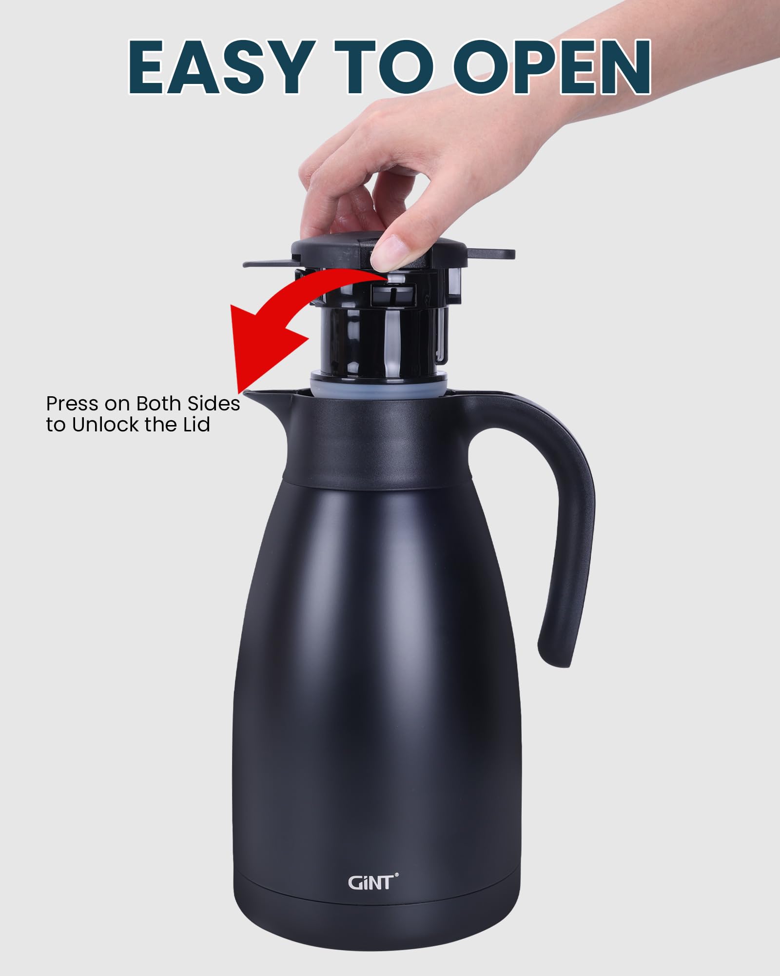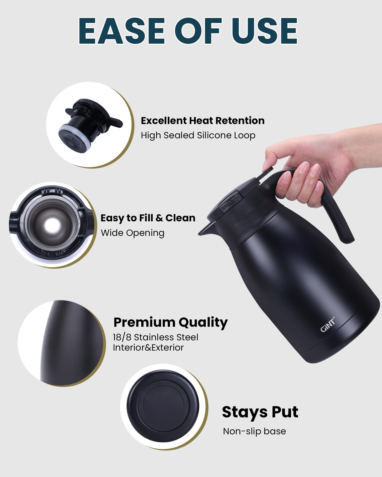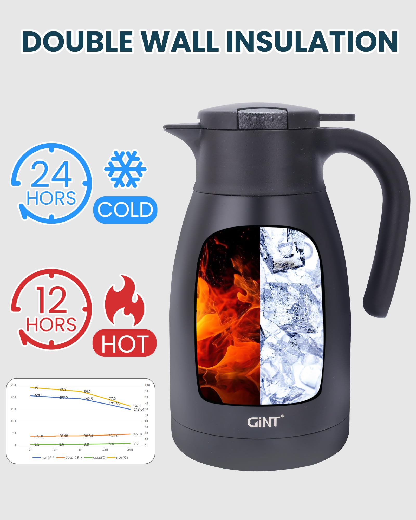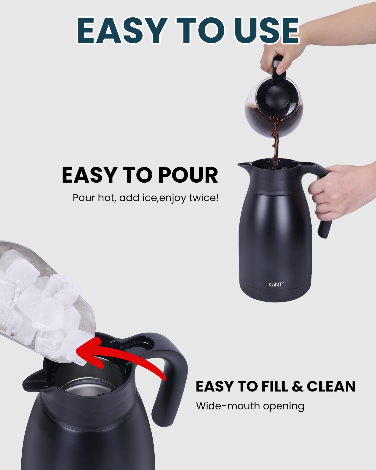 USER FRIENDLY: GiNT 51oz thermal carafe features extra wide top opening, easy for cleaning and adding ice cubes; Simple-push button enables single-hand pouring without leaking, dripping or spilling; Ideal used for bedside, restaurant, office, party, camping, travel insulated coffee carafes.