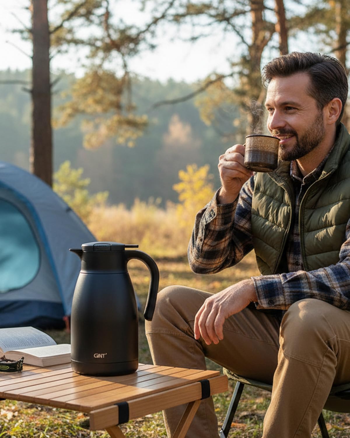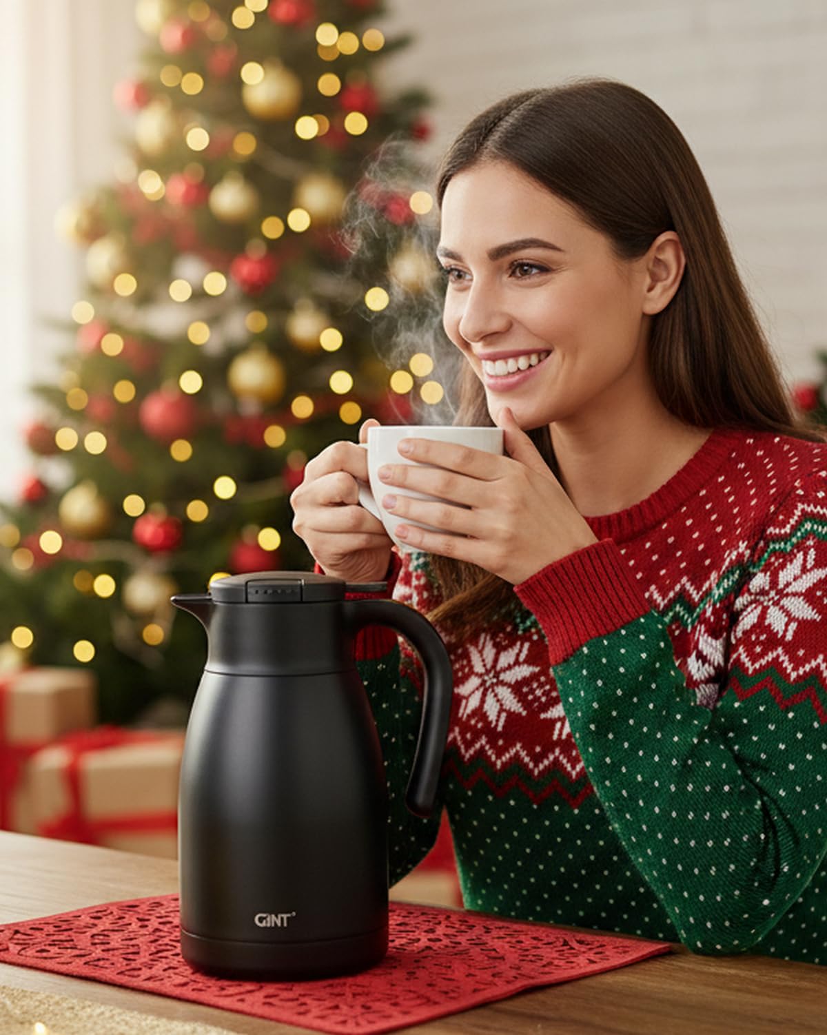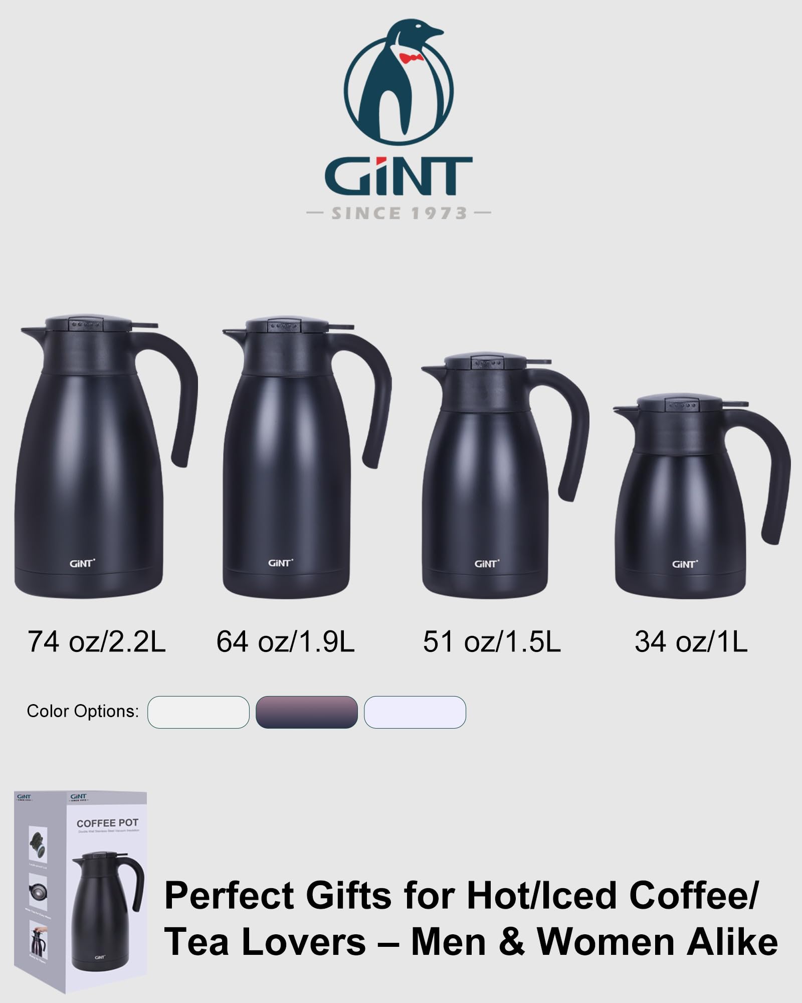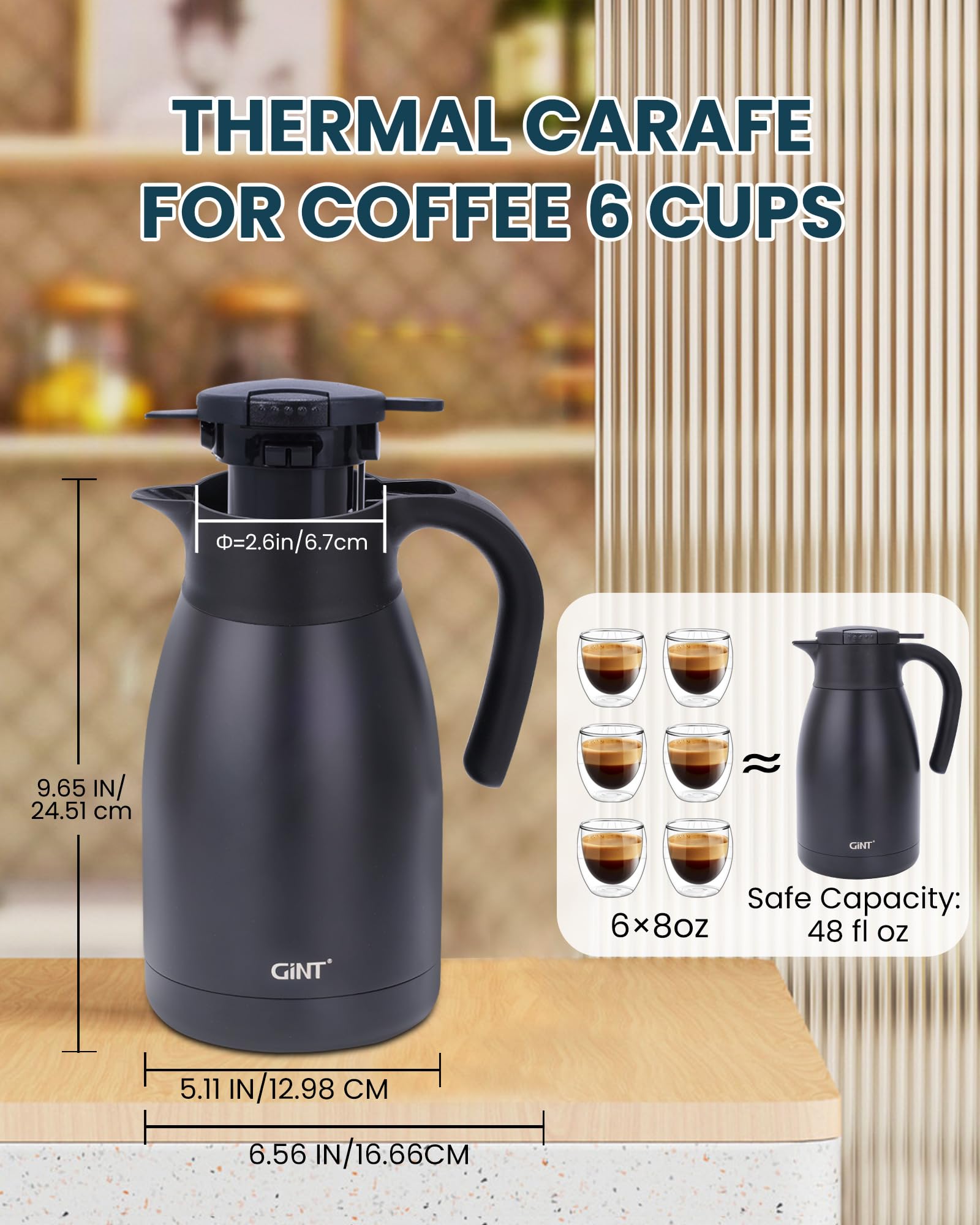 USER FRIENDLY: GiNT 51oz thermal carafe features extra wide top opening, easy for cleaning and adding ice cubes; Simple-push button enables single-hand pouring without leaking, dripping or spilling; Ideal used for bedside, restaurant, office, party, camping, travel insulated coffee carafes.