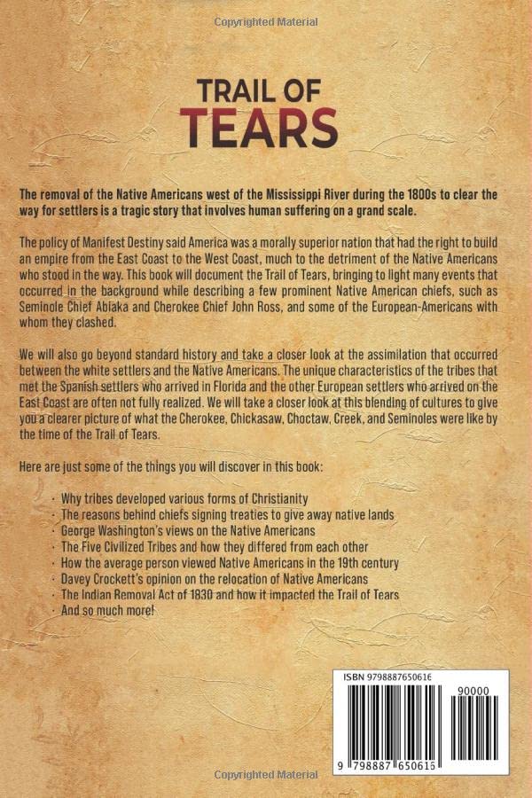 The removal of the Native Americans west of the Mississippi River during the 1800s to clear the way for settlers is a tragic story that involves human suffering on a grand scale. The policy of Manifest Destiny said America was a morally superior nation that had the right to build an empire from the East Coast to the West Coast, much to the detriment of the Native Americans who stood in the way. This book will document the Trail of Tears, bringing to light many events that occurred in the background while describing a few prominent Native American chiefs, such as Seminole Chief Abiaka and Cherokee Chief John Ross, and some of the European-Americans with whom they clashed. We will also go beyond standard history and take a closer look at the assimilation that occurred between the white settlers and the Native Americans. The unique characteristics of the tribes that met the Spanish settlers who arrived in Florida and the other European settlers who arrived on the East Coast are often not fully realized. We will take a closer look at this blending of cultures to give you a clearer picture of what the Cherokee, Chickasaw, Choctaw, Creek, and Seminoles were like by the time of the Trail of Tears. Here are just some of the things you will discover in this book: Why tribes developed various forms of Christianity The reasons behind chiefs signing treaties to give away native lands George Washington’s views on the Native Americans The Five Civilized Tribes and how they differed from each other How the average person viewed Native Americans in the 19th century Davey Crockett’s opinion on the relocation of Native Americans The Indian Removal Act of 1830 and how it impacted the Trail of Tears And so much more! Scroll up and click the “add to cart” button to begin learning more about the Trail of Tears!