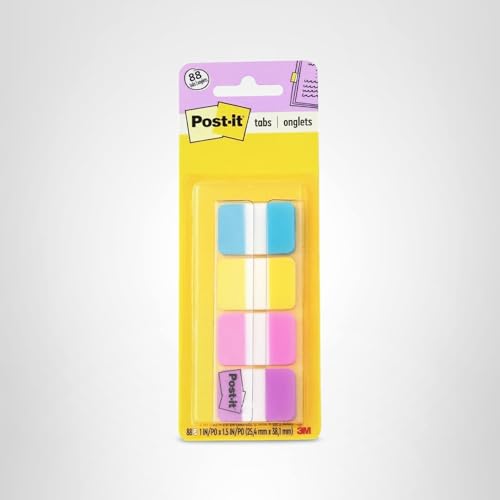 Post-it Tabs in 1 inch size create necessary order by easily organizing planners and calendars into sections. Solid color bars give you flexibility to organize by color. Tabs are durable, you can write on them, and reposition as needed. They are also great for planners, binders and file folders. Tabs stick securely and remove cleanly. Aqua, Yellow, Pink and Violet. Contains 22 tabs/color and 88 tabs/on the go dispenser.