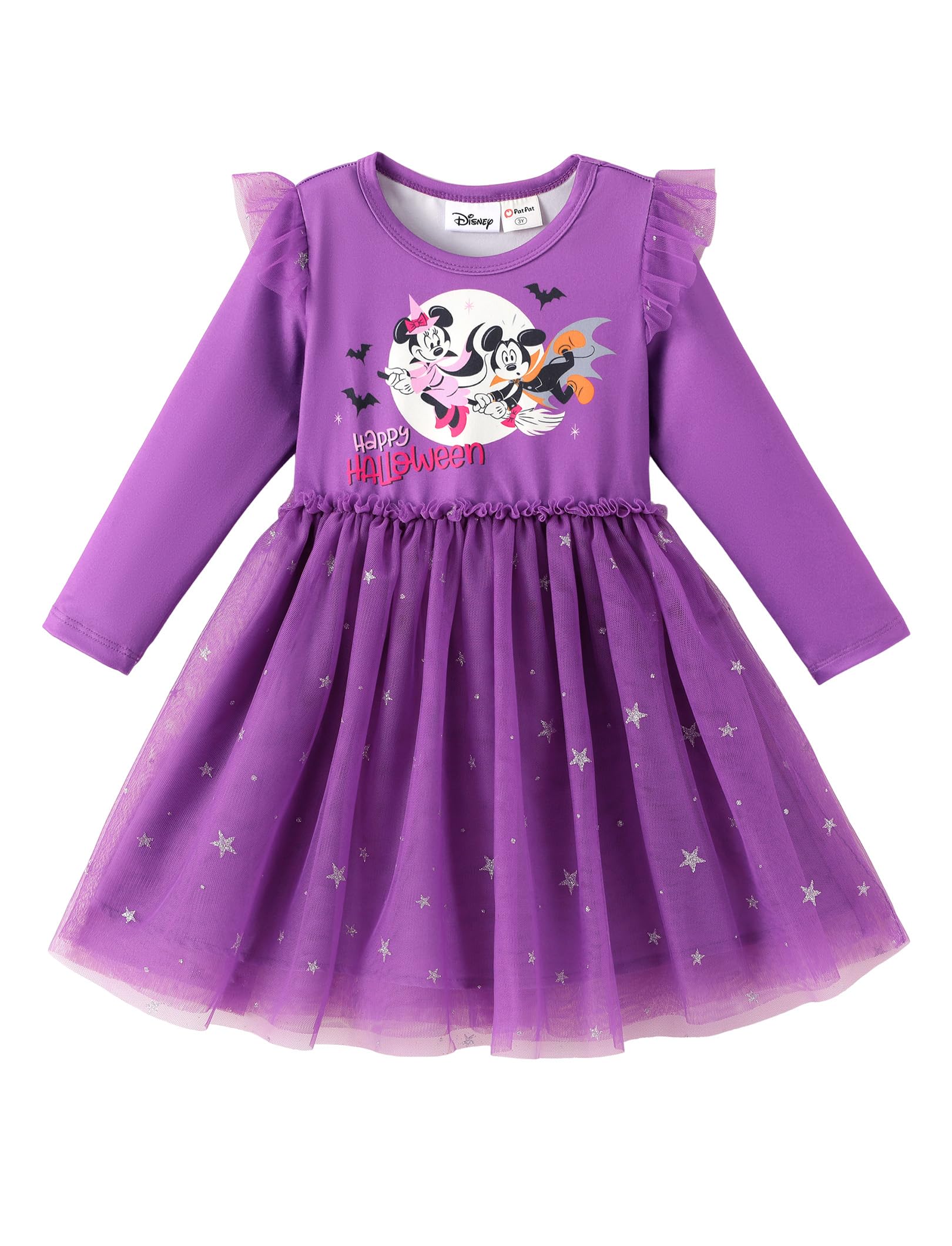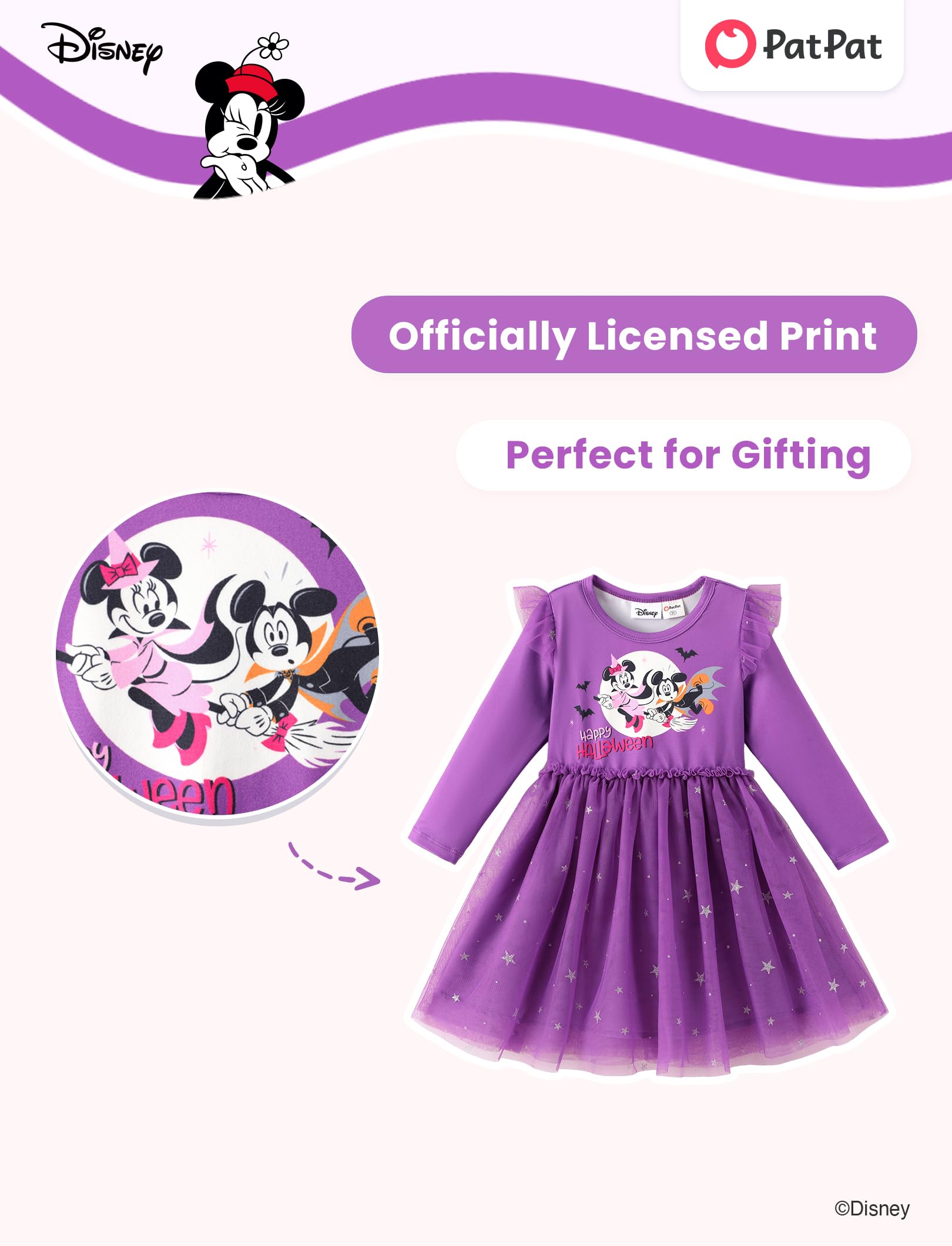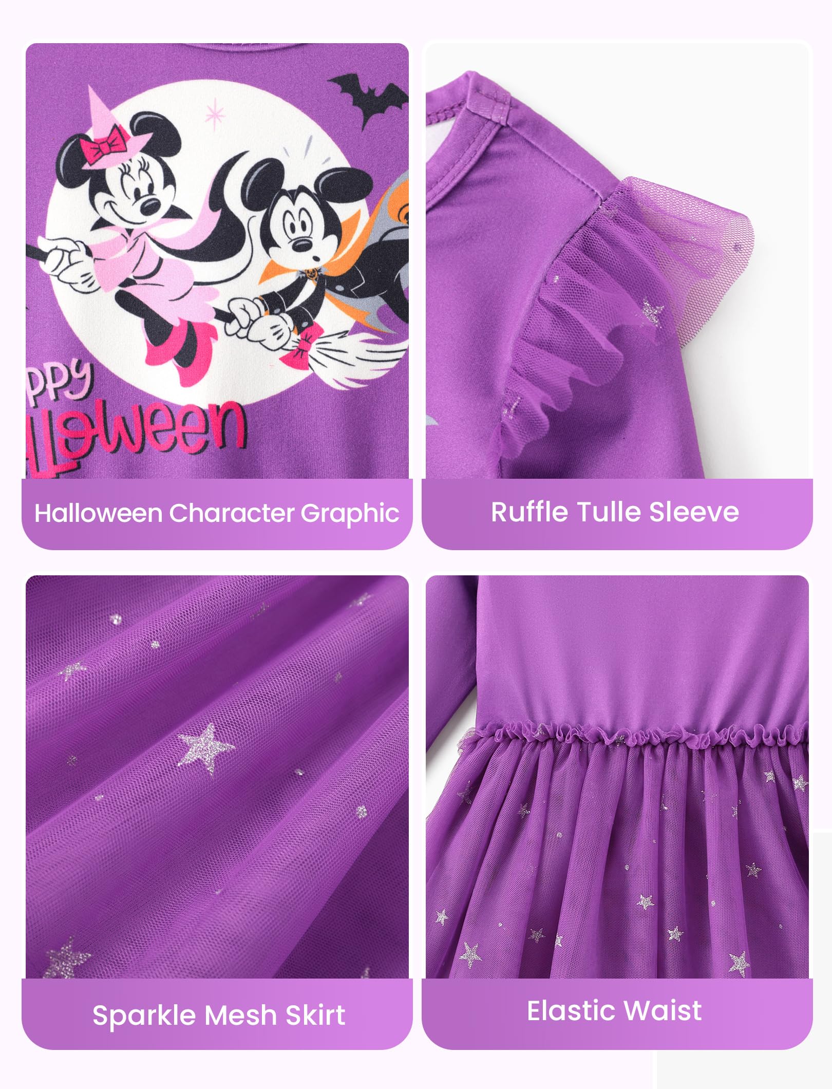 Disney Officially Licensed: This officially licensed Disney toddler Halloween dress features the beloved Mickey and Minnie Mouse, bringing their playful charm to life in a spooky, festive way. The vibrant purple color of the dress, combined with the Halloween themed graphic of Mickey and Minnie dressed in fun costumes, makes it the perfect choice for Halloween celebrations and Disney fans alike.