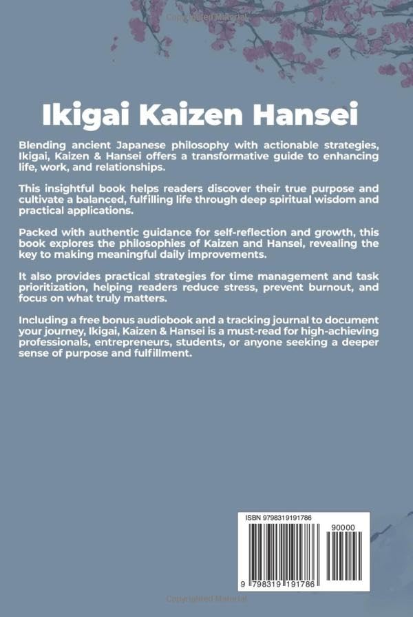 🎧 Includes FREE Bonus Audiobook – Tap into the 🌸 Timeless Wisdom of Japanese Philosophy to Discover Your Life’s Purpose & Boost Productivity 🚀 Are you an overworked or stressed-out professional 😩 struggling to find balance in your daily life? Do you feel like something’s missing—like you’re lacking purpose or clarity? You’re not alone. What if ancient Japanese philosophy could help you break free from burnout, reconnect with your true self, and live a more meaningful life? This transformative guide introduces you to Ikigai, Kaizen, and Hansei—three powerful Japanese concepts that promote self-discovery, personal growth, and lasting balance. Whether you're facing stress, fatigue, or simply searching for more purpose, this book will help you reset your life, one small step at a time. 🌿 What You’ll Get Inside: 🔹 A deep dive into Japanese wisdom including Ikigai, Kaizen, and Hansei for lasting fulfillment and personal development 🔹 🎧 BONUS Audiobook — listen while commuting, doing chores, or relaxing 🔹 📝 A Printable Tracking Journal to help you reflect, stay consistent, and witness your transformation 🔹 Simple, actionable tips to align your goals with your values, reduce stress, and find balance 🔹 Time-tested strategies to help you manage your time, prioritize tasks, and build healthy habits that last ✨ What Makes This Book Different? This book isn’t about quick fixes or massive changes. Instead, it’s built around gentle, consistent improvement—one day at a time. Through relatable stories, timeless wisdom, and practical advice, you'll be guided on how to: 🌸 Discover your Ikigai and uncover your true purpose 🧠 Achieve real work-life balance and escape the burnout cycle 🪴 Embrace continuous growth without pressure or overwhelm 🛠️ Set goals, reflect mindfully, and build habits aligned with the life you want ⏰ Prioritize what truly matters and organize your time with purpose 💭 Imagine waking up each morning with clarity, motivation, and peace of mind. Whether you’re a professional, student, or someone navigating a life transition, this book will help you bring intention, balance, and joy back into your life. ✅ Ready to find your Ikigai and start your journey? 👉 Scroll up and click “Buy Now” to begin your transformation today!