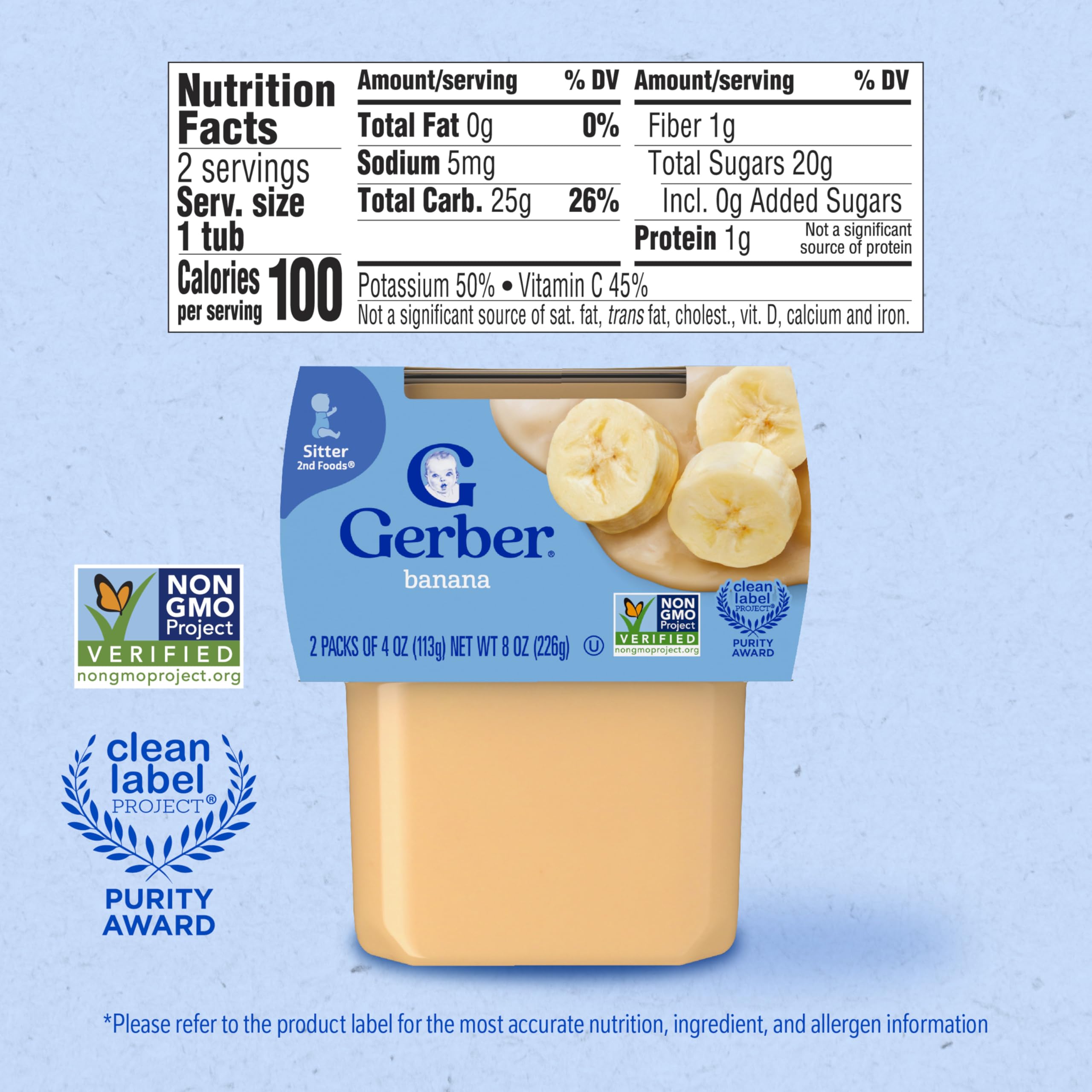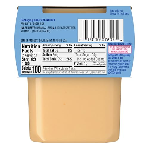 Gerber Stage 2 Baby Food, Banana Puree Tubs are a premium choice for your child’s early stages. Crafted to help support their nutritional needs, along with meeting the busy lifestyle needs of caretakers and parents. Each baby puree tub comes in a portable, easy-to-store format – making it perfect for life’s busy moments. This stage 2 baby food puree is designed for babies who are 6 months + and are ready to explore new textures and flavors. Gerber understands the importance of providing wholesome ingredients during the crucial developmental stages of your child's life -- that’s why our baby puree is Non-GMO Project Verified. Gerber baby puree is ideal for parents who seek a convenient and high-quality option in their baby's diet. These tubs need to be refrigerated after opening and must be used after 1 day.