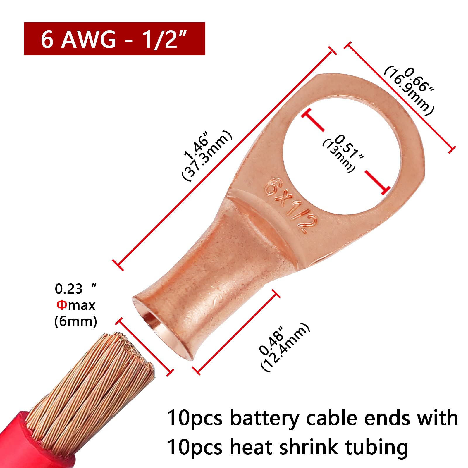【What You Get:】 10 Pcs per pack of 6 Guage (AWG) 1/2" ring terminals, copper lugs closed end termination ring terminals with 10 Pcs 3:1 Dual Wall Adhesive Heat Shrink Tubing Tube for your work(5pcs Black and 5pcs Red).