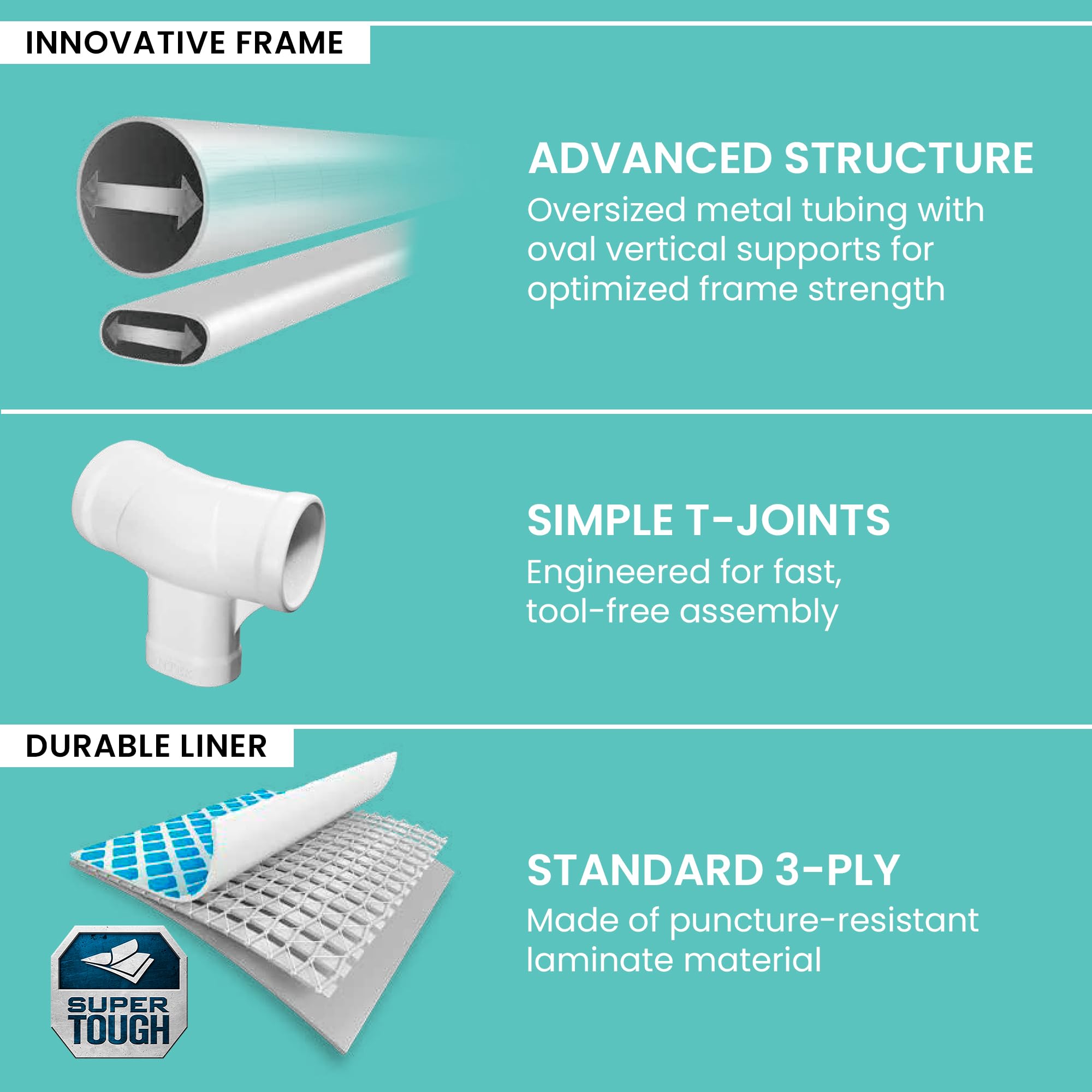 Easy to Assemble: Ready for water in just 30 minutes; spread out on level ground with a ground cloth; Enhanced with strong powder-coated steel tubing and our innovative composite T-Joint design makes assembly quick and easy