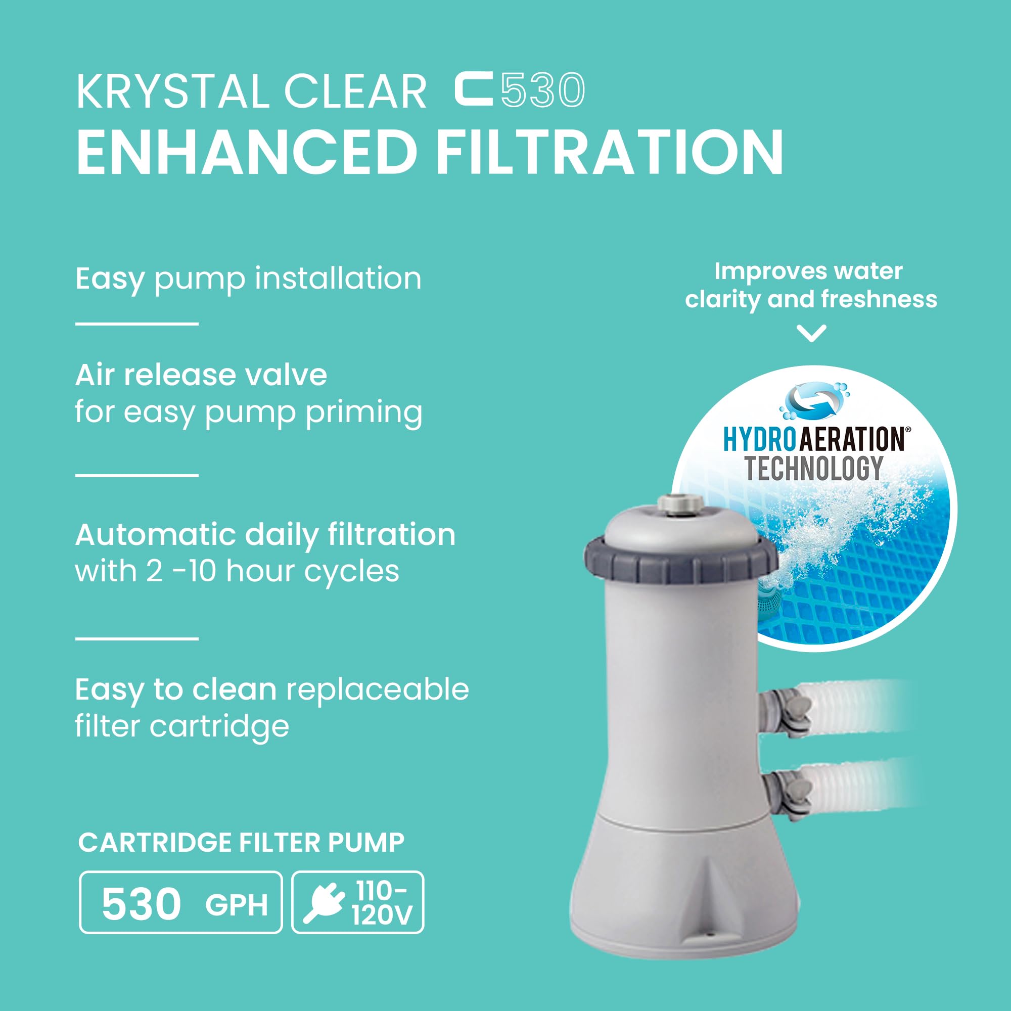 Krystal Clear Filtration: The included pump filters 530 GPH and incorporates HydroAeration Technology into the cartridge filter pump providing improved circulation and filtration, improved water clarity, and increased negative ions