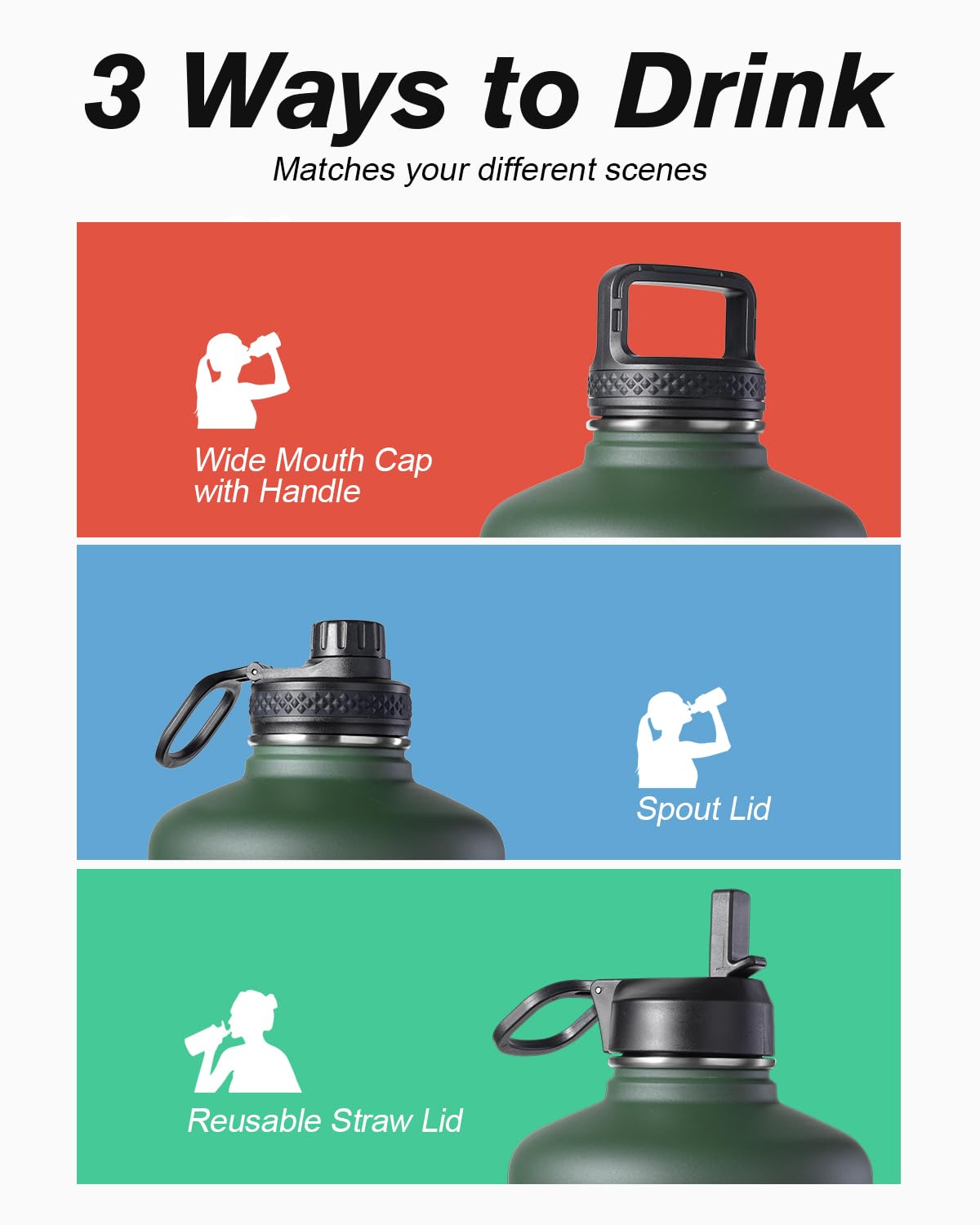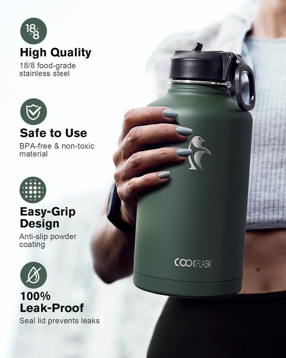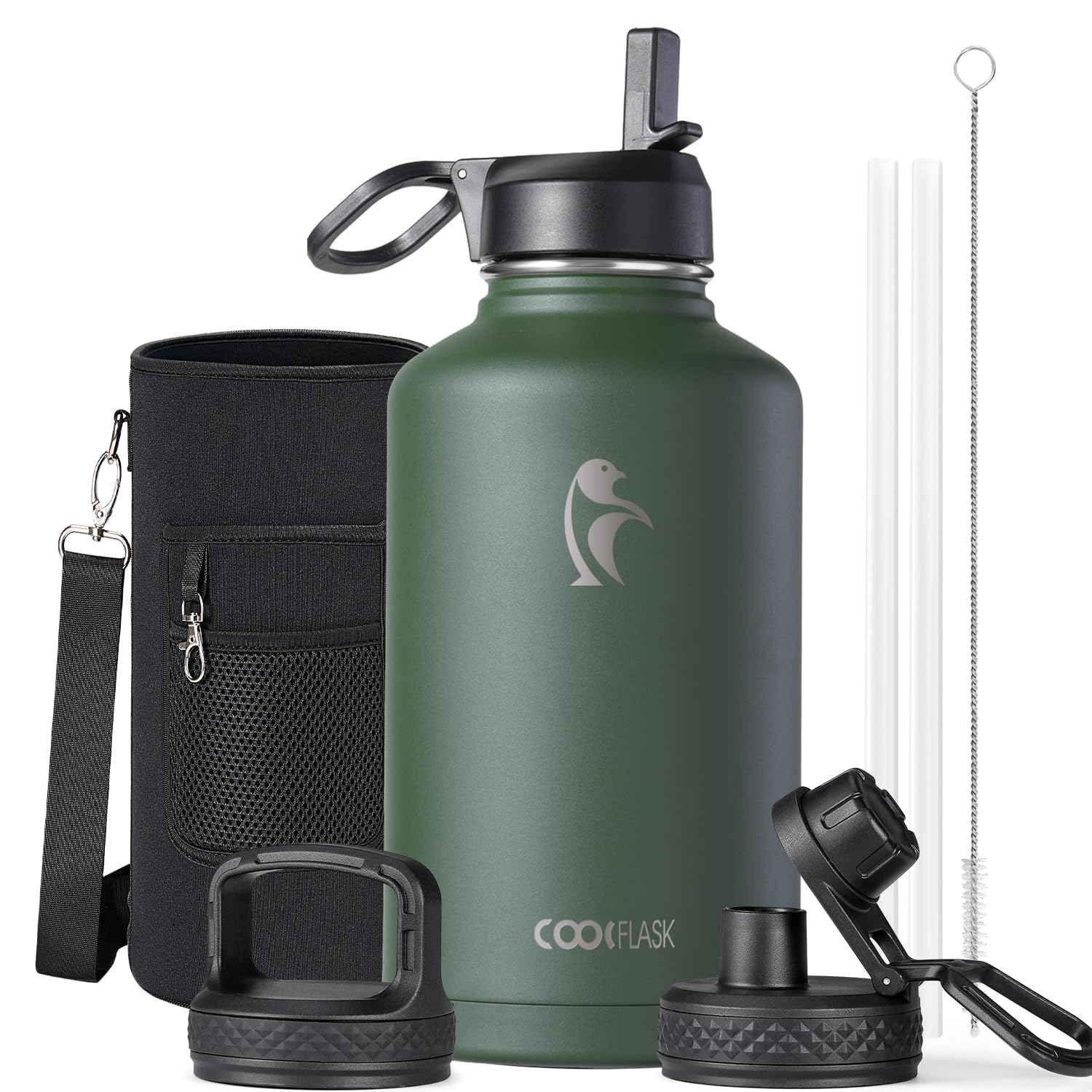 Half Gallon Water Bottle Insulated with Straw & 3 Lids, Coolflask 64 oz Water Jug Large Metal Stainless Steel Wide Mouth for Sports, Gym or Office, Non-BPA Keep Cold 48H Hot 24H, Dark Green
