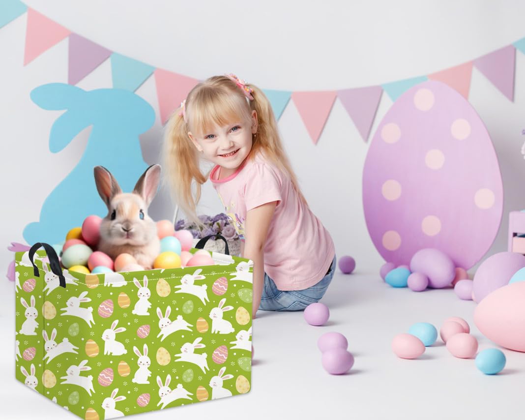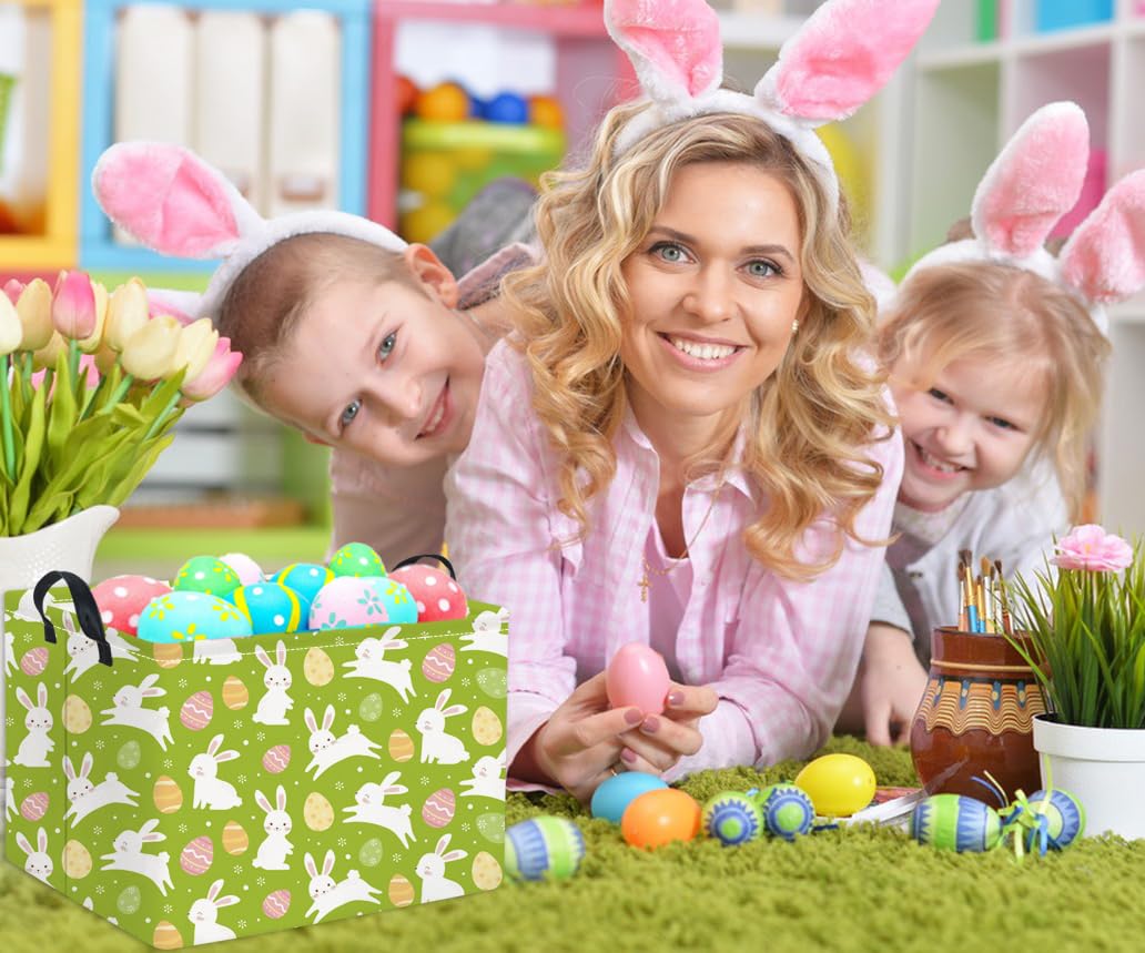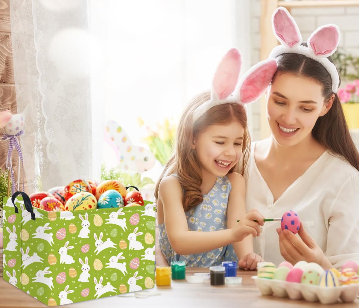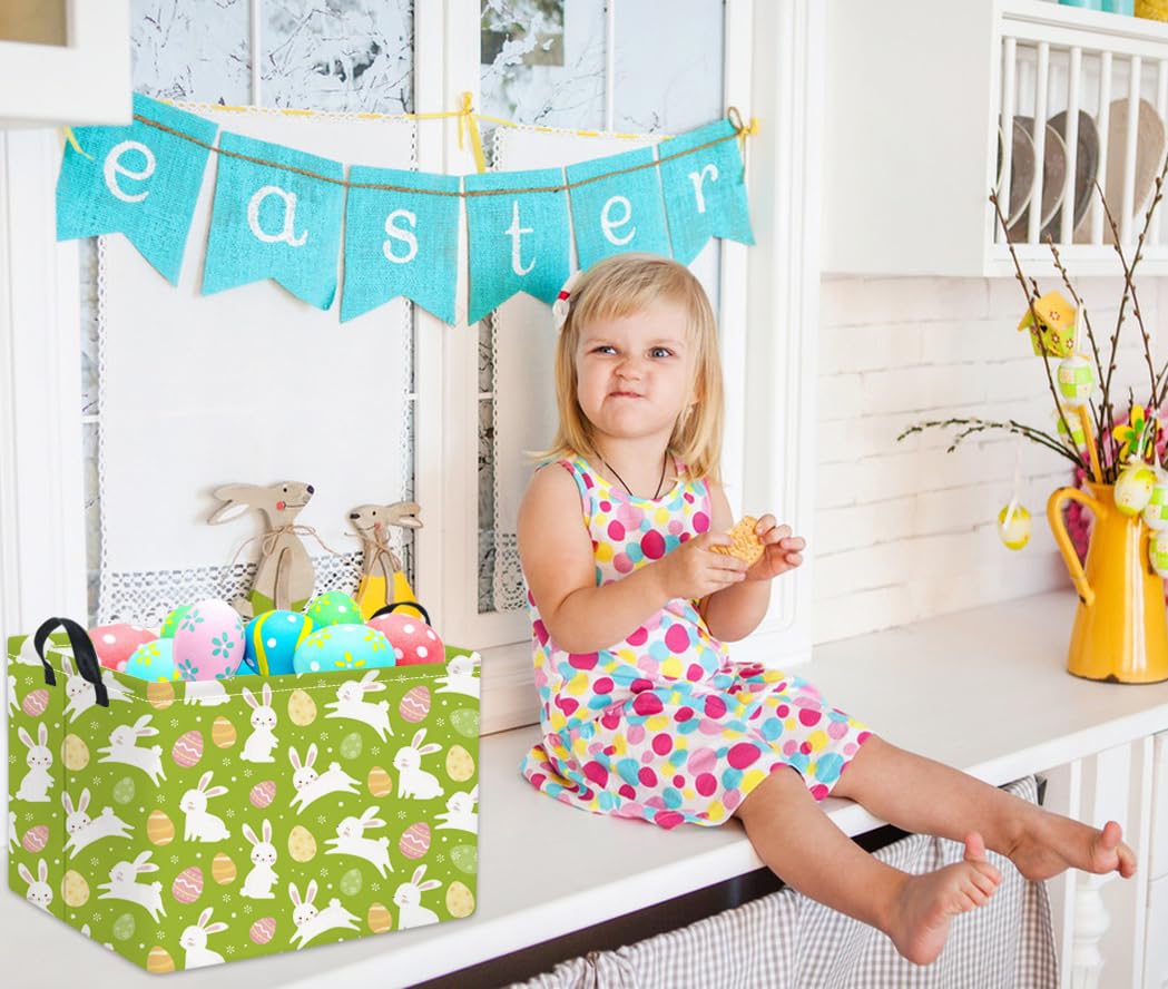 MATERIAL:The easter t basket is made of durable canvas &The inner lining is made of waterproof fabric; sturdy metal rod frame around the top keep the basket shape.