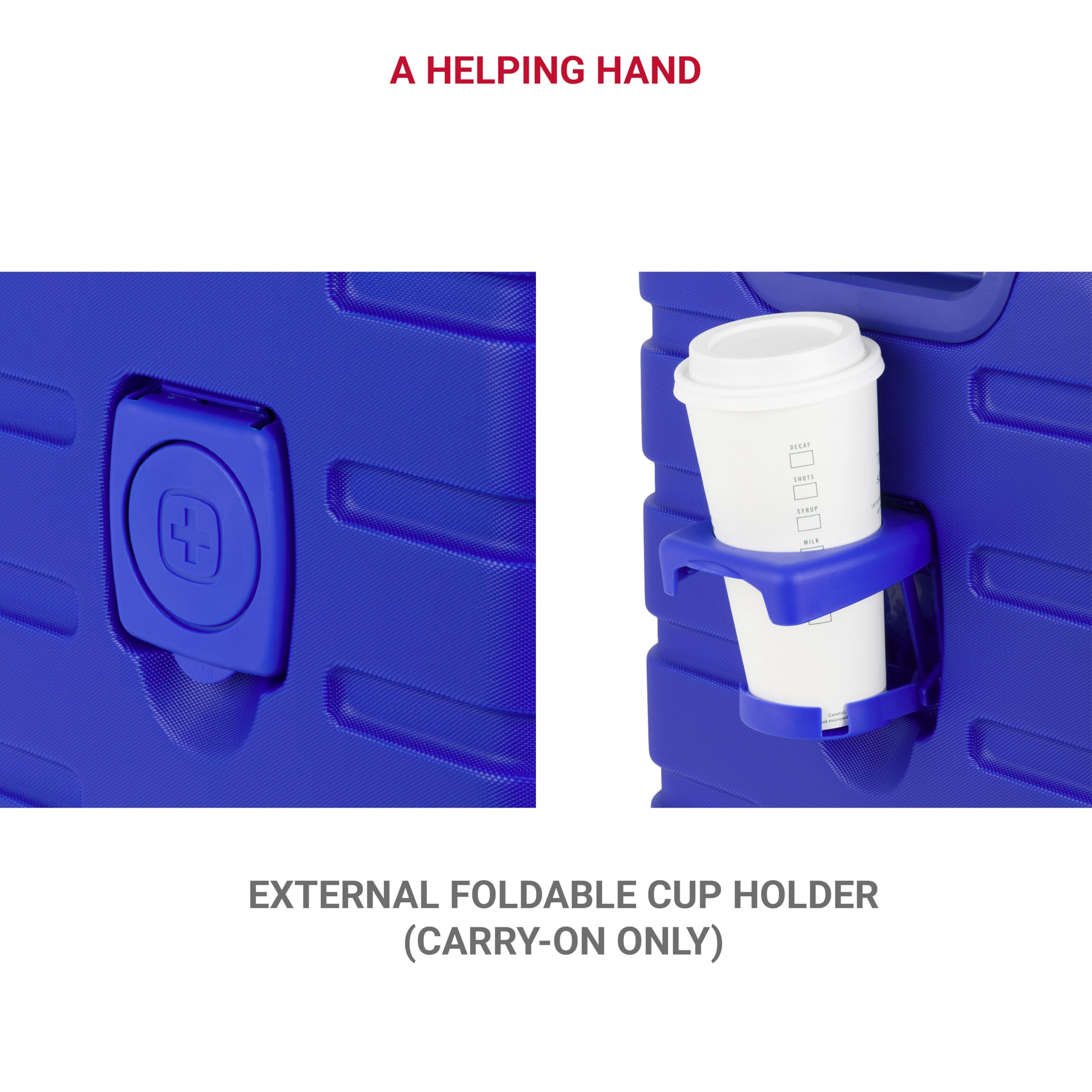 Four 360-Degree Multi-Directional Spinner Wheels: Built with maximum maneuverability in mind, so you can navigate busy airports and small spaces with ease; the unique, patented built-in cupholder is an extra helping hand on the way