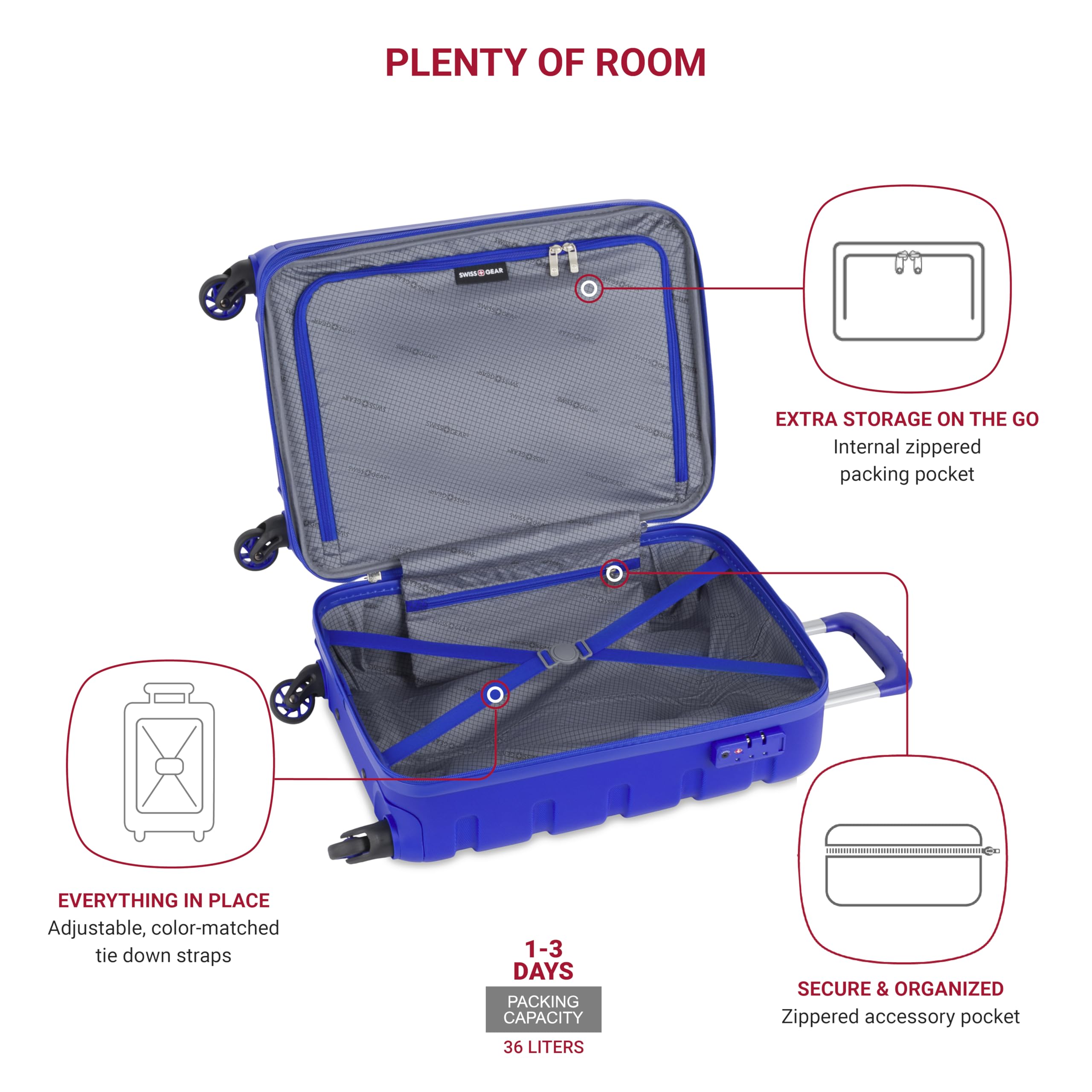 Description SwissGear 7366 Hardside Expandable Luggage with Spinner Wheels and Cup-Holder is the perfect carry-on luggage for your next trip. This 19-inch suitcase is made of durable ABS and includes co-molded lift handle(s) with soft rubber hand grips for easy maneuverability. The split-case design expands for additional packing space and a variety of internal pockets keep you organized. The eight 360-degree multi-directional spinner wheels and a premium, push-button steel locking telescopic handle make it easy to navigate through the airport. With outside dimensions of 22 x 14.25 x 10 inches including wheels and handles, this suitcase offers 19 x 14 x 10 inches of packing space. This hardside luggage is perfect for those who need a lightweight and durable suitcase for their travels. The hardshell exterior is designed to protect your belongings from the wear and tear of travel, while the spinner wheels make it easy to move around. The telescopic handle is designed to be comfortable and easy to use, and the internal pockets help you stay organized. Plus, this suitcase comes with a 10-year warranty against defects in materials and workmanship.