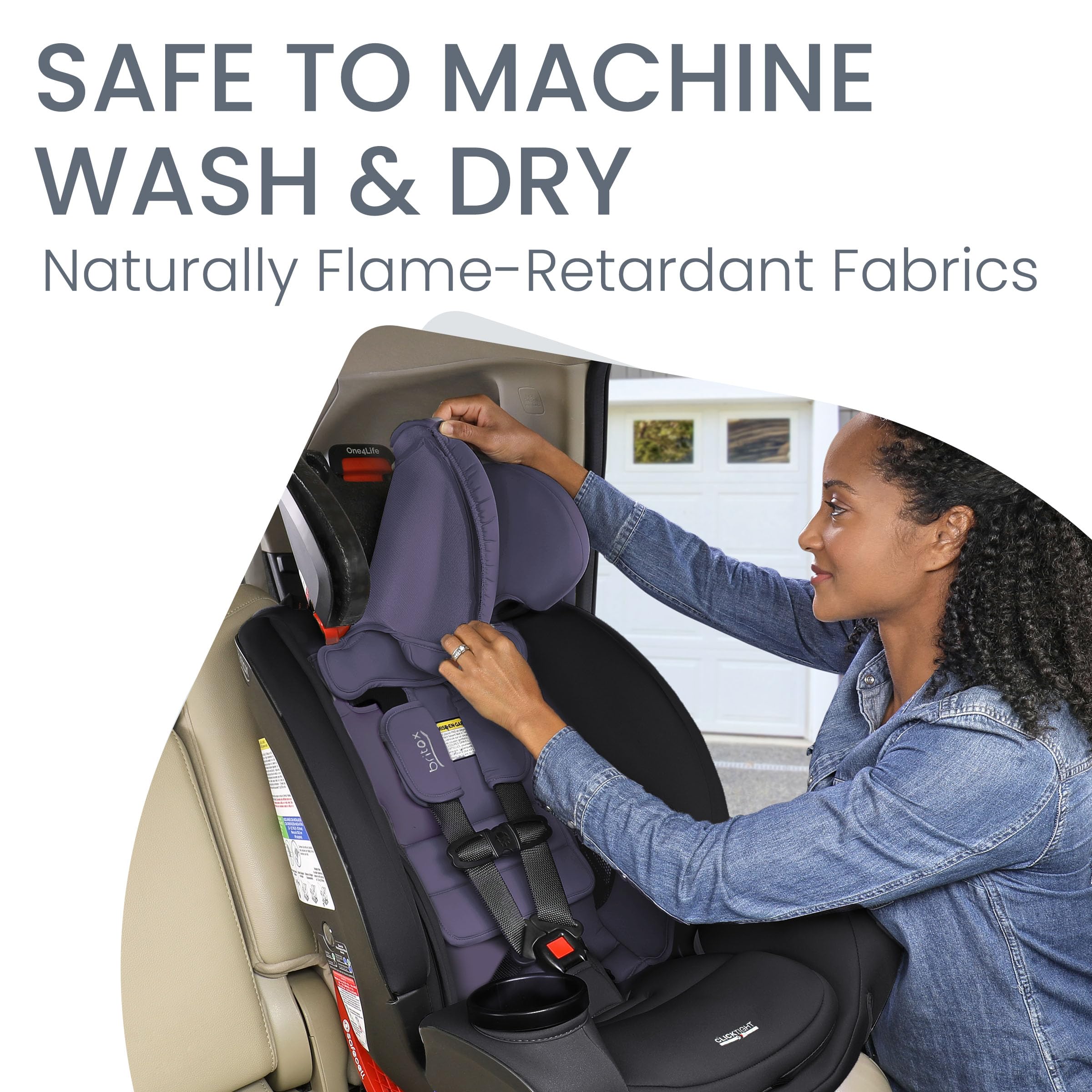 Enjoy safe travels from birth to big kid with the Britax One4Life all-in-one car seat. This car seat features 4 configurations, including rear facing infant car seat, rear facing toddler car seat, forward facing 5 point harness car seat, and forward facing high back booster seat. Start with the rear facing car seat for infants and toddlers, then graduate to the forward facing car seat and booster car seat for preschoolers and big kids. ClickTight technology makes it easy to install your new baby car seat with confidence. Simply open the seat, follow the path to thread the seat belt, buckle it, and click the seat closed. The One4Life all in one car seat is outfitted with a high-strength steel frame, a SafeCell crumple zone, and a patented V-shaped tether. The protective seat shell and foam-lined headrest help absorb impact energy and are designed to help keep your child's head, neck, and body safe. Adjust the 15-position headrest and no-rethread harness at the same time, so you can find a secure fit in seconds. Quickly adjust between 9 recline positions and use the easy-read level indicators to find the correct angle. The Britax One4Life comes with an easy-to-remove, machine-washable cover, and the knit construction is naturally flame-retardant.