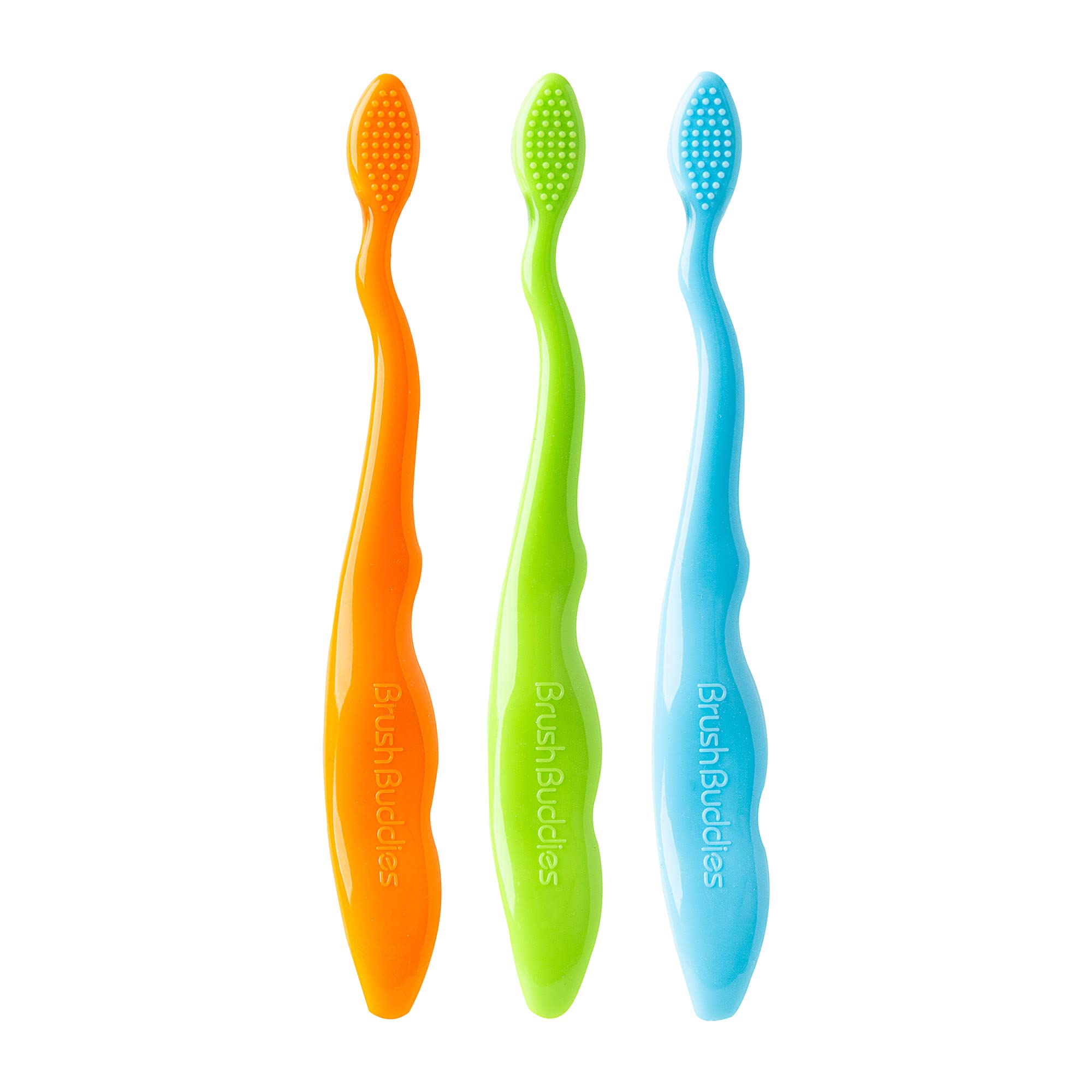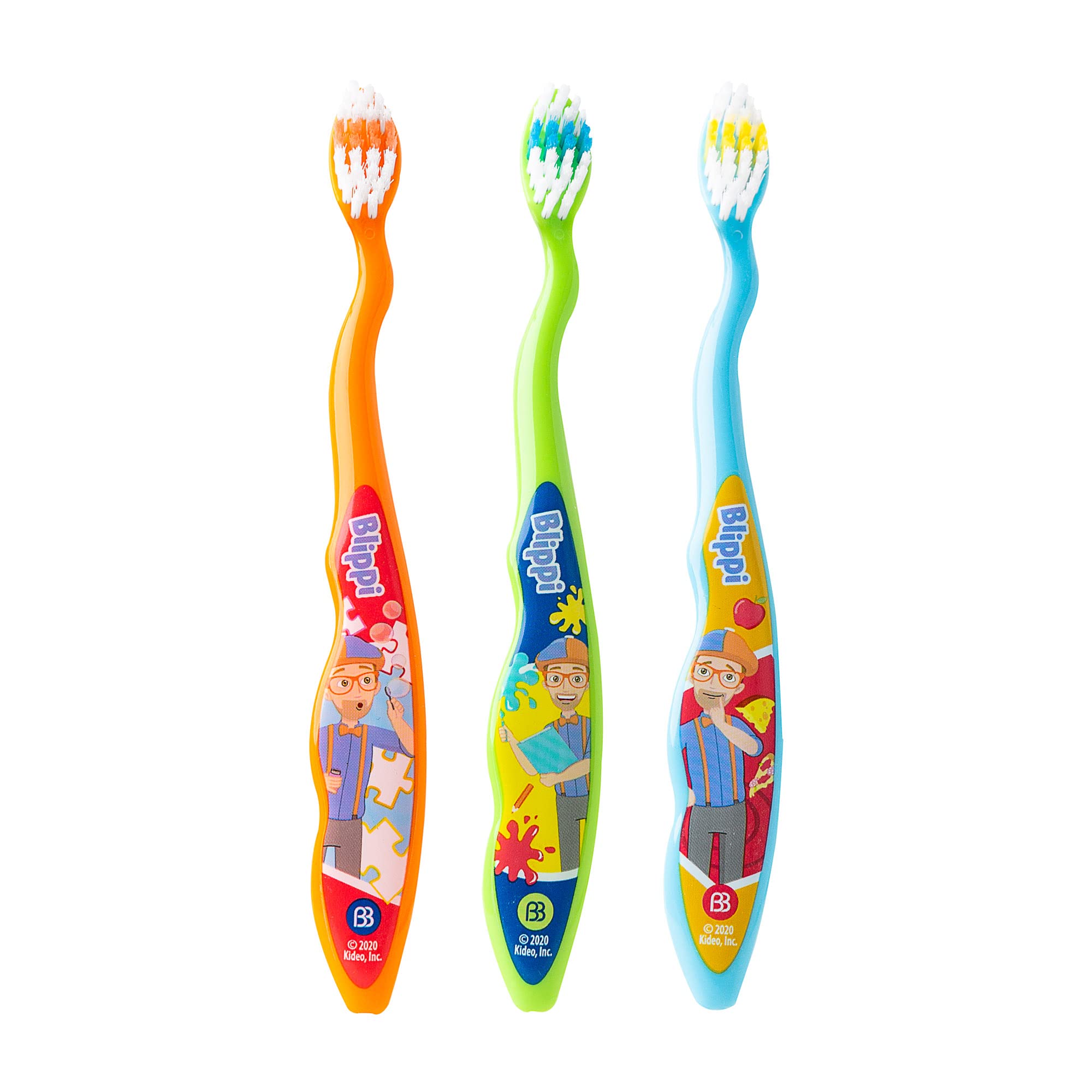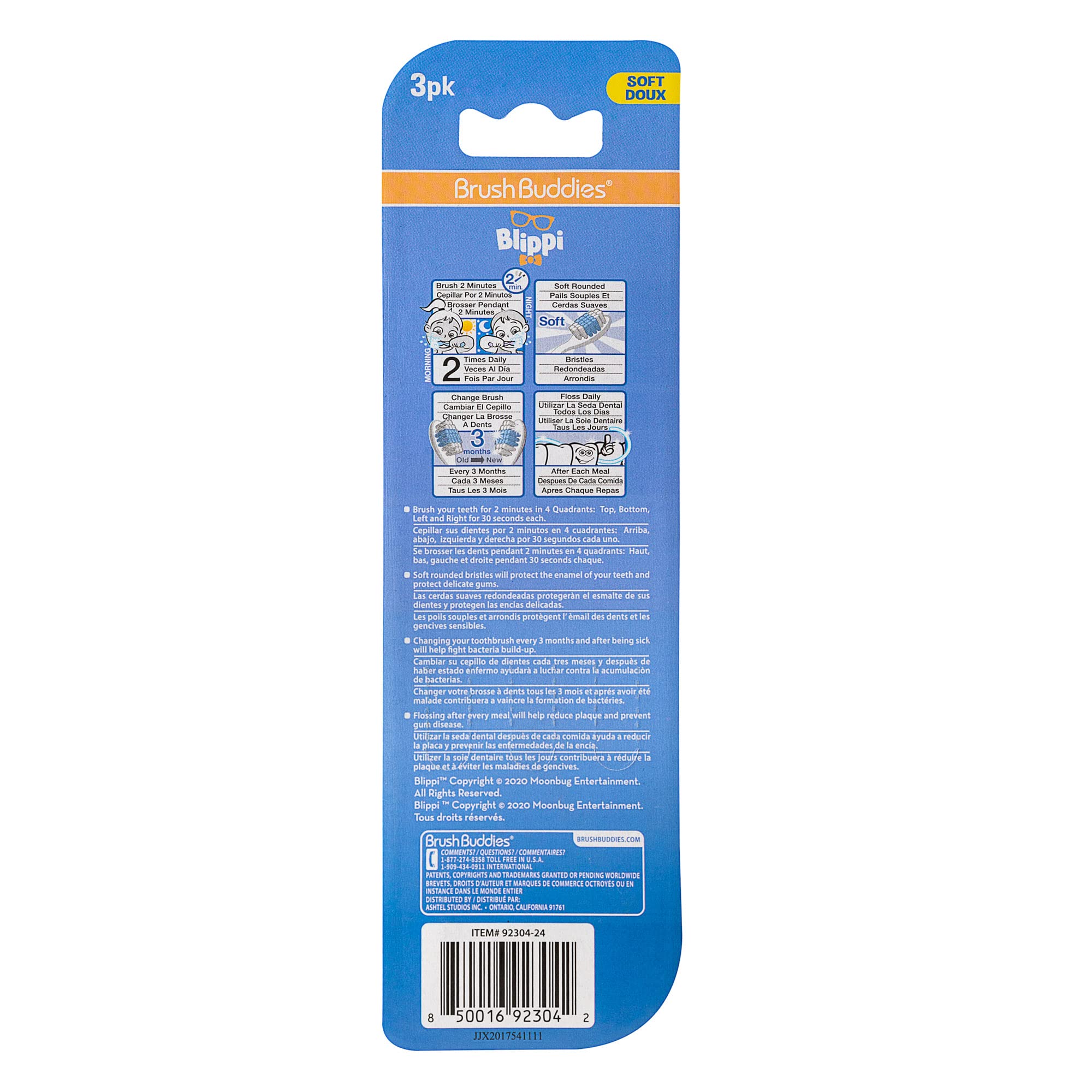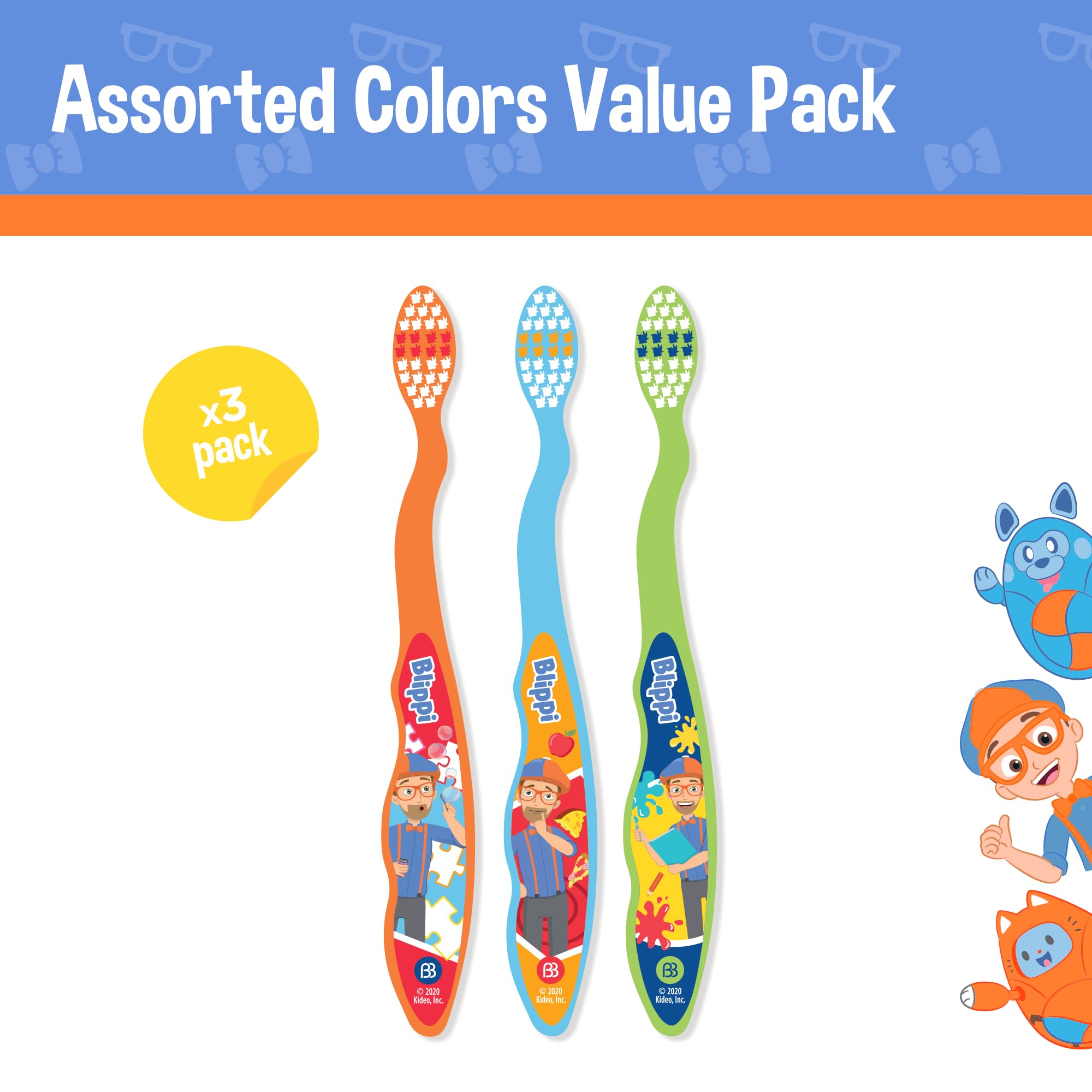 [What's Included] The Brush Buddies Blippi Manual Toothbrush Pack includes 3 multi-colored Blippi kid's toothbrushes.