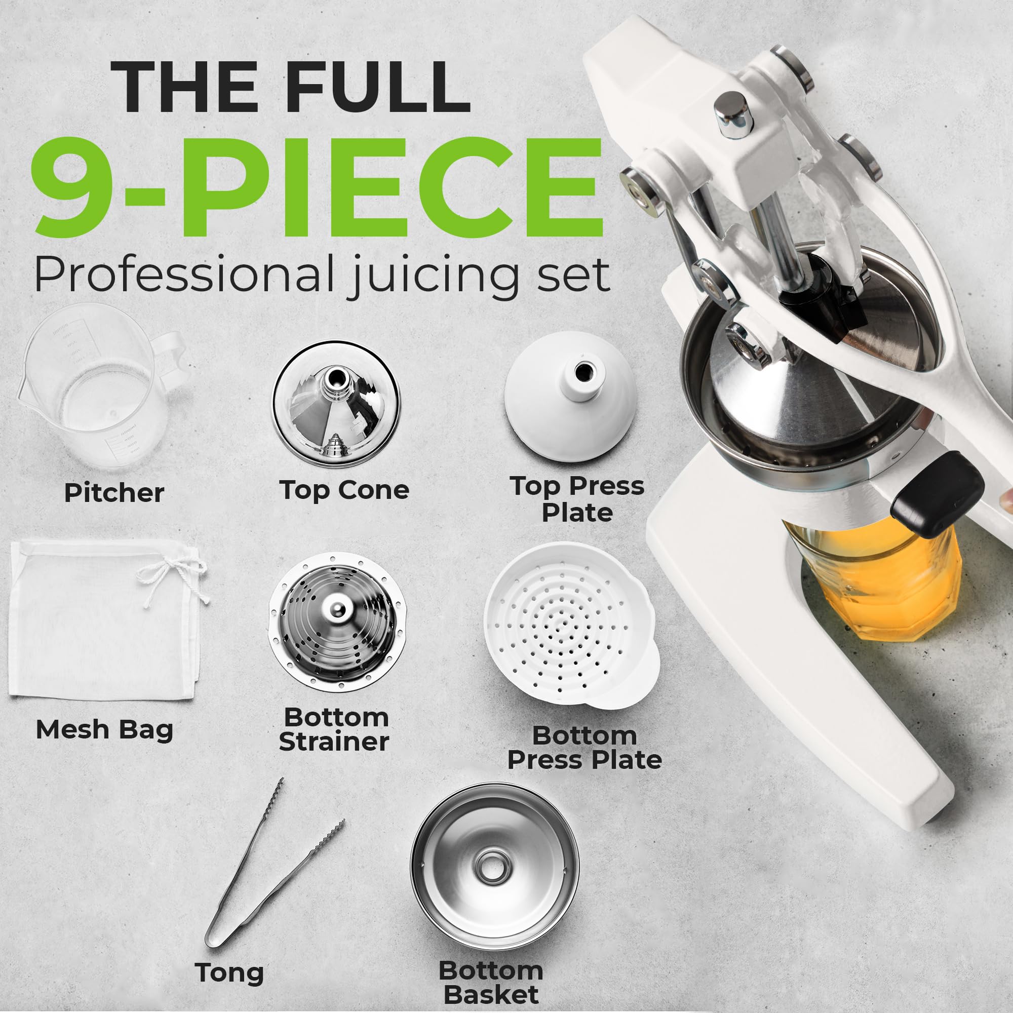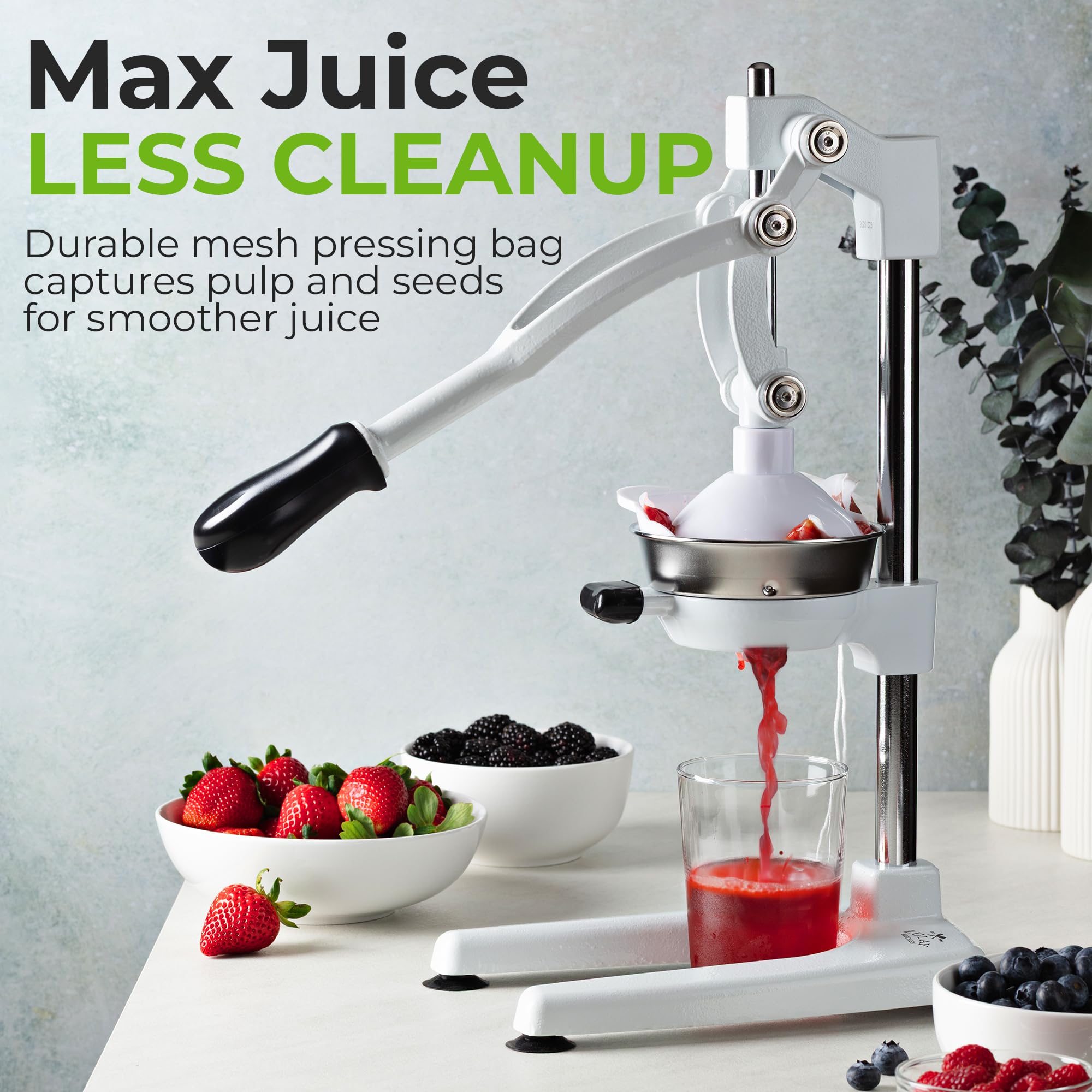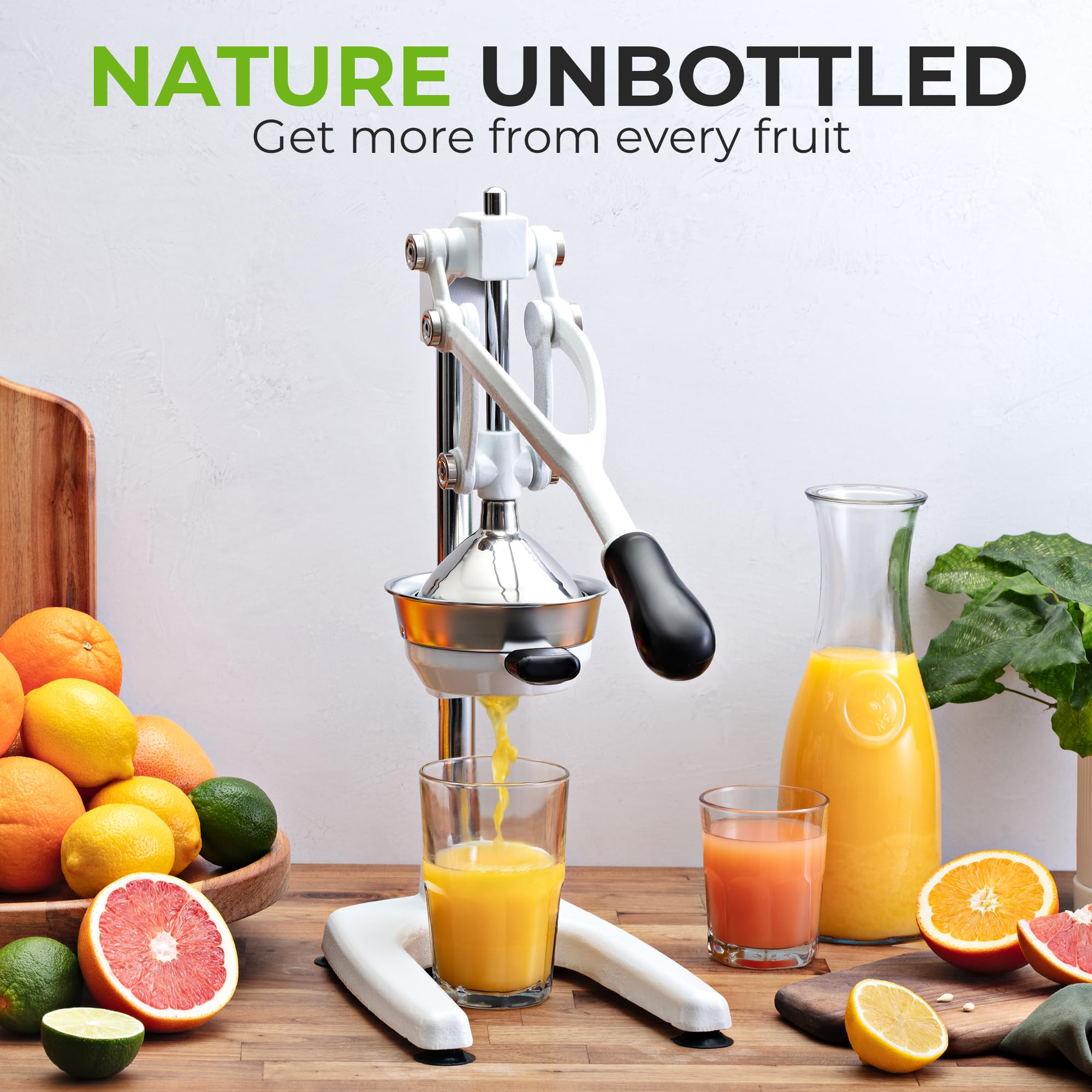 STURDY AND DURABLE MATERIAL: This manual juicer is made of heavy-duty cast iron that can easily withstand the pressure from continuous pressing for years to come. The leverage mechanism allows a one-time easy pull to get all the juice out. Our citrus press is designed with a heavy rubberized base to firmly keep it in place without the fear of falling tipping or sliding off the counter. This hand juicer is great for both professional and at-home use