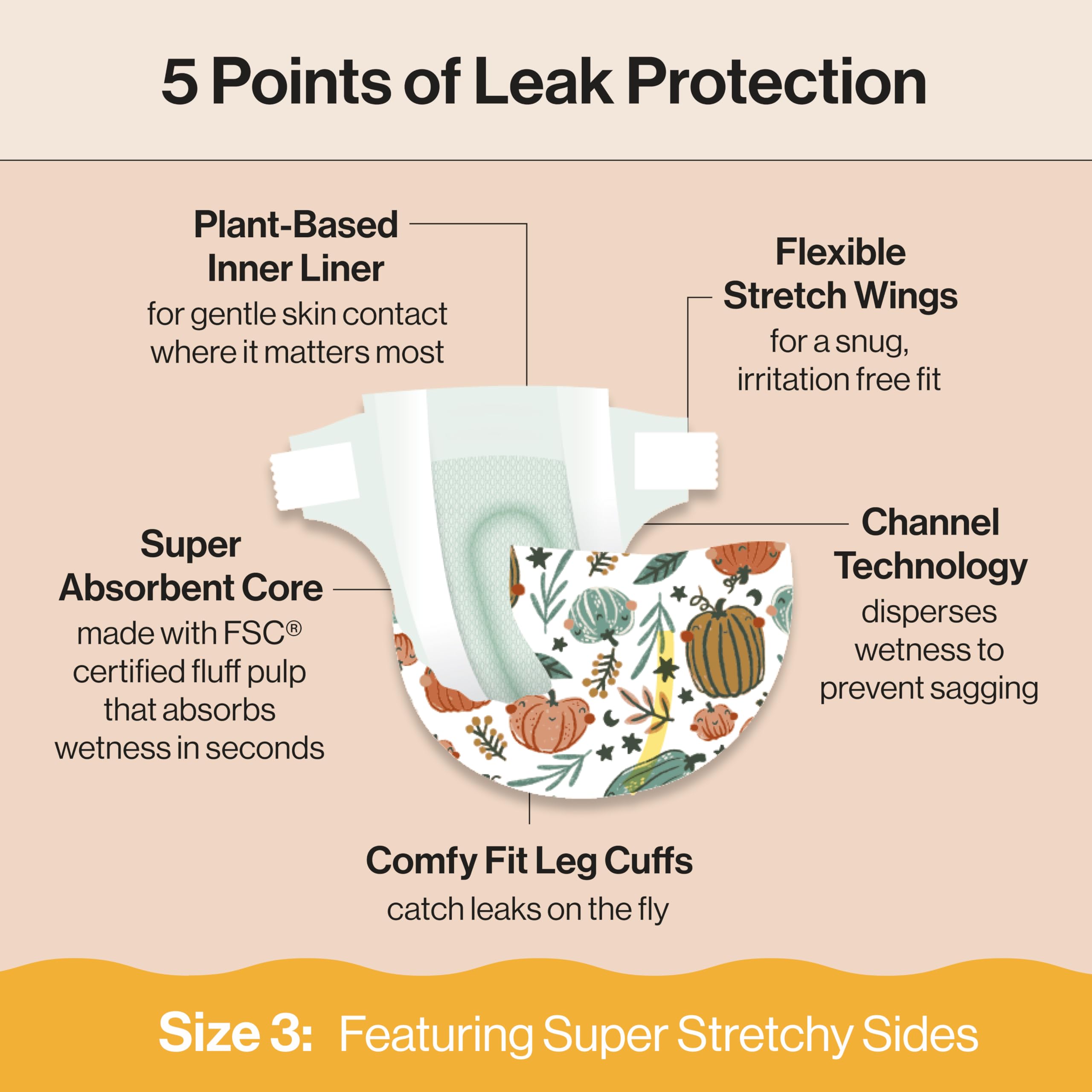 OUR BEST FIT YET: Designed to move with your baby, Honest Clean Conscious Diapers feature comfy fit leg cuffs to catch leaks on the fly and flexible, stretchy wings that provide a snug, irritation-free fit. The super cute prints are an added bonus