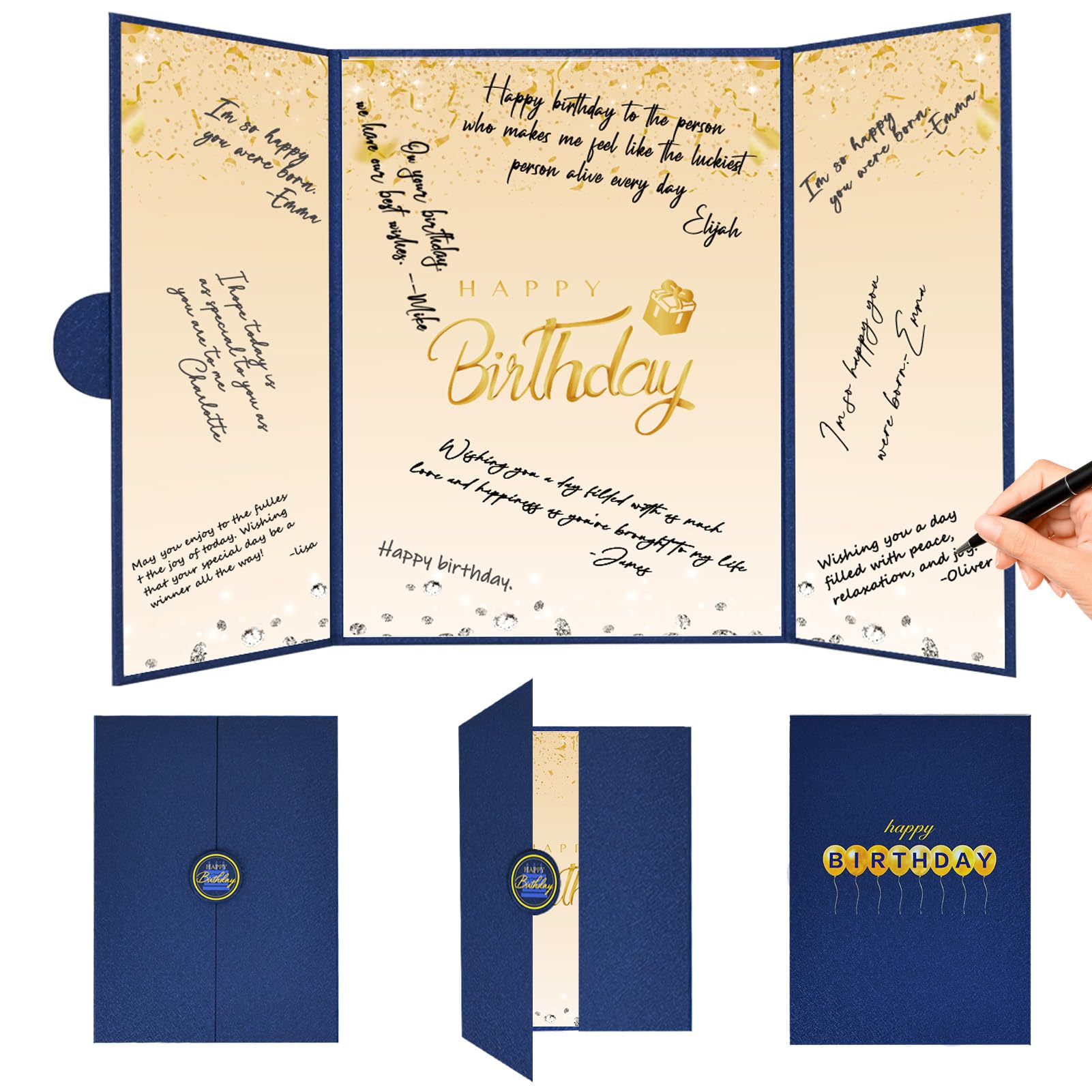 【Exquisite Design】- The blue gold certificate has a badge on the cover, and the inside of the signature certificate is divided into three parts, the middle page is printed with the message 'Happy Birthday'. This birthday signature guest book can be opened directly and stand on the table. Tips: No pen.