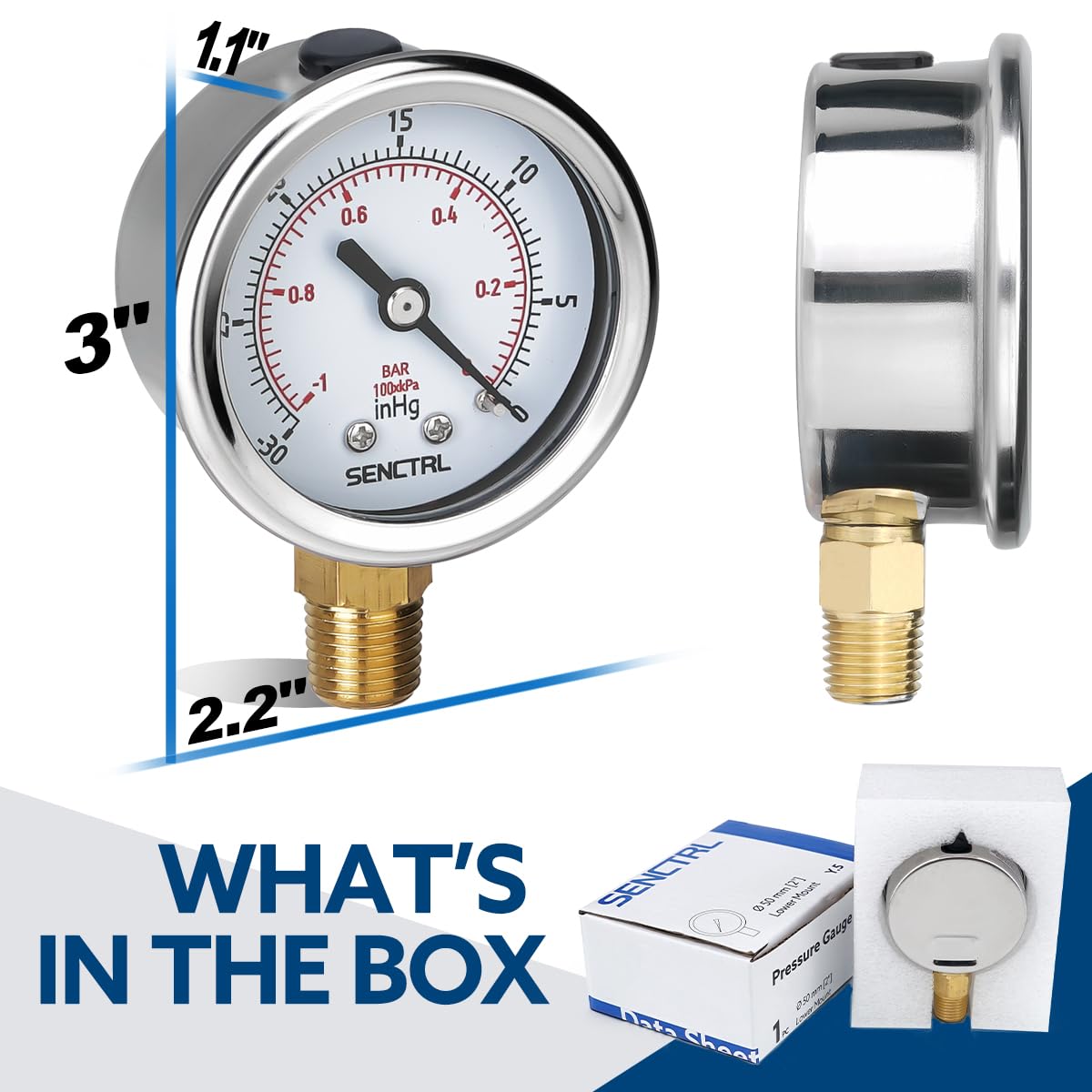 Measures pressure with dual scale (-30-0 inHg/-1-0 bar). Display accuracy is + or - 3/2/3% over the entire range of the gauge