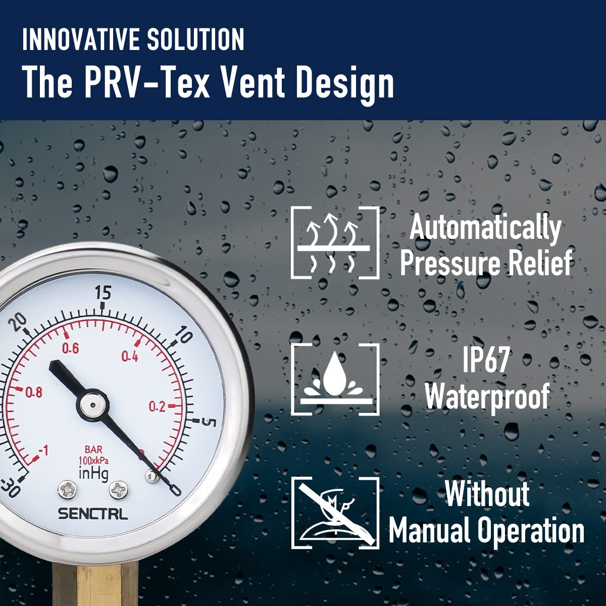 PRV-Tex Series: The circular dial is enclosed in a 304 stainless steel case for corrosion resistance. IP67 waterproof reduces condensation inside causing fogging of the window. Offer clear reading and weather resistance.