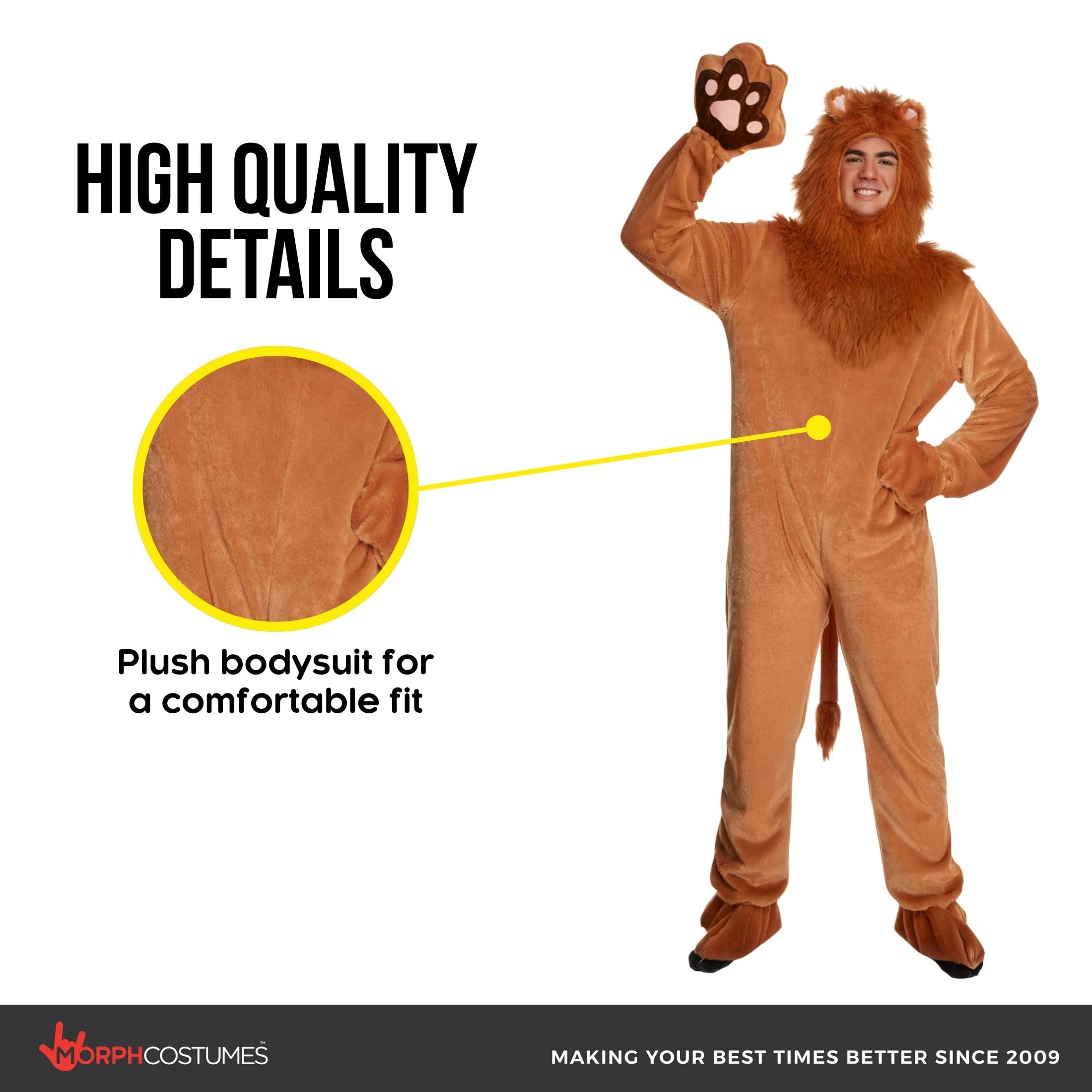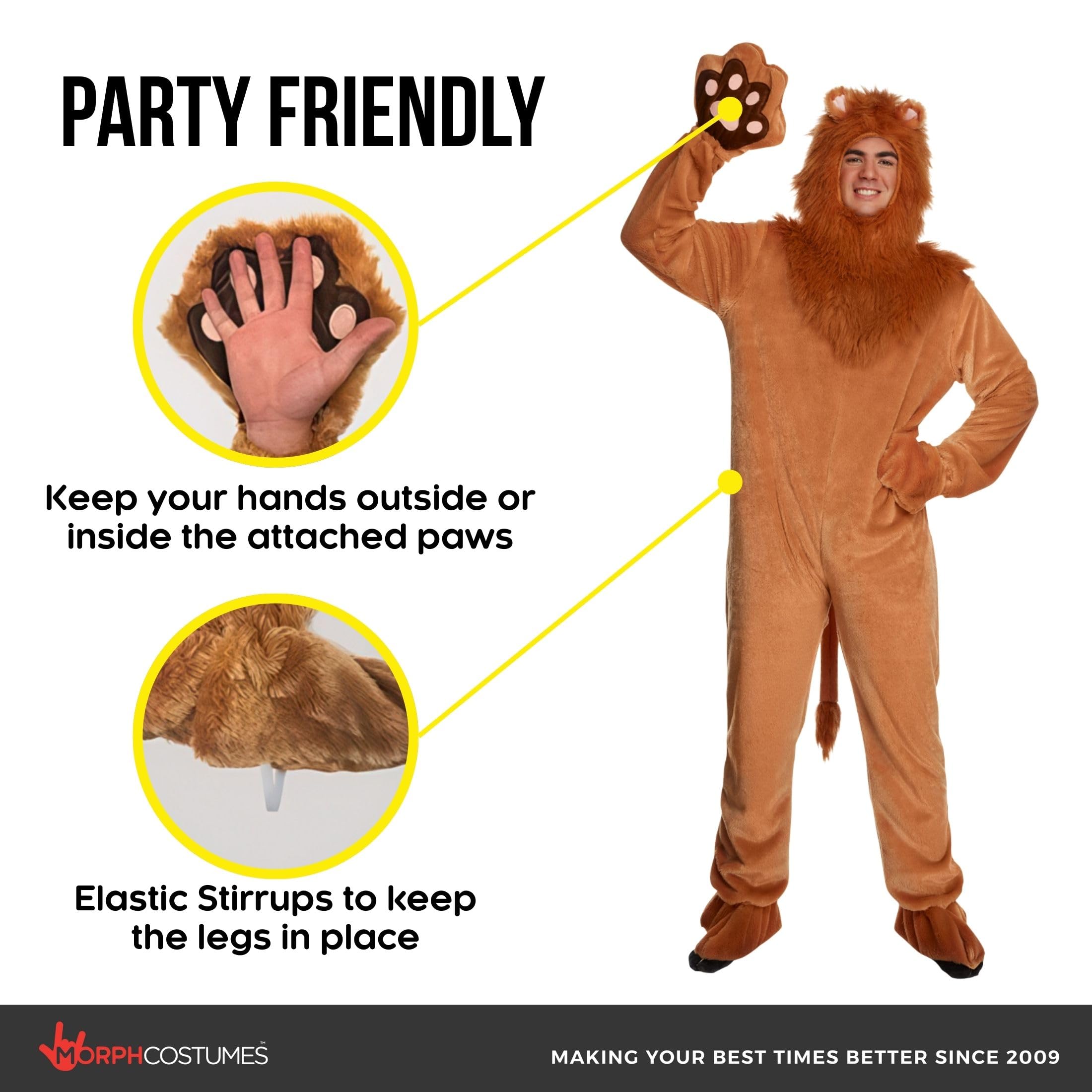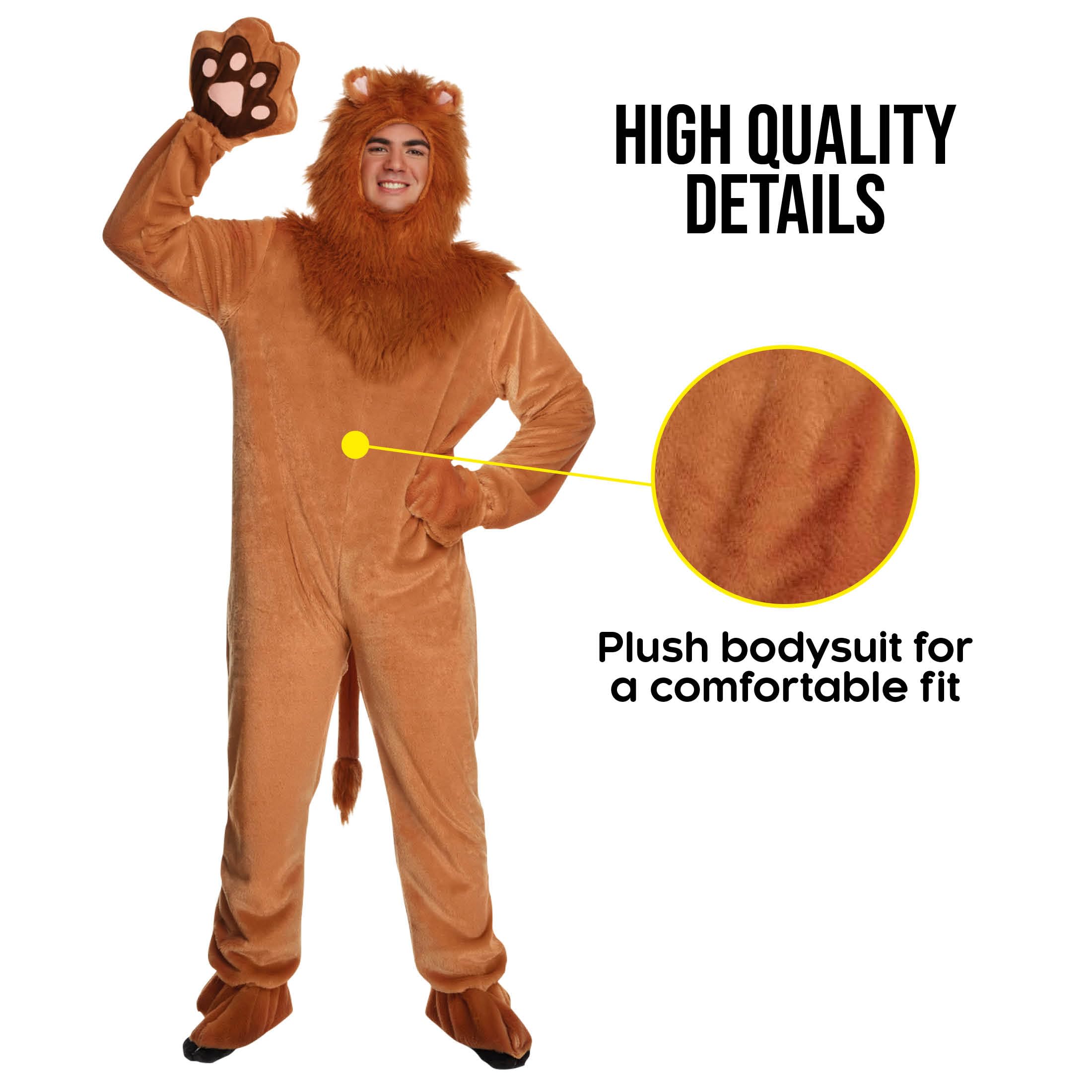 All-in-one lion costume: Features a plush full-body jumpsuit, detailed lion mane hood, paw mittens, shoe covers, tail, and easy elastic stirrupsβeverything you need for an eye-catching lion costume adult partygoers will love.