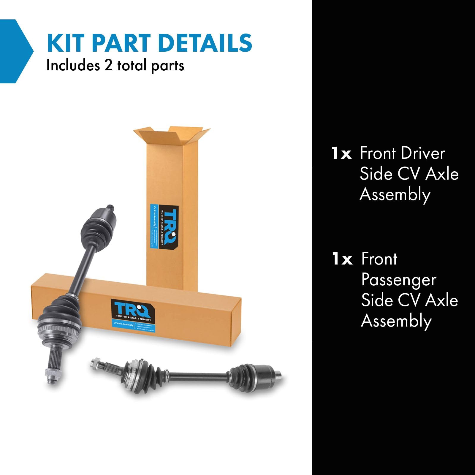 2 Piece CV Axle Assembly Set Kit Includes (1) Front Driver Side CV Axle Assembly (1) Front Passenger Side CV Axle Assembly Fitment Compatible with: 1999 Honda Civic SI Front Driver & Passenger Side Compatible with: 1994-01 Acura Integra Front Driver & Passenger Side Compatible with: 1994-97 Honda Civic Del Sol VTEC Front Driver & Passenger Side Product Attributes Quantity: 2 Piece Product Features 100% New: Manufactured to tighter tolerances for extended service life Neoprene Boots: Improved durability compared to stock material Moly Greased: Specifically-designed grease shield to reduce premature wear Application Specific Design: No modification Item Details TRQ CV (constant velocity) drive axles are manufactured using premium raw materials designed to restore original performance. TRQ CV drive axles are new, so there is no core charge with your TRQ purchase. TRQ-designed drive axles utilize neoprene boots, moly grease, stainless steel clamps, and heat-treated ball tracks to ensure extended service life. Each TRQ axle is application-specific so each spline and thread will mate properly for a seamless fit. All products are fit and road-tested in our Massachusetts R&D facility to ensure we deliver on our promise of Trusted Reliable Quality. Reference Numbers 44010S04J01 44010S04J51 44010SK7J13 44010SK7J22 44010SK7J73 44010SK7J82 44010ST7950 44010ST7J50 44010ST7J60 44010ST7J61 44010ST7J72 44010ST7N00 44010ST7N50 44010ST7R51 44011S04J01 44011S04J51 44011ST7950 44011ST7J50 44011ST7J60 44011ST7J61 44011ST7J72 44011ST7N00 44011ST7N50 44011ST7R51 44305S03950 44305S04J10 44305S04J60 44305S5TA50 44305S6EE50 44305ST7A50 44306S03950 44306S04J10 44306S04J60 44306ST7A50 447-6063 447-60640L 447-60648L 447-60764R 447-60768R 66-4063 66-4121 664063 664121 NCV21508 NCV21525