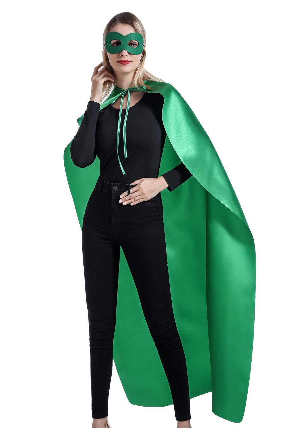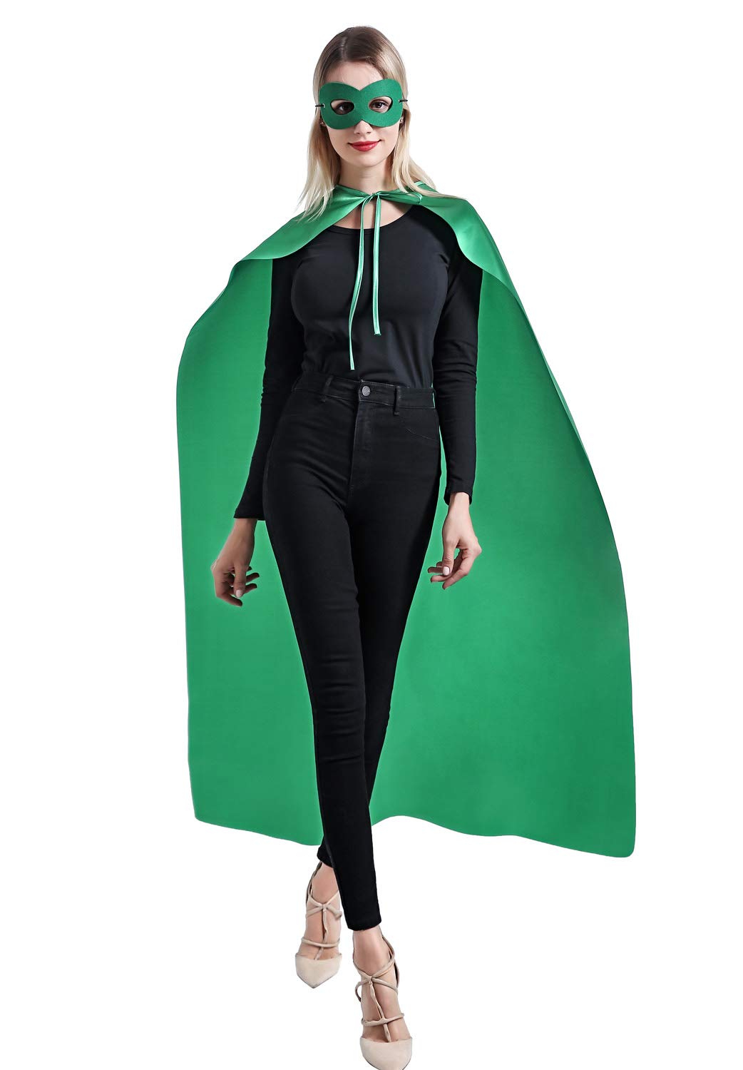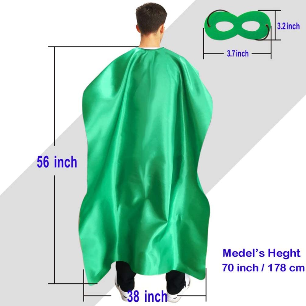 Size:Length 57 x Width 38 inch for capes. Our superhero capes and masks for adult bulk pack, are designed in perfect size after plenty of test; We have round neck hole, which fits better than simply sewed straight fabric with elastic. You can tie a bow with the cord to fit the neck. The masks ensure a snug with elastic but not too tight fit.