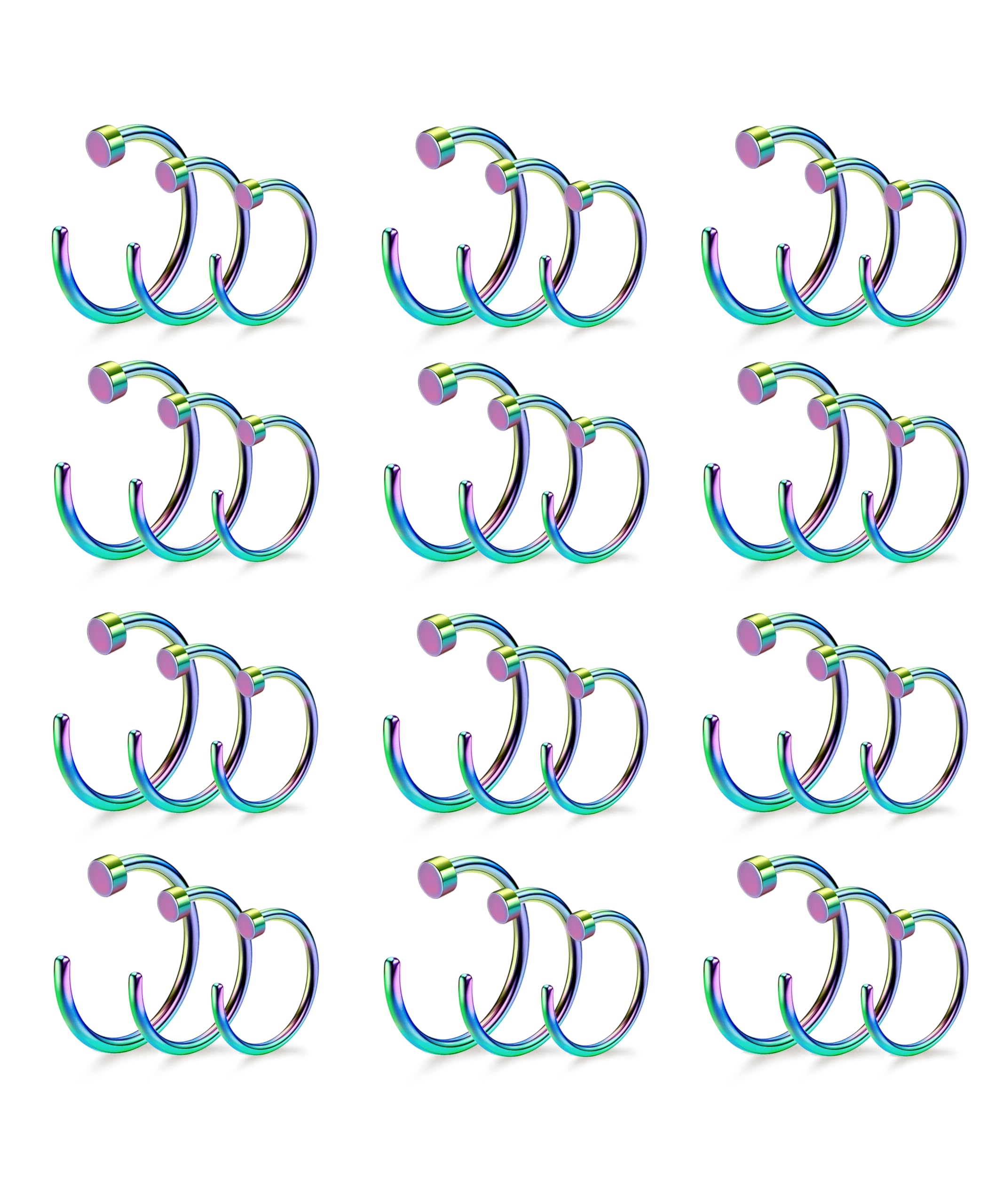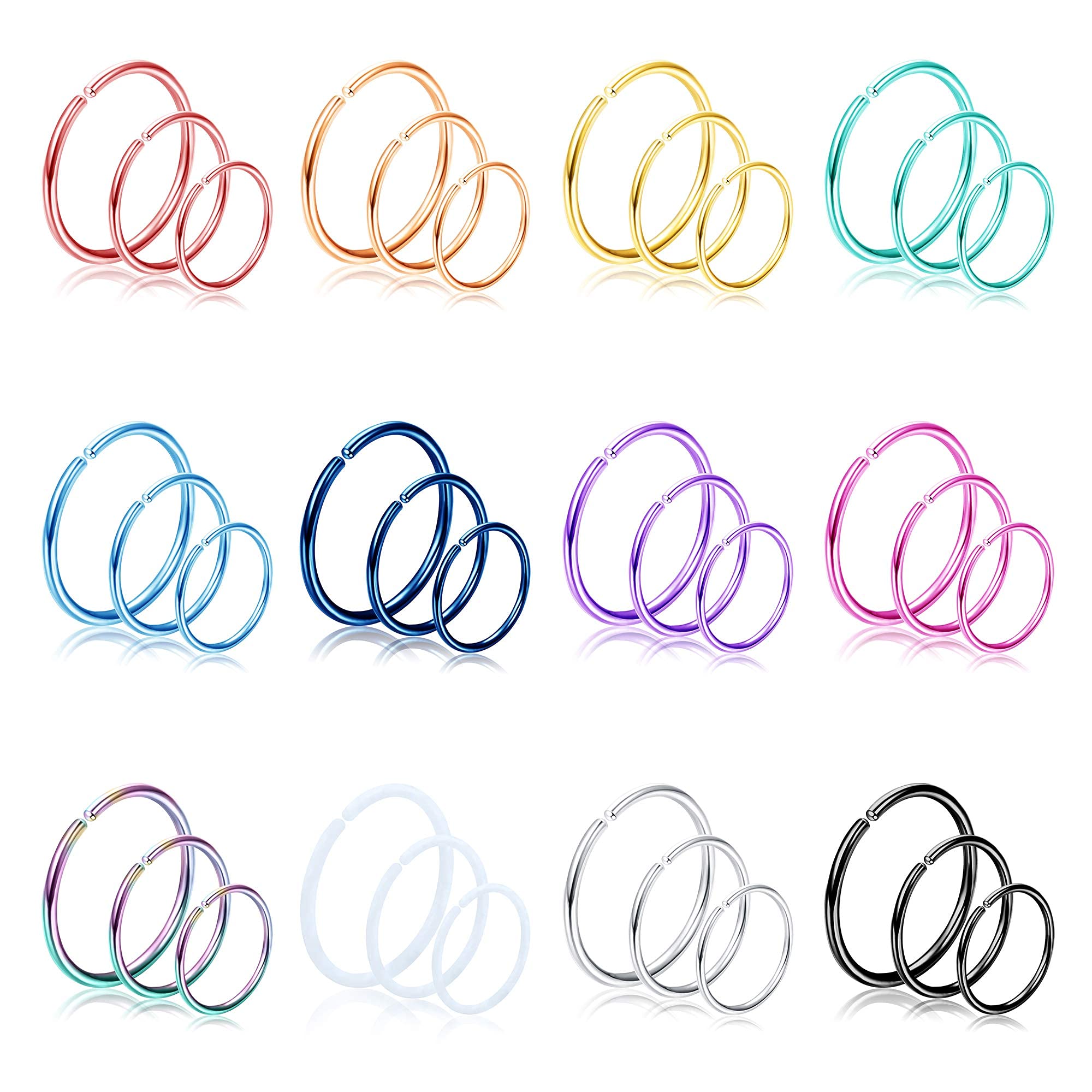 HOOP NOSE RINGS FOR WOMEN MEN: Hoop nose ring set comes with 36 pcs nose rings hoops in 12 different colors, affordable price, economical set. The most popular shape and style of hoop nose ring can match your dissimilar clothes and looks
