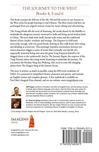 This book contains the full text of the 4th, 5th and 6th stories in our Journey to the West series for people learning to read Chinese. The three stories told here are unchanged from our original versions except for minor editing and reformatting. The Young Monk tells the story of Xuanzang, the monk chosen by the Buddha to undertake the dangerous journey westward to India and bring sacred wisdom back to China. The story deals with small, human-scale events and the traditional themes of love, loyalty, treachery and revenge. The Emperor in Hell starts innocently enough, with two good friends chatting as they walk home after eating and drinking at a local inn. This seemingly harmless conversation between two minor characters triggers a series of events that eventually cost the life of a supposedly immortal being and cause the great Tang Emperor himself to be dragged down to the underworld. And in The Journey Begins, the emperor of the Tang Dynasty selects the young monk Xuanzang to undertake the journey. He encounters the Monkey King Sun Wukong, who receives some life-changing advice from The Dragon King of the Eastern Ocean. The story is written, as much as possible, using the 600 word vocabulary of HSK3. It is presented in Simplified Chinese characters and pinyin, and includes an English version and complete glossary. A free audiobook is available on YouTube’s Imagin8 Press channel. A link to the audiobook can be found at www.imagin8press.com. ======================================= A GUIDE TO DIFFERENT FORMATS ======================================= This easy-to-read retelling of The Journey to the West is available in several different formats, depending on what you’re looking for. They are listed below. To find these on Amazon, use the Amazon search bar to search for the ISBN or ASIN listed after each one. You can also visit www.imagin8press.com to find the Amazon.com links for all the books listed here. In English only Paperback ISBN: 978-1959043379 (original edition) Paperback ISBN: 978-1959043546 (same as above, but with a more colorful cover) Kindle ASIN: B0C7PMZT28 and B0DGV55C6X In Simplified Chinese only Paperback ISBN: 978-1959043102 Audiobook ASIN: B0BRTC13WQ In Simplified Chinese, pinyin and English Oversized hardcover ISBN: 978-1959043638 Kindle ASIN: B0BMTPLD4P A series of 31 individual books in Simplified Chinese, pinyin and English Paperback and kindle: www.amazon.com/dp/B08JCQ44YG A series of 31 individual books in Traditional Chinese, pinyin and English Paperback and kindle: www.amazon.com/dp/B08MVC57VZ A series of 11 compilations in Simplified Chinese, pinyin and English each compilation contains 2 or 3 individual books Paperback: www.amazon.com/dp/B08JCQ44YG, scroll to the bottom and click "show all"