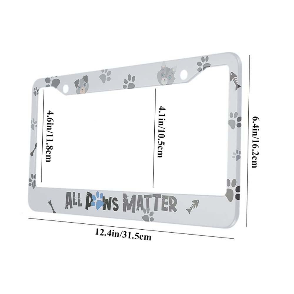 Our All Paws Matter Aluminum Alloy License Plate Frame Cat Dog Lovers Blue Grey Cute Pawprints Fish Bones Applicable to US Standard Car Metal Car Tag Frame(1 PACK) We fab these License plate frames out of an outdoor durable aluminum alloy composite material, to protect the image from fading and protect the image from road debris, extending the life of the graphic Durable aluminum frame with aluminum coating. This license plate holder is the perfect accessory for your vehicle. Please check the product image for frame size. Please measure your license plate to make sure the upper or bottom lip of the frame won't cover the state name. Specifications: Frame size: 12.4" X 6.4" Frame material: thin aluminum sheet metal Package Includes: 1 x License Plate Frame Tips: Sold individually (not a pair). Get one for the front and back of your vehicle. After-sales Service: If you have any questions, please contact us through our shop. We will reply within 24 hours.