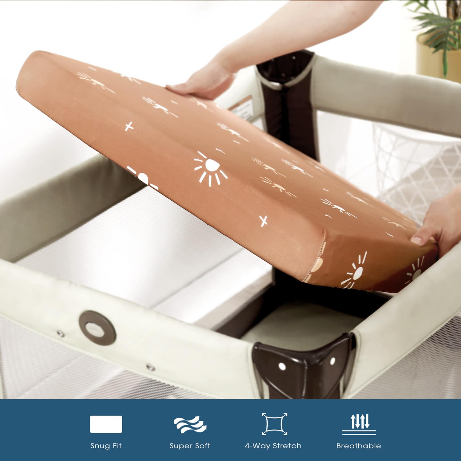 Universal Fit – Measuring 38" x 24" x 6". Our mini baby crib sheets come with an elastic band all around the sides to securely fit all standard pack n play mattresses. They are very easy to put in place even when you need to change pack n play mattresses sheets in a hurry. Perfect as a baby shower gift or for your own nursery.