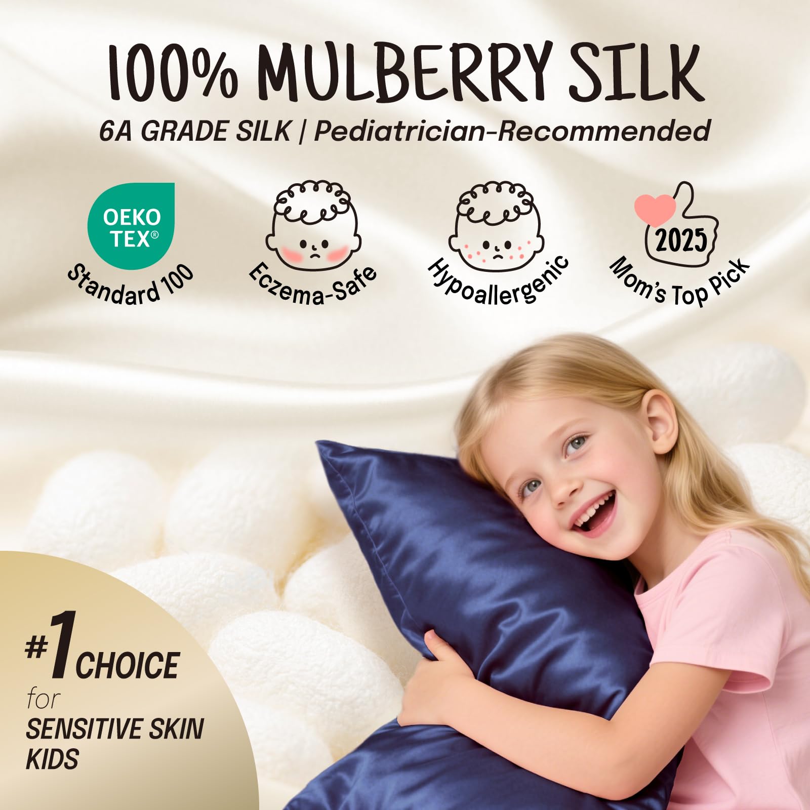 Natural Mulberry Silk·Skin-Friendly and Soft: Crafted with 100% 19MM premium mulberry silk, this pillowcase features a smooth, cloud-soft texture. Gentle on kids’ delicate skin, it wraps them in cozy comfort for restful sleep every night.