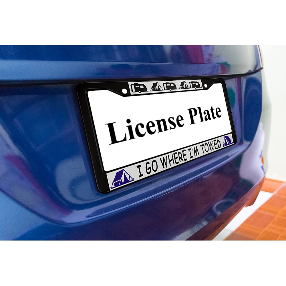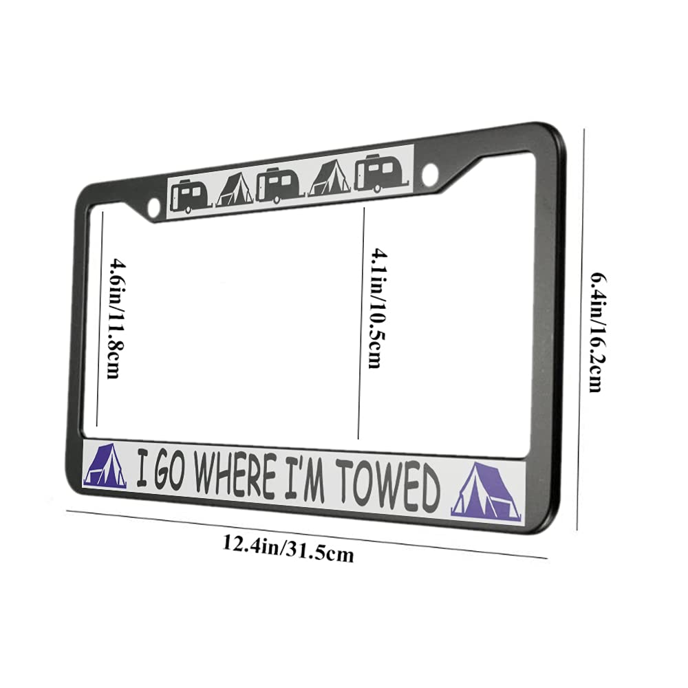 Our I Go Where I'M Towed Aluminum Alloy License Plate Frame Black Camper Vans Blue Tent Applicable to US Standard Car Metal Car Tag Frame(1 PACK) We fab these License plate frames out of an outdoor durable aluminum alloy composite material, to protect the image from fading and protect the image from road debris, extending the life of the graphic Durable aluminum frame with aluminum coating. This license plate holder is the perfect accessory for your vehicle. Please check the product image for frame size. Please measure your license plate to make sure the upper or bottom lip of the frame won't cover the state name. Specifications: Frame size: 12.4" X 6.4" Frame material: thin aluminum sheet metal Package Includes: 1 x License Plate Frame Tips: Sold individually (not a pair). Get one for the front and back of your vehicle. After-sales Service: If you have any questions, please contact us through our shop. We will reply within 24 hours.