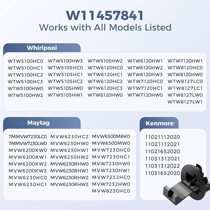 This part (# W11457841 W11091027 Washer Lid Strike) works with all models listed (Search your refrigerator model using "CTRL+F") Whirlpool WTW500CMW0, WTW5100HC0, WTW5100HC1, WTW5100HC2, WTW5100HC3, WTW5100HW0, WTW5100HW2, WTW5100HW3, WTW5105HC0, WTW5105HC1, WTW5105HC2, WTW5105HW0, WTW5105HW1, WTW5105HW2, WTW6120HC0, WTW6120HC1, WTW6120HC2, WTW6120HC3, WTW6120HW0, WTW6120HW1, WTW6120HW2, WTW6120HW3, WTW7120HC0, WTW7120HC1, WTW7120HW0, WTW7120HW1, WTW8120HC0, WTW8120HW0, WTW8127LC0, WTW8127LC1, WTW8127LW0, WTW8127LW1 Maytag MVW6200KW0, MVW6200KW1, MVW6200KW2, MVW6200KW3, MVW6230HC0, MVW6230HC1, MVW6230HC2, MVW6230HW0, MVW6230HW1, MVW6230HW2, MVW6230RHW0, MVW6230RHW1, MVW6230RHW2, MVW6230RHW3, MVW6500MBK0, MVW6500MW0, MVW7230HC0, MVW7230HC1, MVW7230HW0, MVW7230HW1, MVW7232HC0, MVW7232HW0, MVW8230HC0, 7MMVW7230LC0, 7MMVW7230LW0 Kenmore 11021112020, 11021112021, 11021652020, 11031312021, 11031312022, 11031652020