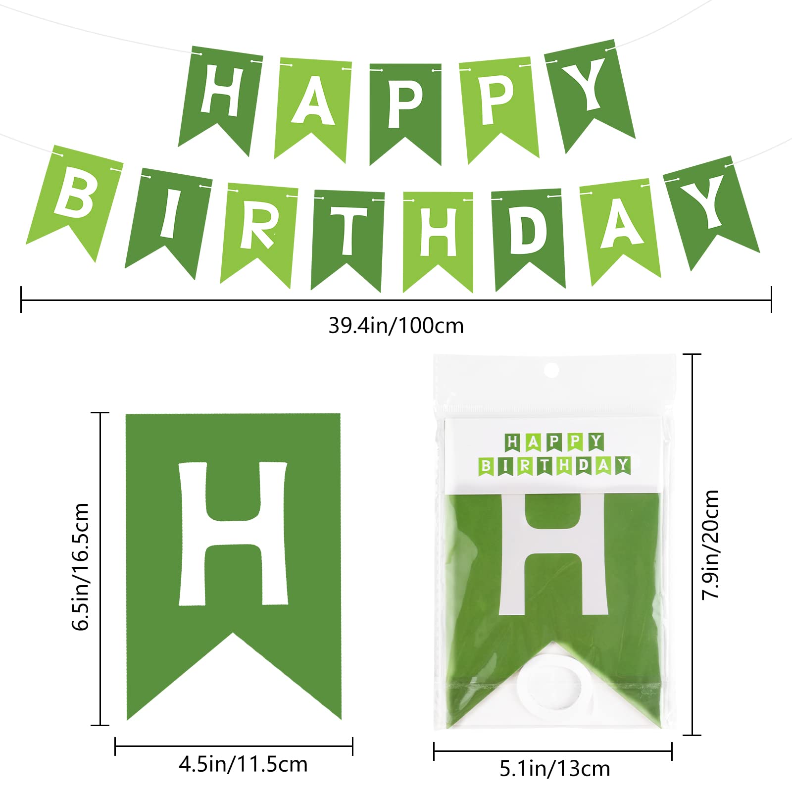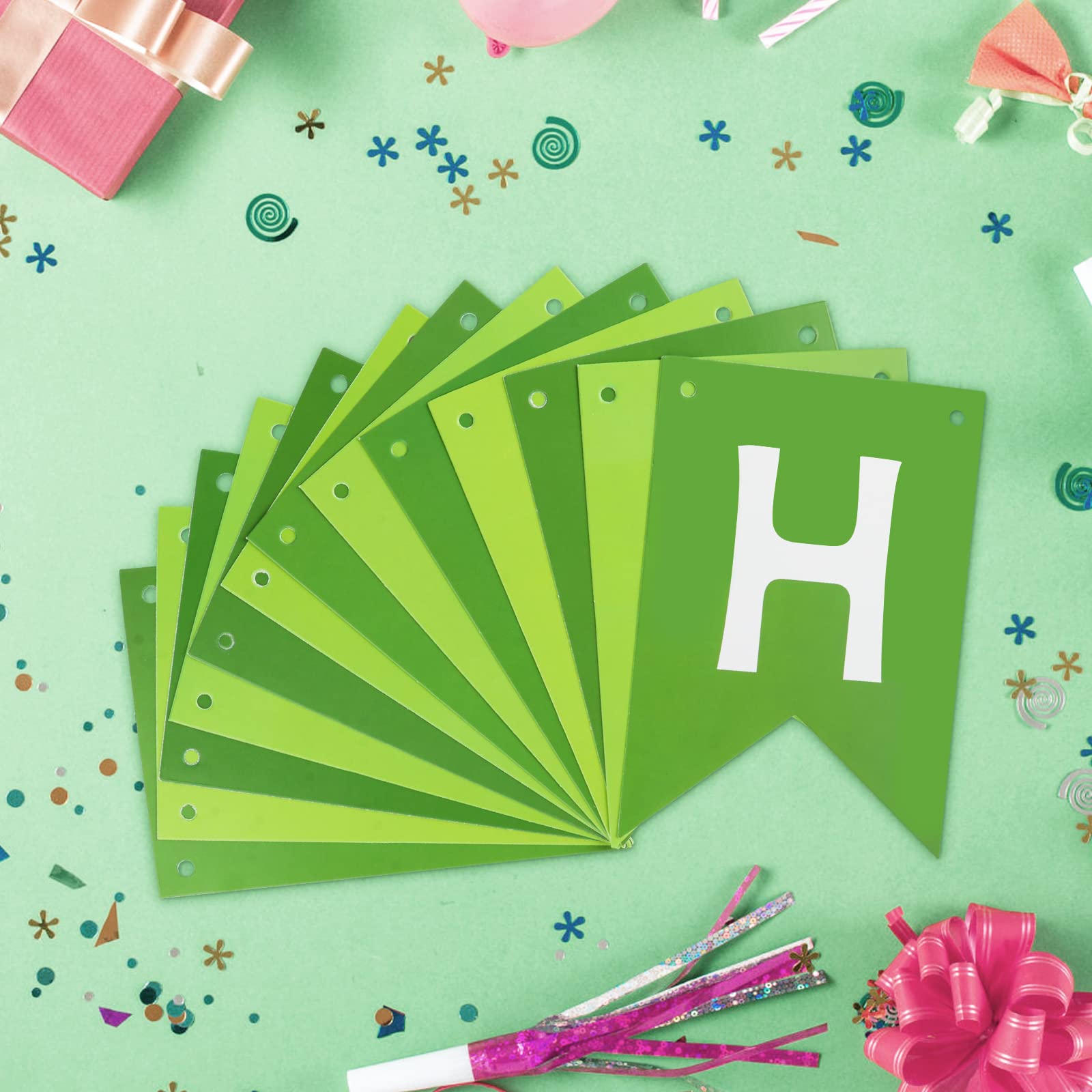 EASY-TO-MAKE: Each green banner flag card size is 4.5" × 6.3". 13 paper flags that spell the phrase "HAPPY BIRTHDAY" on 1 roll strand (length 16.4ft). You can use a plastic needle with the ribbon to easily string all the letters together without effort, the spacing between the flags is adjustable. You can move the triangle flags to have a different look.