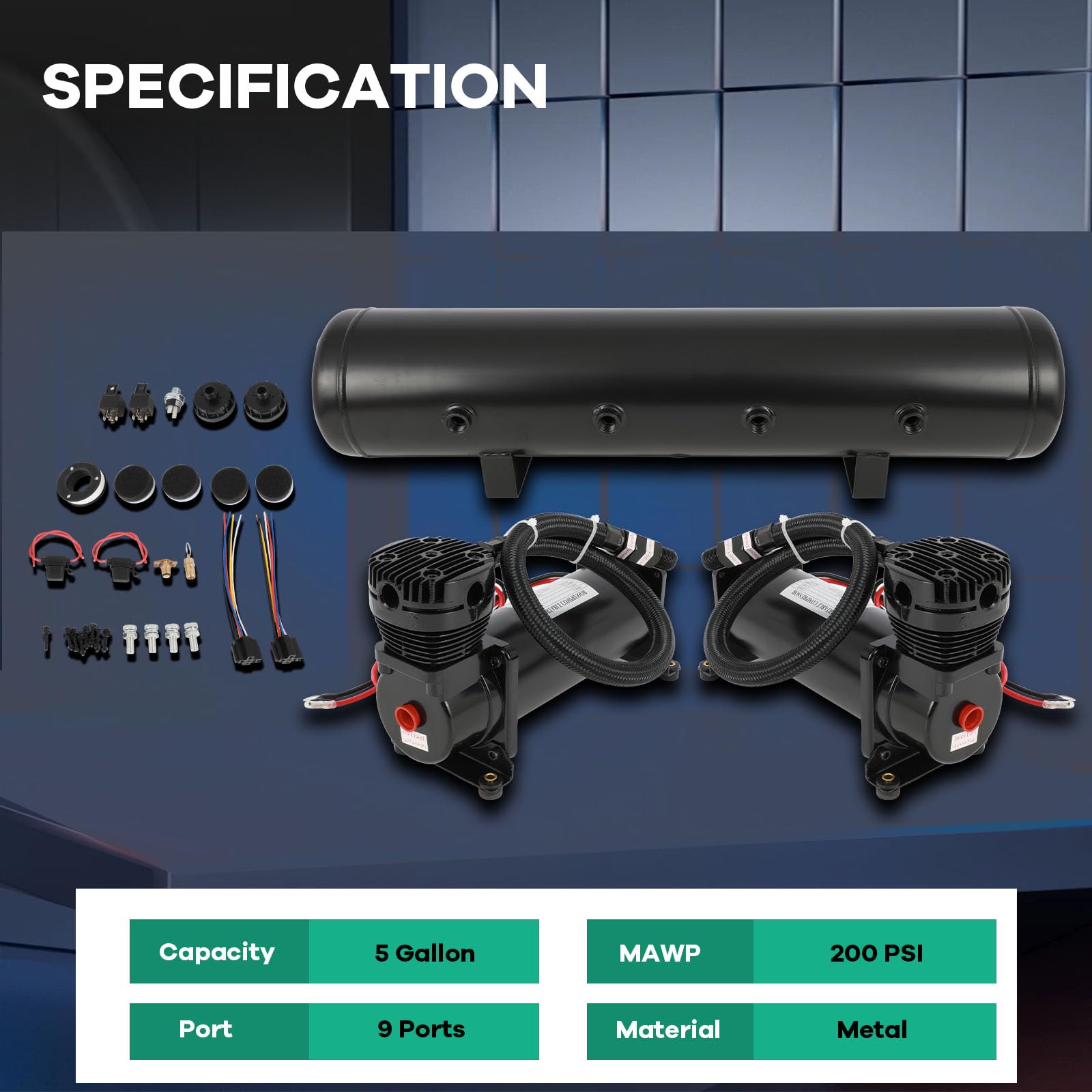 Package Includes: 2 x Black Compressors 2 x 22" Long Black Stainless Steel Braided 3/8"" Leader Hoses 2 x 3/8""NPT Check Valves 2 x 40 Amp Premium Relays 1 x 165 psi (on) / 200 psi (off) Pressure Switch 1 x 5 Gallon Steel 9 Port Air Tank (Black Gloss Powder Coat)