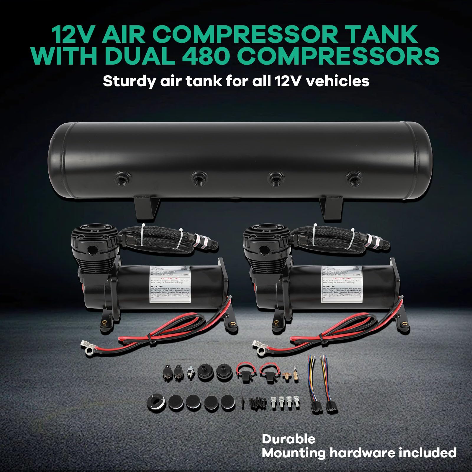 Includes: Dual 12 volt air compressors, Tanks, Leader Hoses, Check Valves, Relays, Pressure Switch and Mounting Hardware Included.