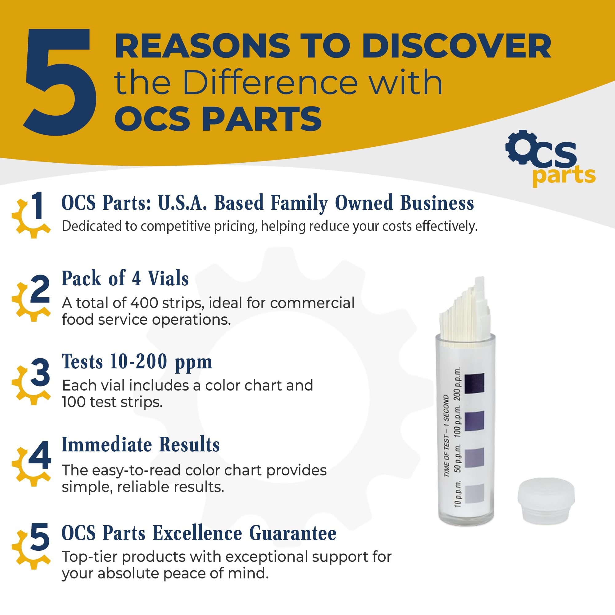 Our chlorine test strips are a cost effective way to measure the concentration of free available chlorine in sanitizing solutions. The strips are simple to use and produce reliable results. Each strip measures concentrations between 10-200 ppm (parts per million), with color matches at 10, 50, 100 and 200 ppm. Each vial contains 100 strips and this pack includes 4 vials for a total of 400 strips.
