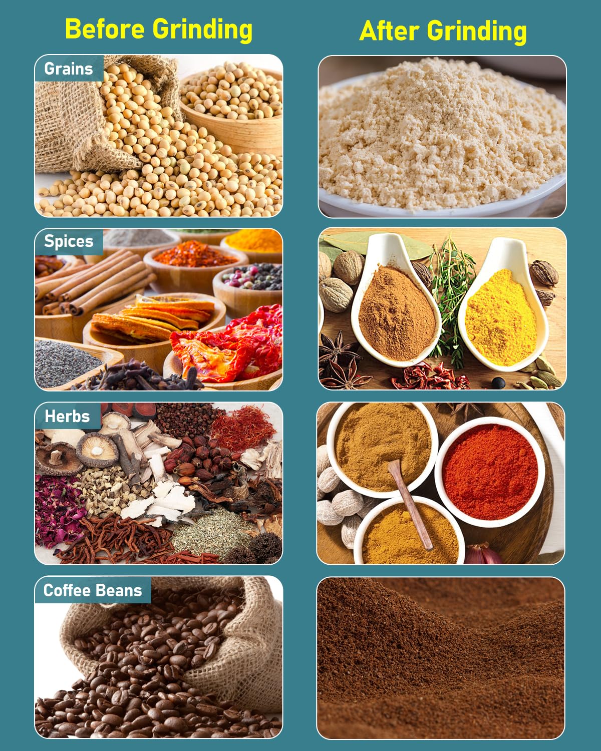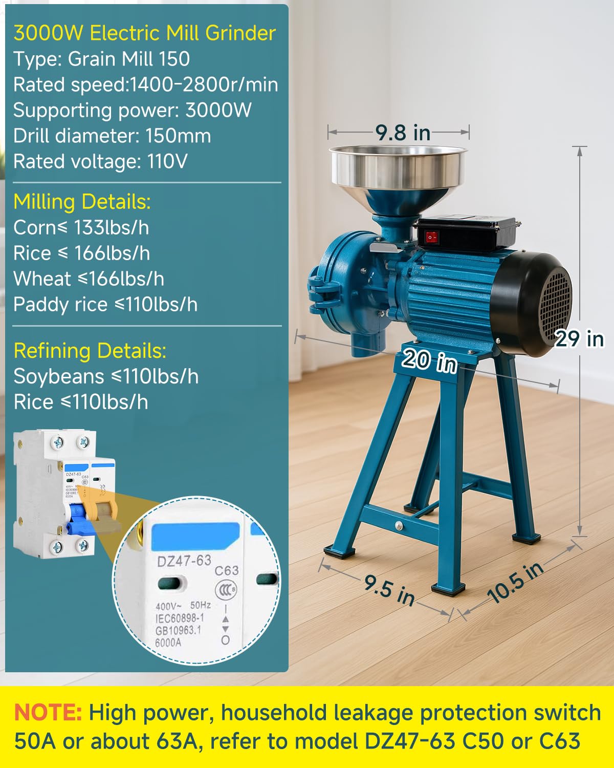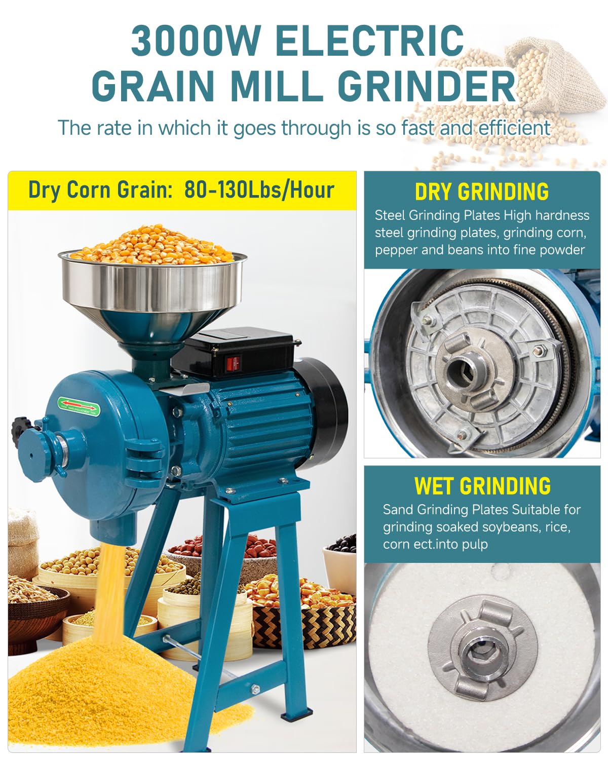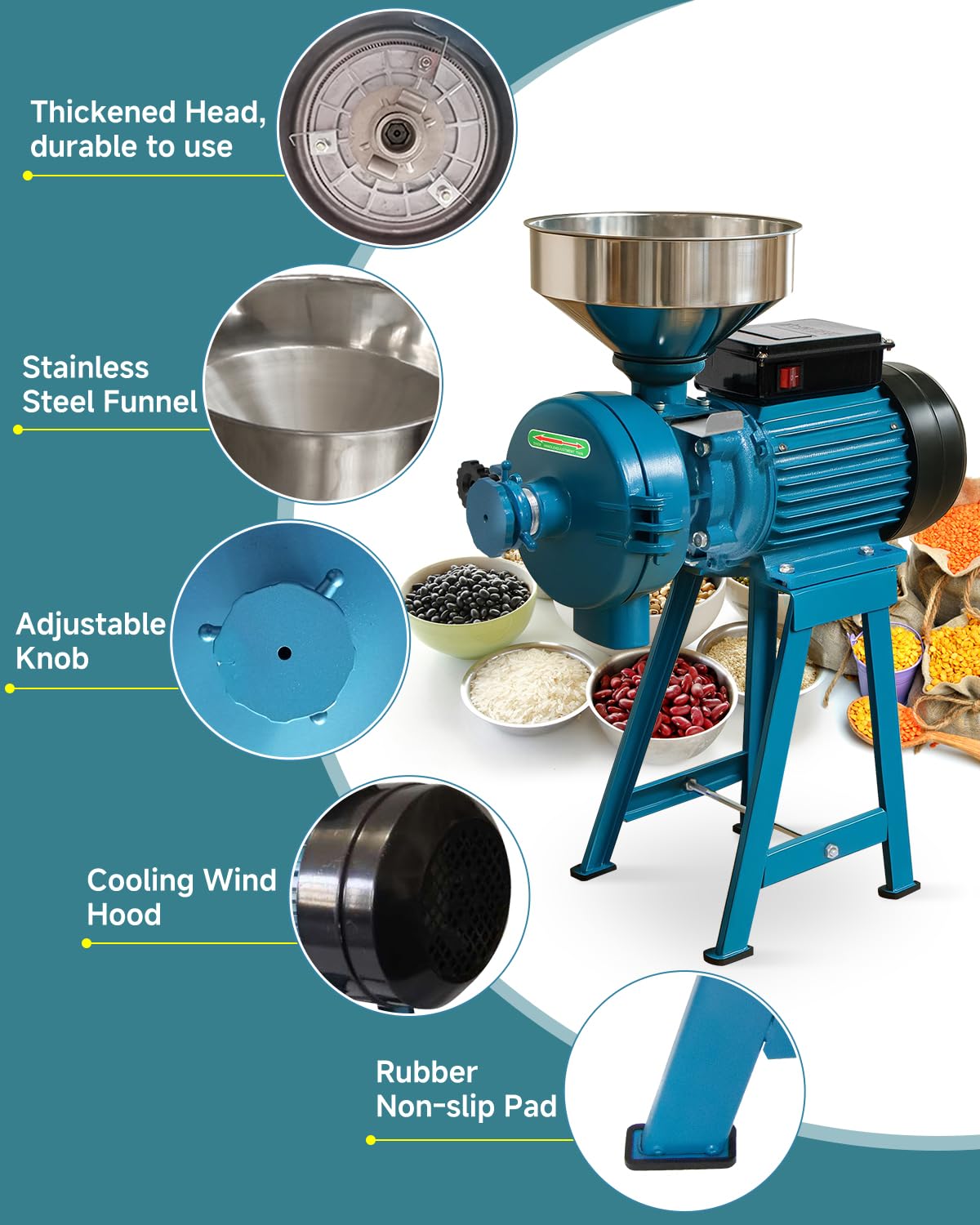 Powerful 3000W Motor β Fast & Efficient Grinding: Grind more in less time! This heavy-duty grain mill features a robust 3000W motor and high-speed operation (up to 2800 RPM), making it ideal for commercial or home use. Easily process corn, rice, wheat, and more into ultra-fine powder in minutes