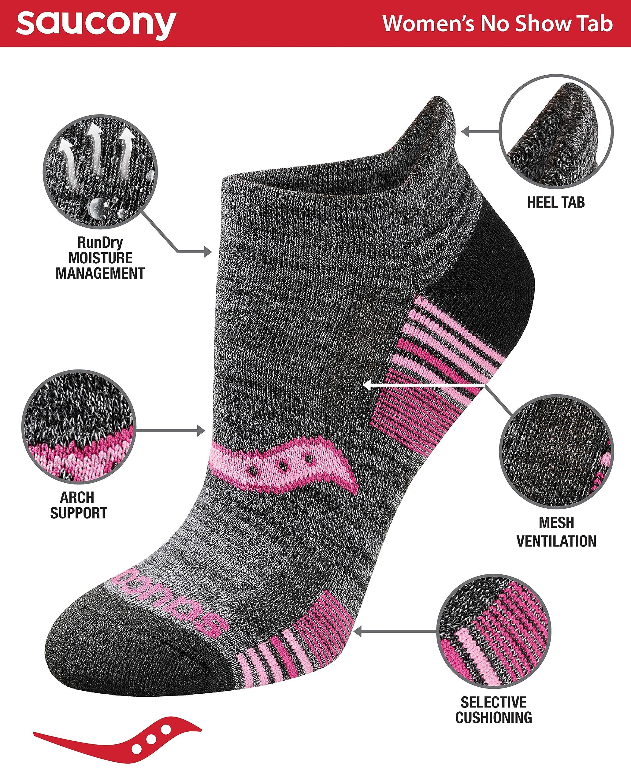 Description Saucony Women's Performance Heel Tab Athletic socks are a perfect combination of comfort and support. Great for the toughest training sessions. Features include heel tab design for added protection and comfort, RunDry moisture management to keep feet dry, arch support for an improved and secure fit, Mesh ventilation that enhances breathability and comfort, targeted zone cushioning in high impact areas for added comfort, and comfort toe seam for reduced irration.