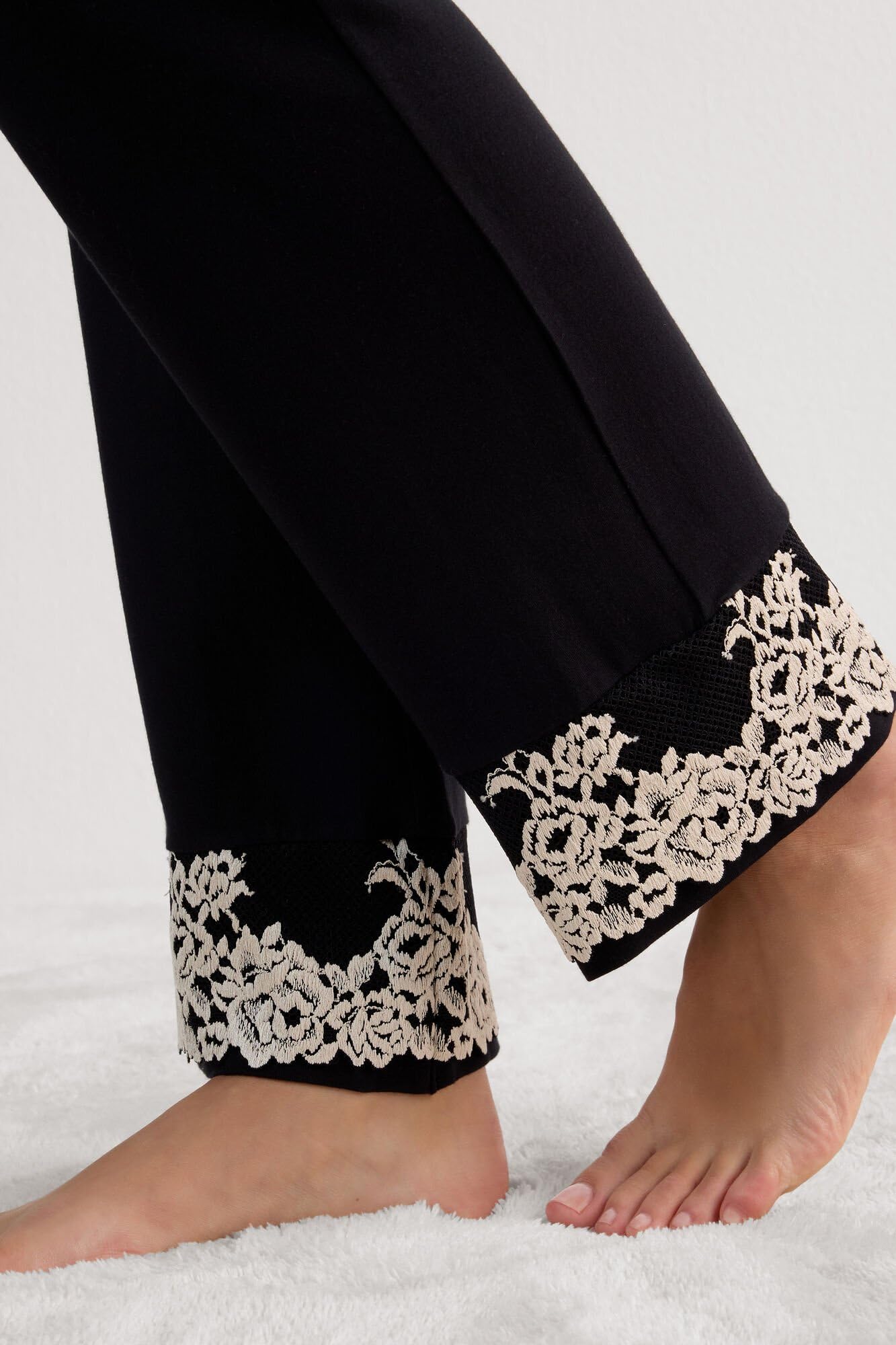 Description Full length modal pants with two-tone lace ruffle at hem. Regular fit. The model is 5’ 9” (175 cm) tall and is wearing a size S. This garment is made of a plant-based fabric derived from sustainable and renewable wood sources.